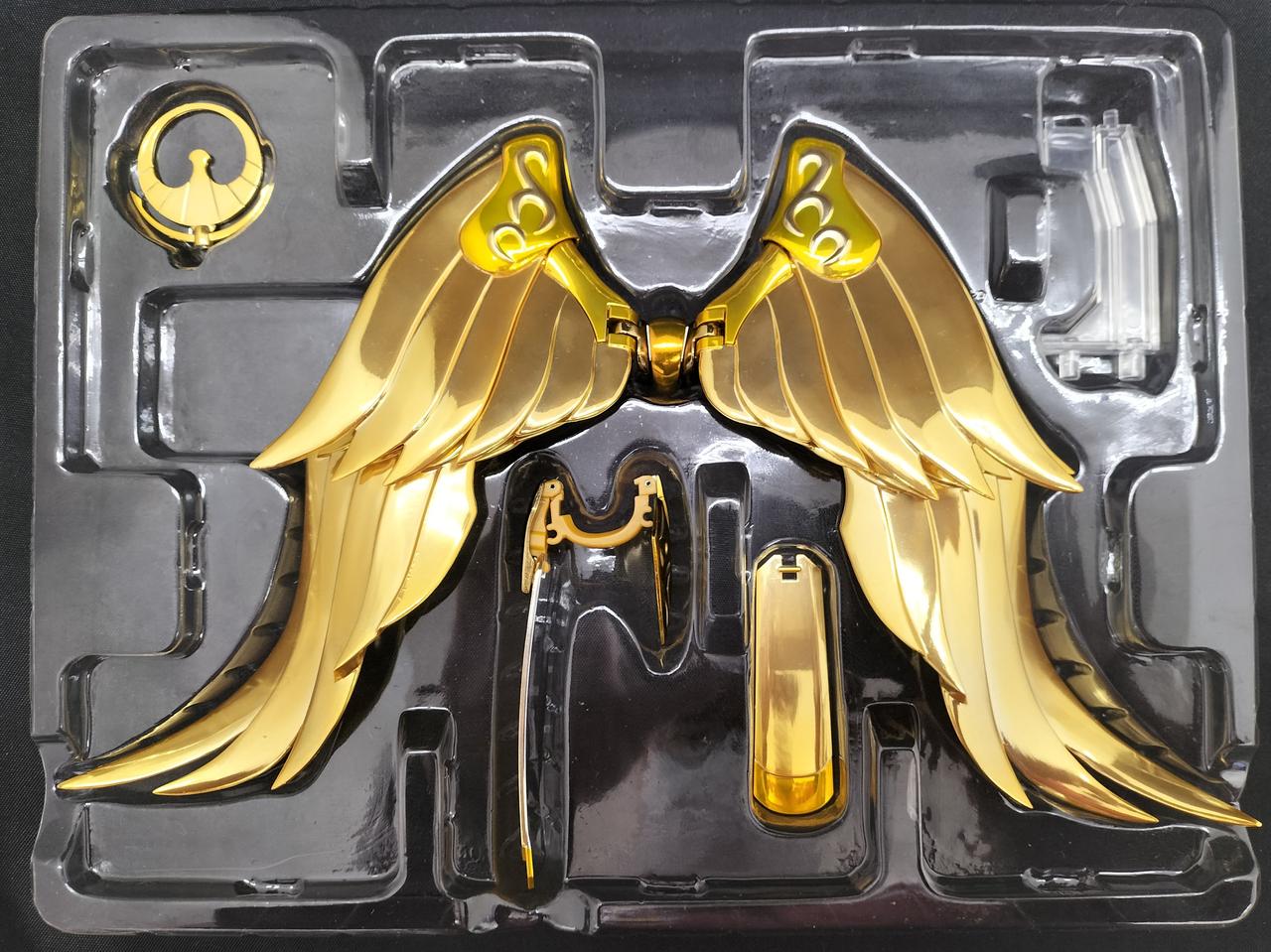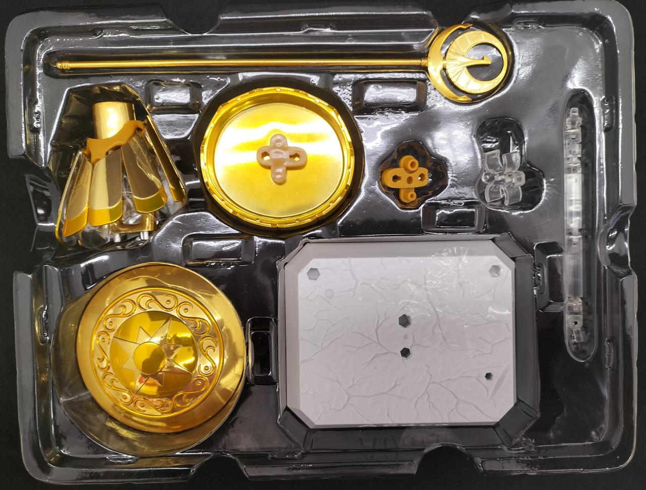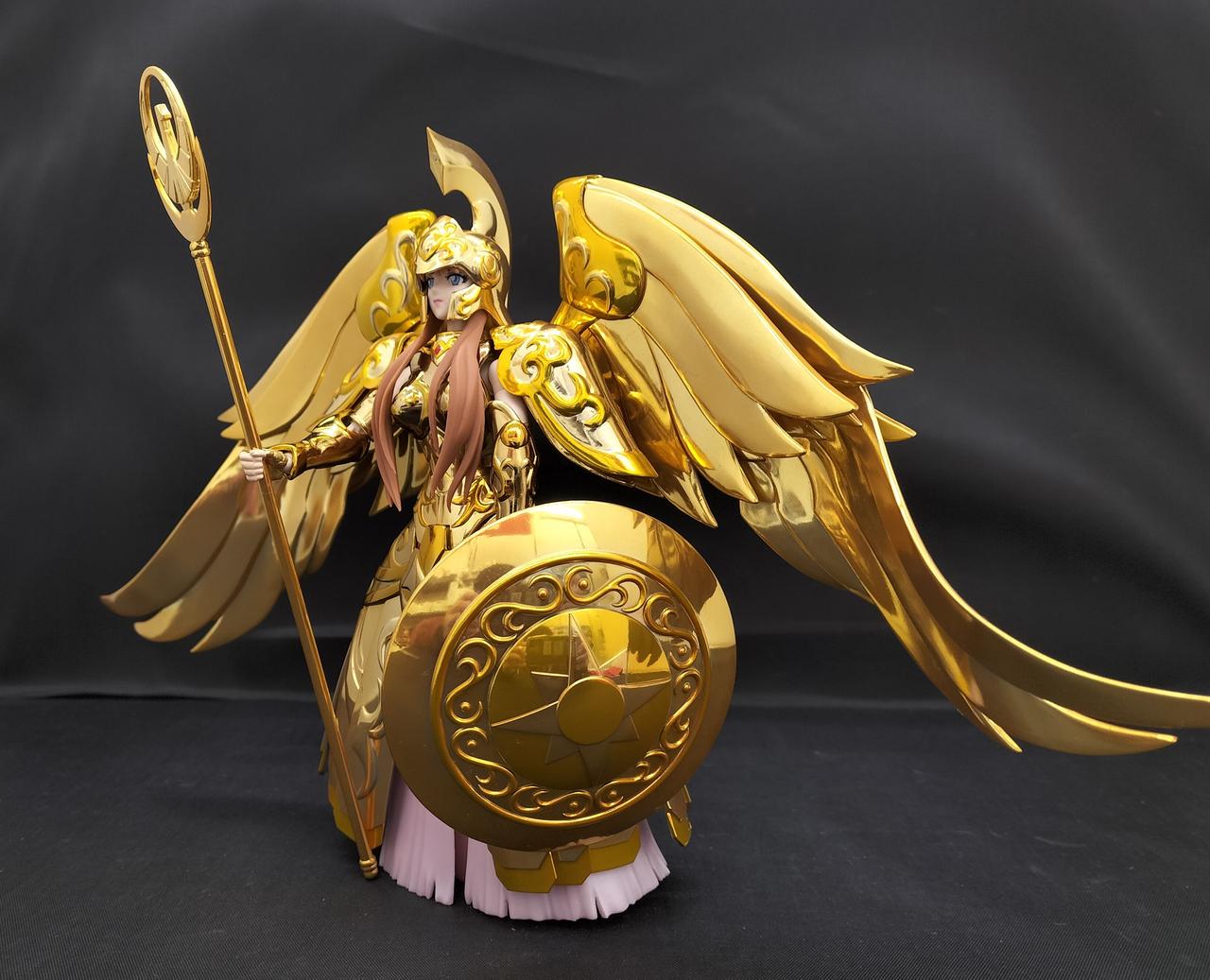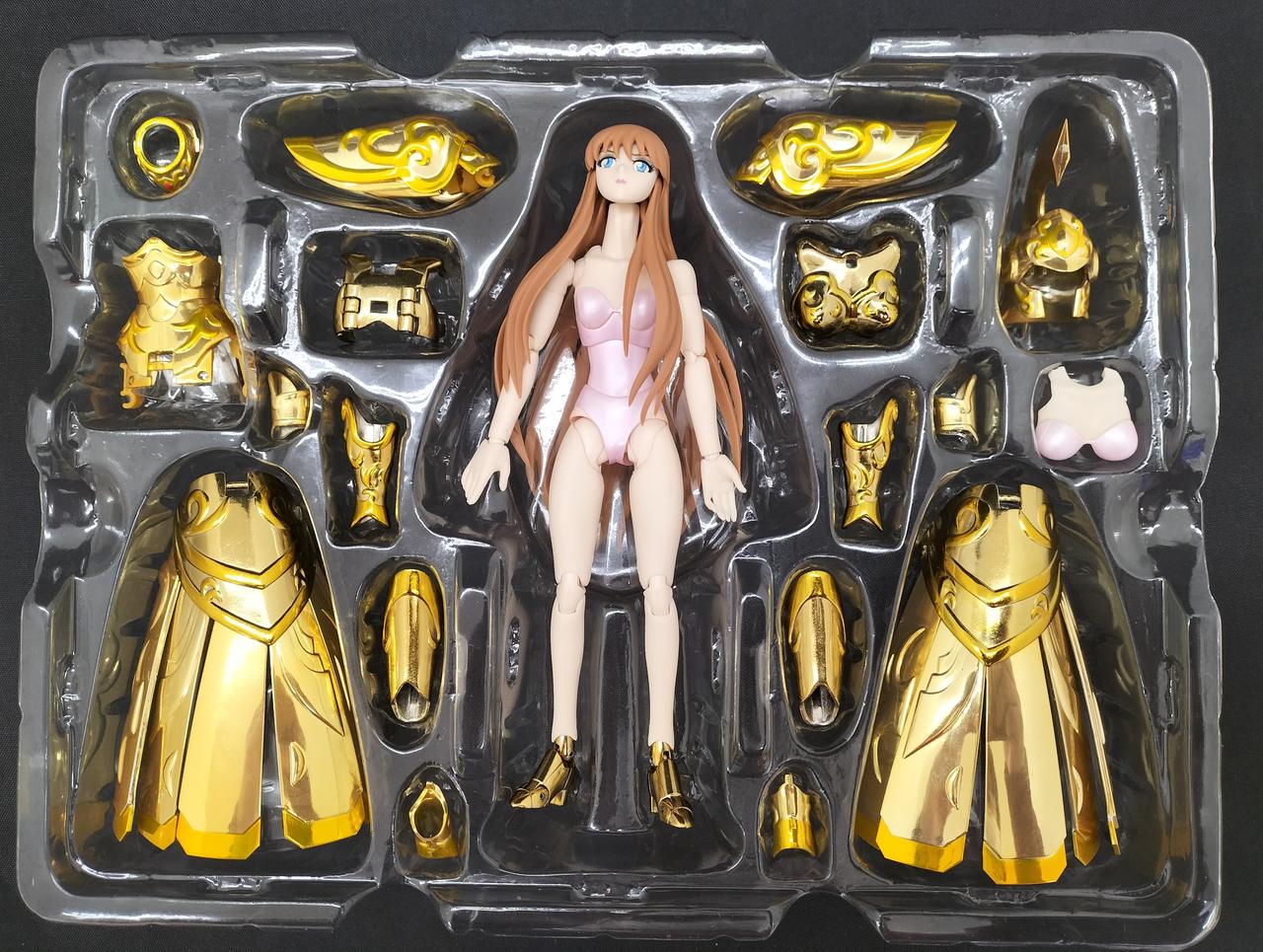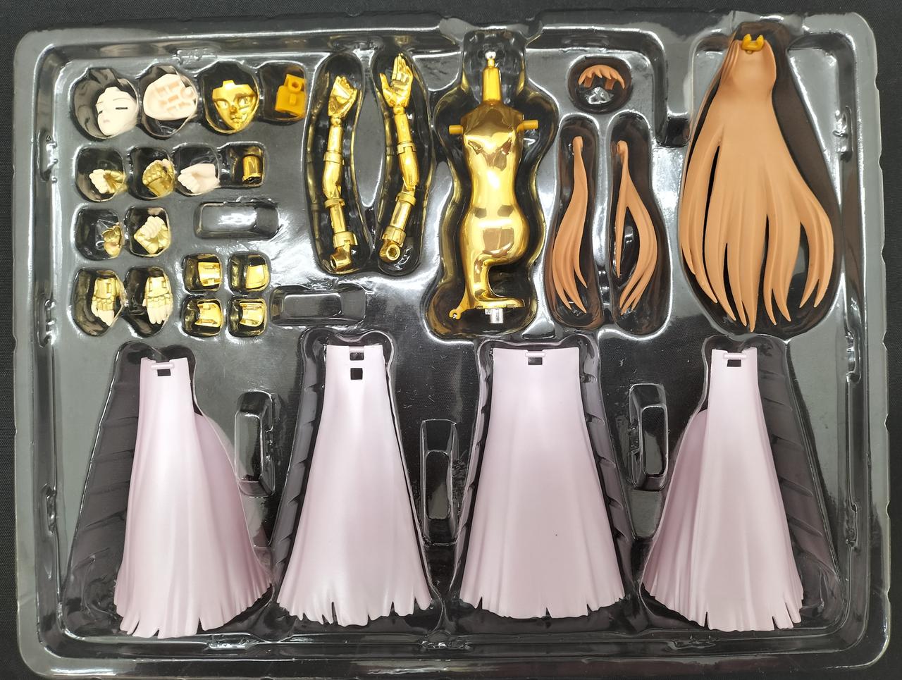 セット内容:フィギュア本体、交換用表情パーツ2種、交換用手首×7(右4、左3)、交換用胸部、差し替え用髪パーツ×4、スカート(4パーツ)、聖衣一式(共通24点、原作イメージ版11点、アニメ版11点/計46点)、錫杖(3パーツ)、盾、盾用ジョイント、翼、ステージ用ジョイントパーツ、オブジェスタンドジョイント、オブジェフレーム一式(11点)、専用台座(台座、アーム、盾用支柱)、説明書 |