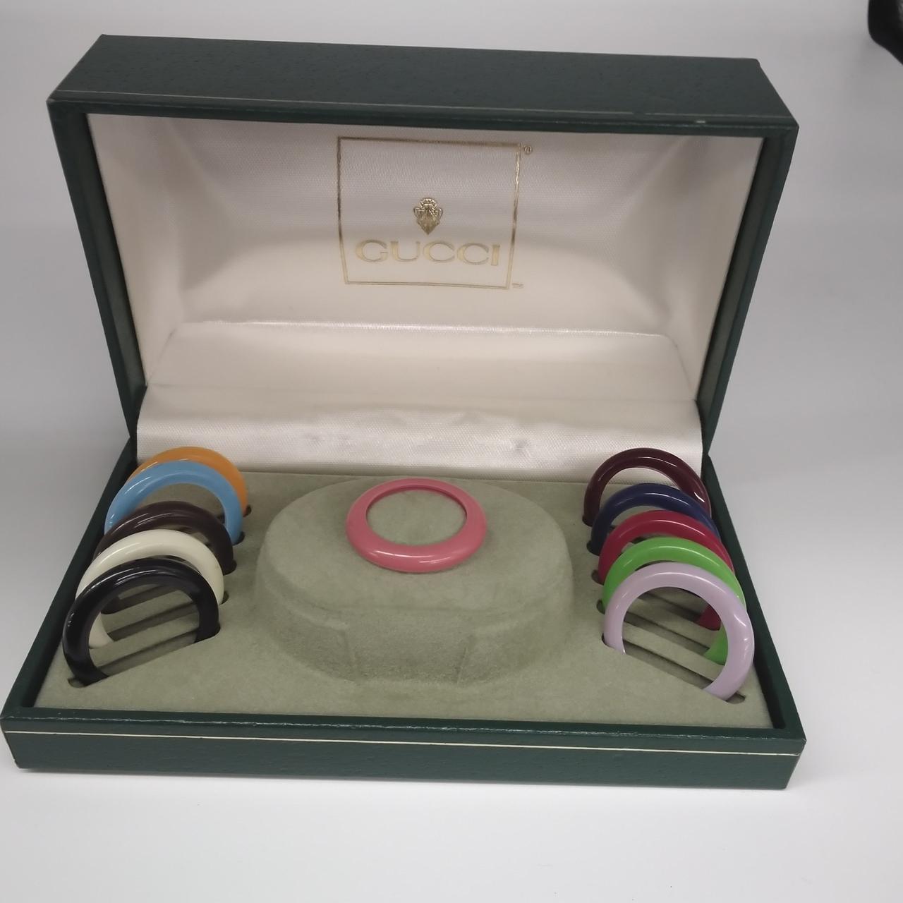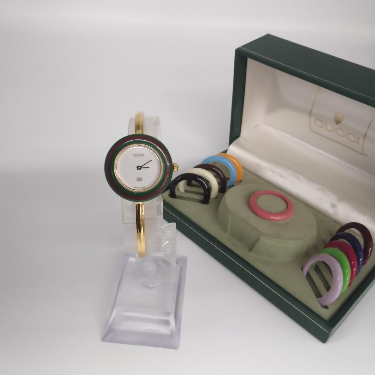 GUCCI(グッチ)の「チェンジベゼル 12色」は、1980〜90年代に流行した人気のヴィンテージ腕時計(主にRef.11/12.2)です。気分や服に合わせて12色のベゼル(リング)を簡単に回して交換でき、バングル型のデザインが特徴の人気のアイテムです。 |