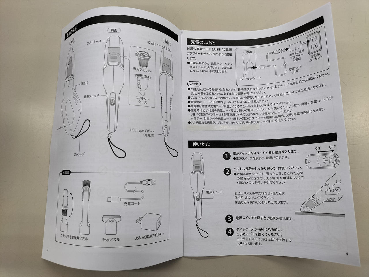 液体や食べこぼしも吸引でき、USBで充電できます。 |