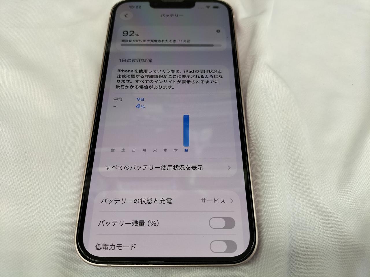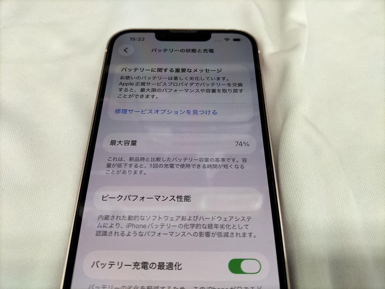 バッテリー最大容量74%でサービス表示の為ジャンクとなっております。 |
