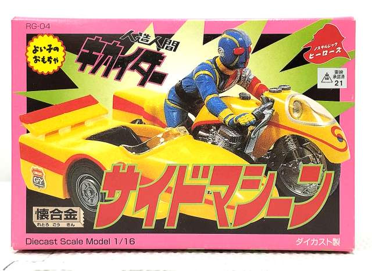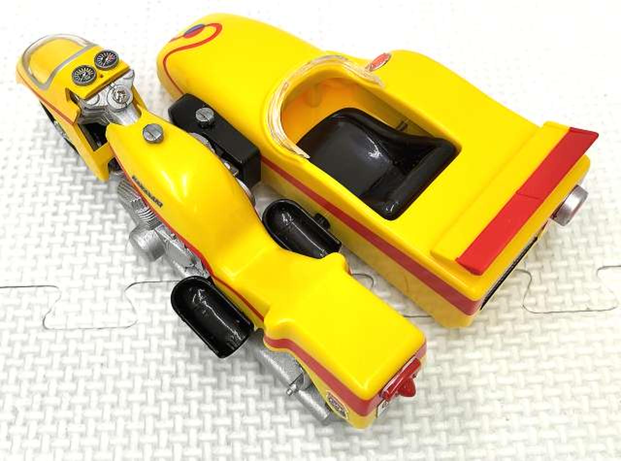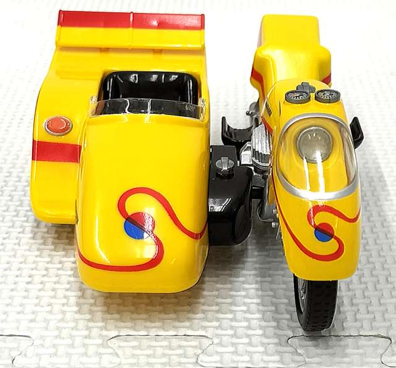 レトロな造形で再現した、合金製のサイドマシーンです。セット内のキカイダーを乗せることができます。タイヤは回転するので手転がしで遊ぶことが可能。また、前輪部分の向きを変えることができるので方向転換する事も可能。 |