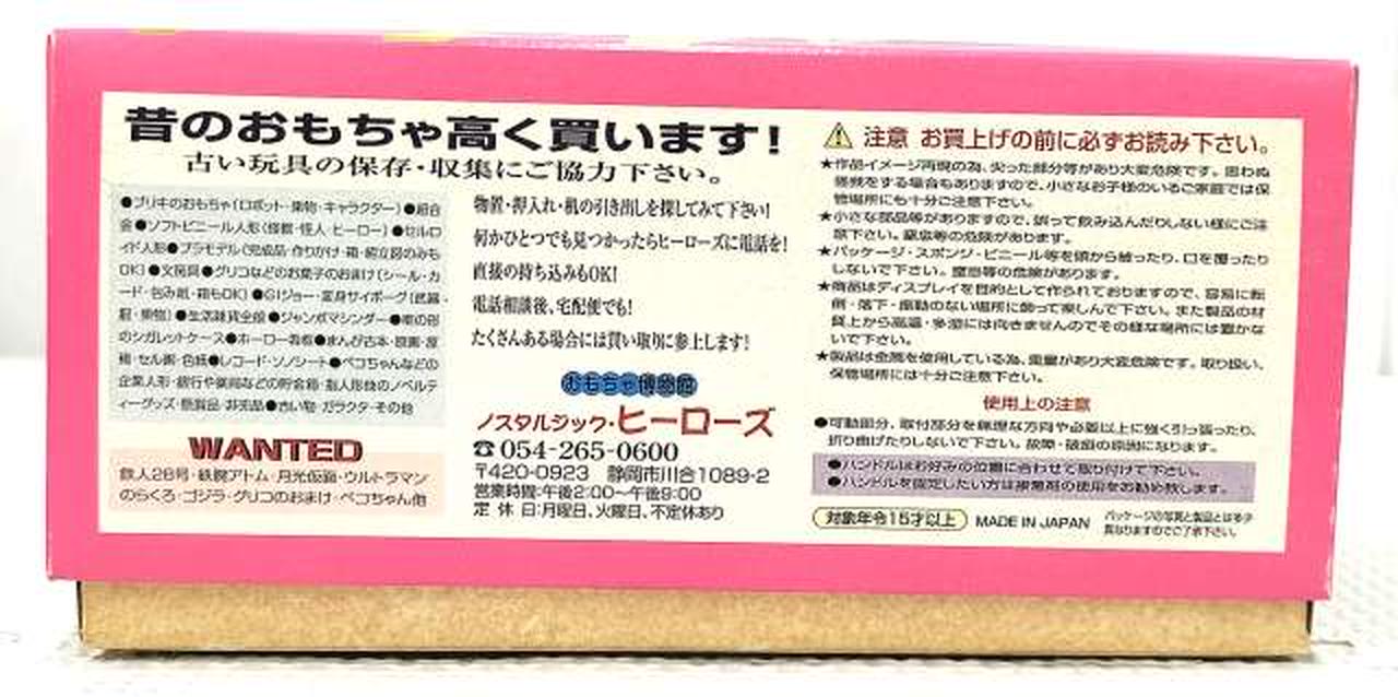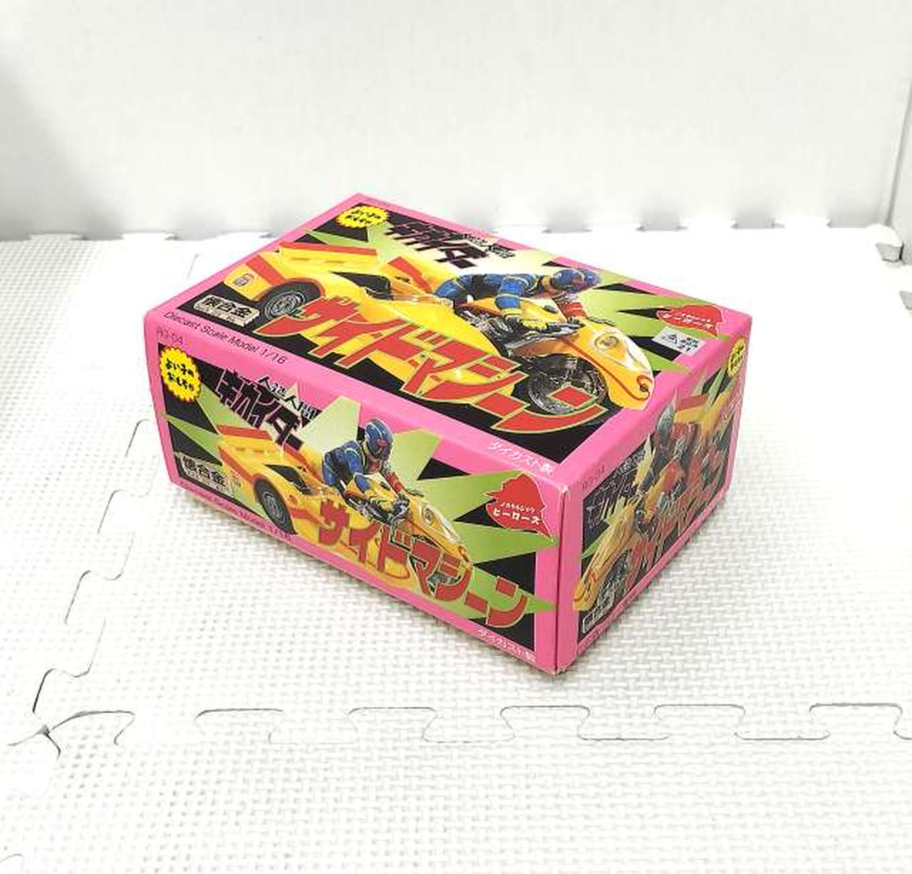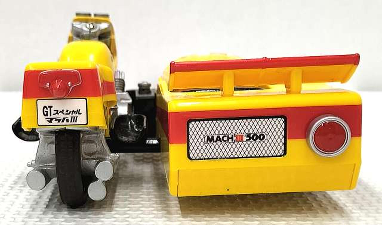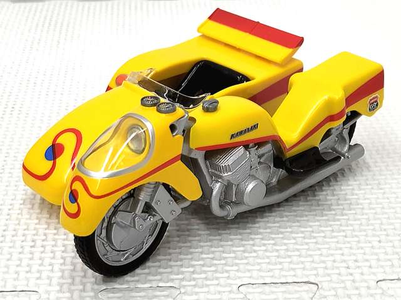 レトロな造形で再現した、合金製のサイドマシーンです。セット内のキカイダーを乗せることができます。タイヤは回転するので手転がしで遊ぶことが可能。また、前輪部分の向きを変えることができるので方向転換する事も可能。 |