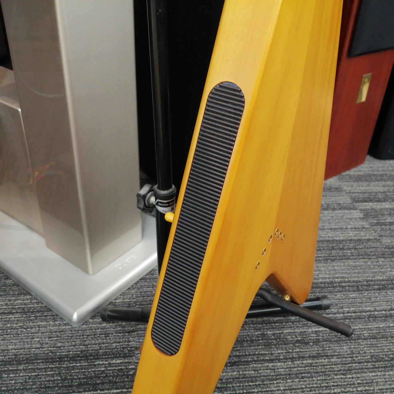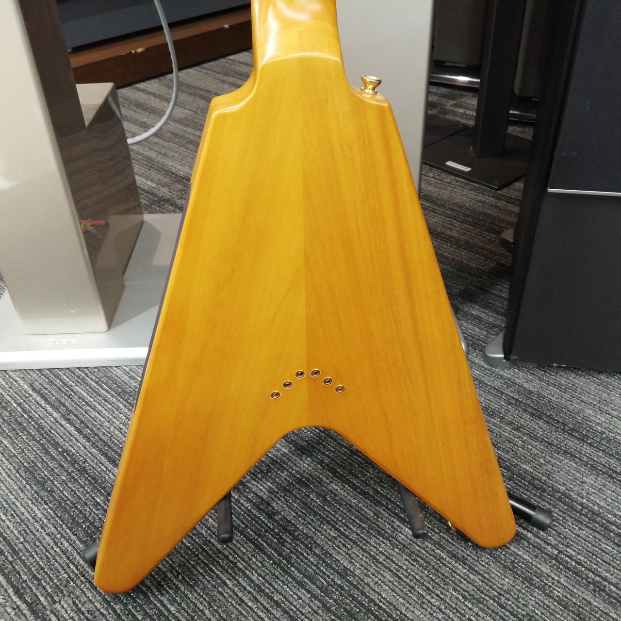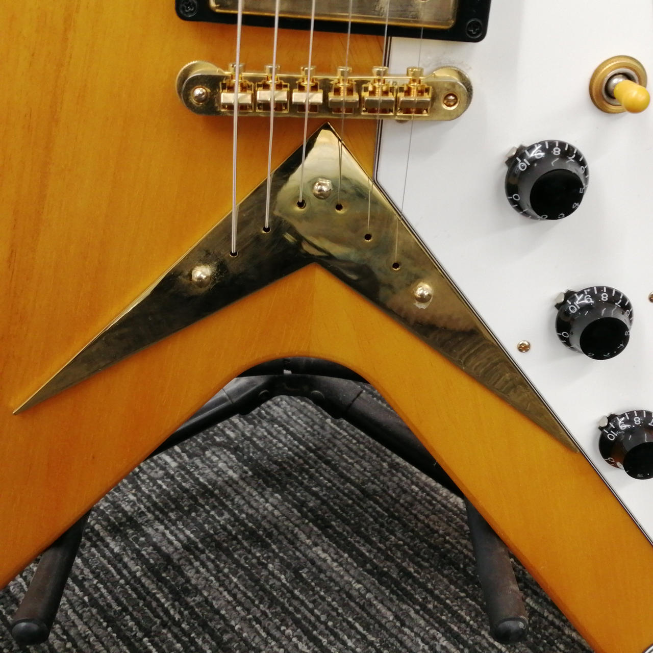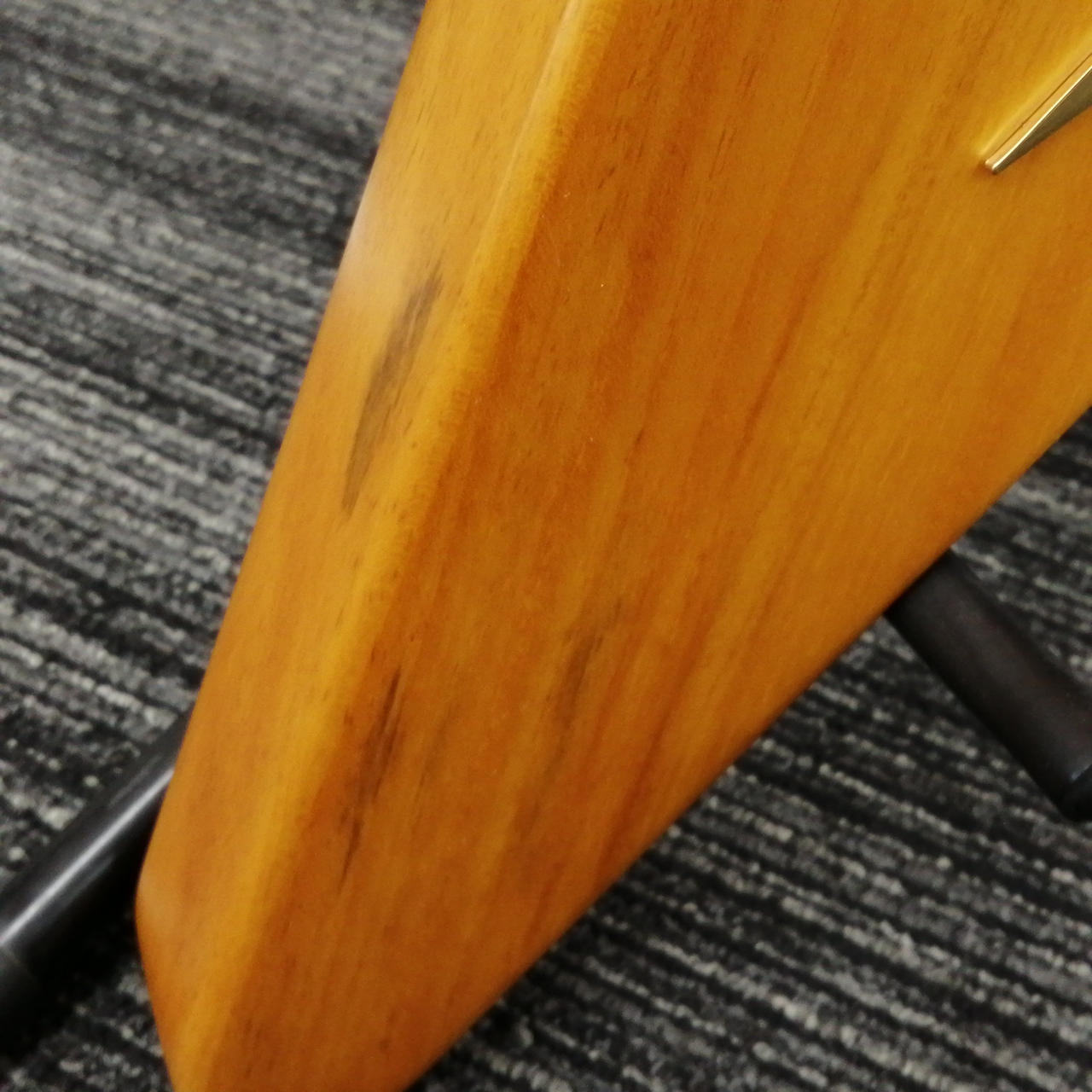 ボディやネックにコリーナ材を使用している点だけではなく、ボディ材の木取りはV字、さらにヘッド部のレイズド・ロゴやブラス製でV字型のストリング・プレートの搭載 |