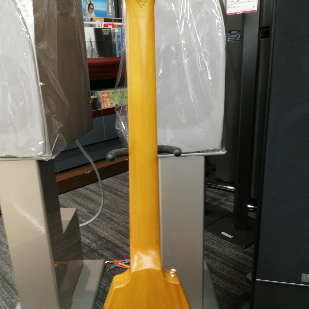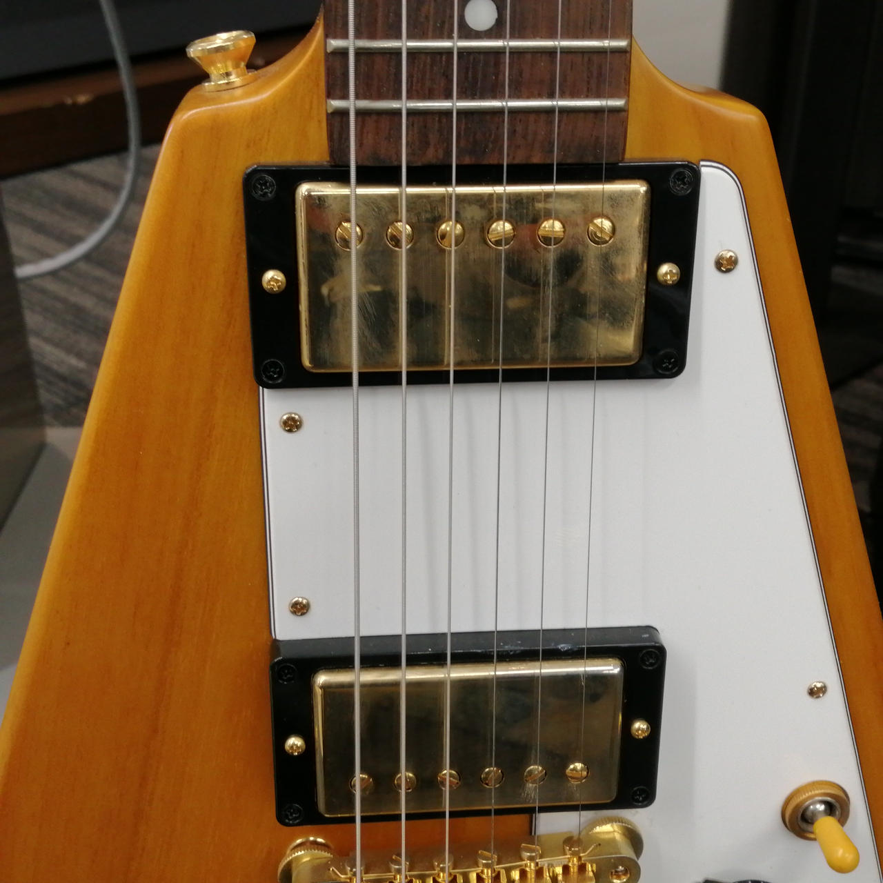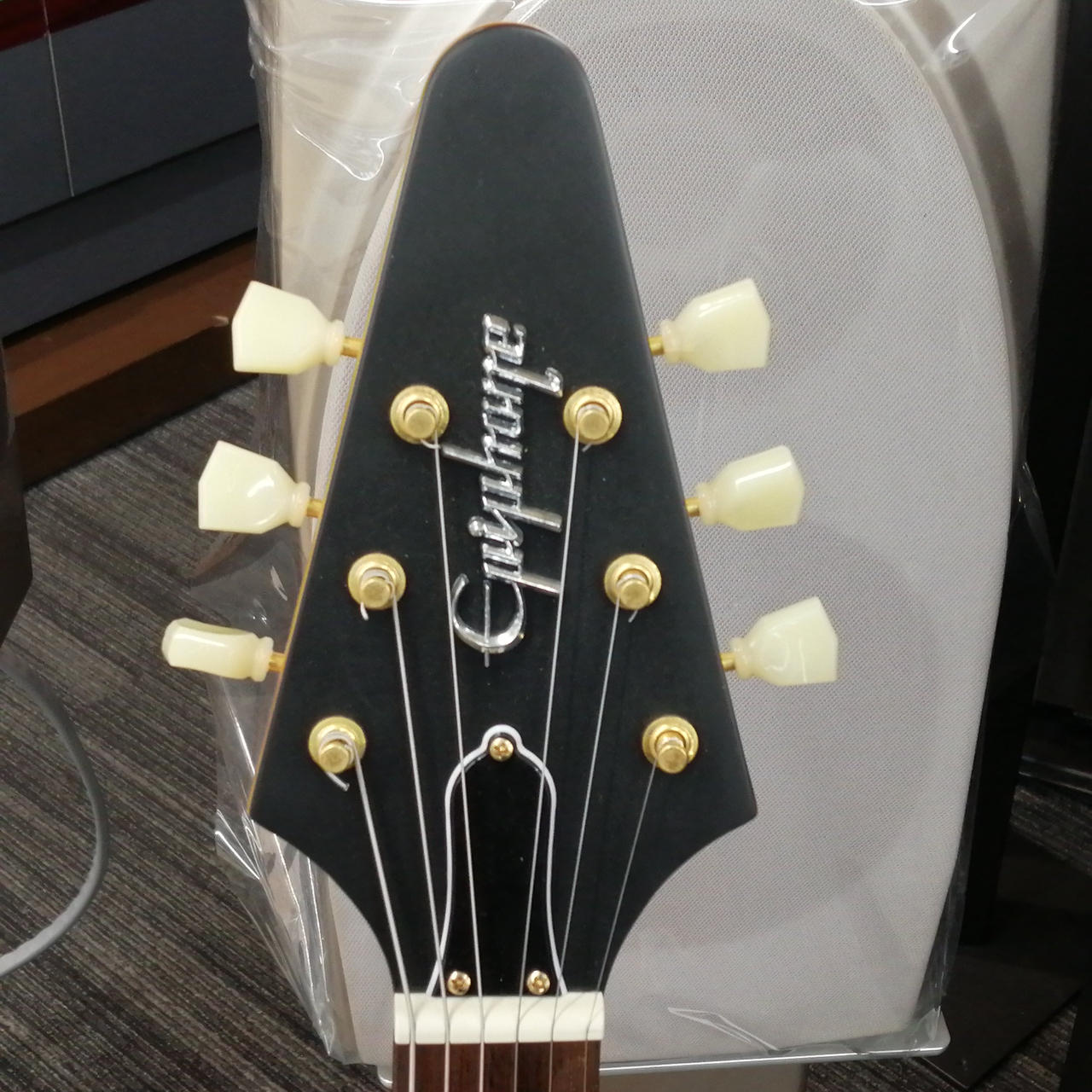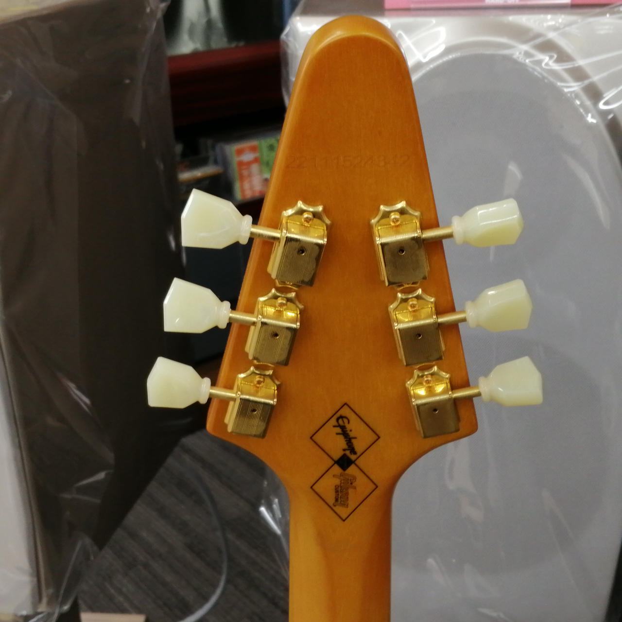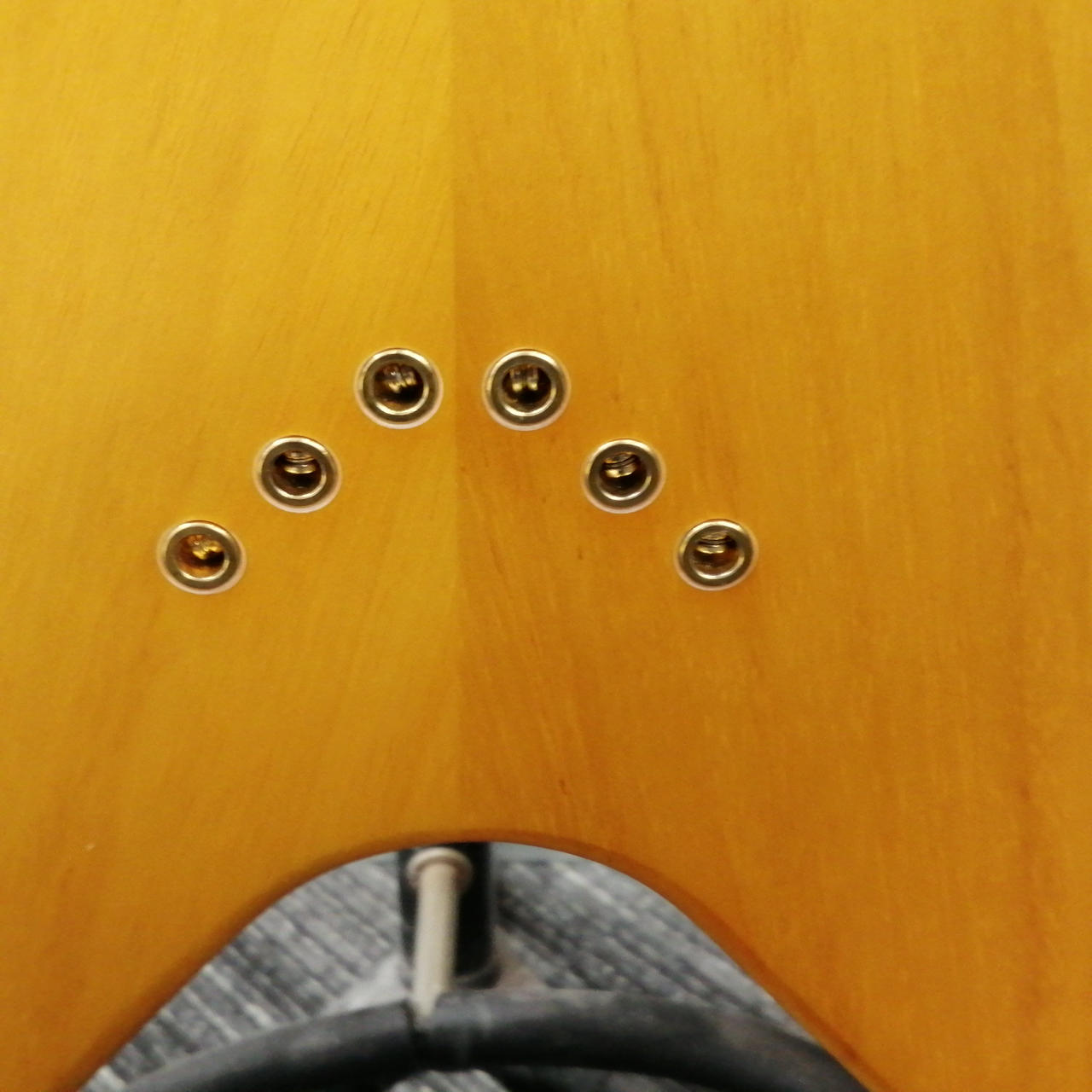 ボディやネックにコリーナ材を使用している点だけではなく、ボディ材の木取りはV字、さらにヘッド部のレイズド・ロゴやブラス製でV字型のストリング・プレートの搭載 |