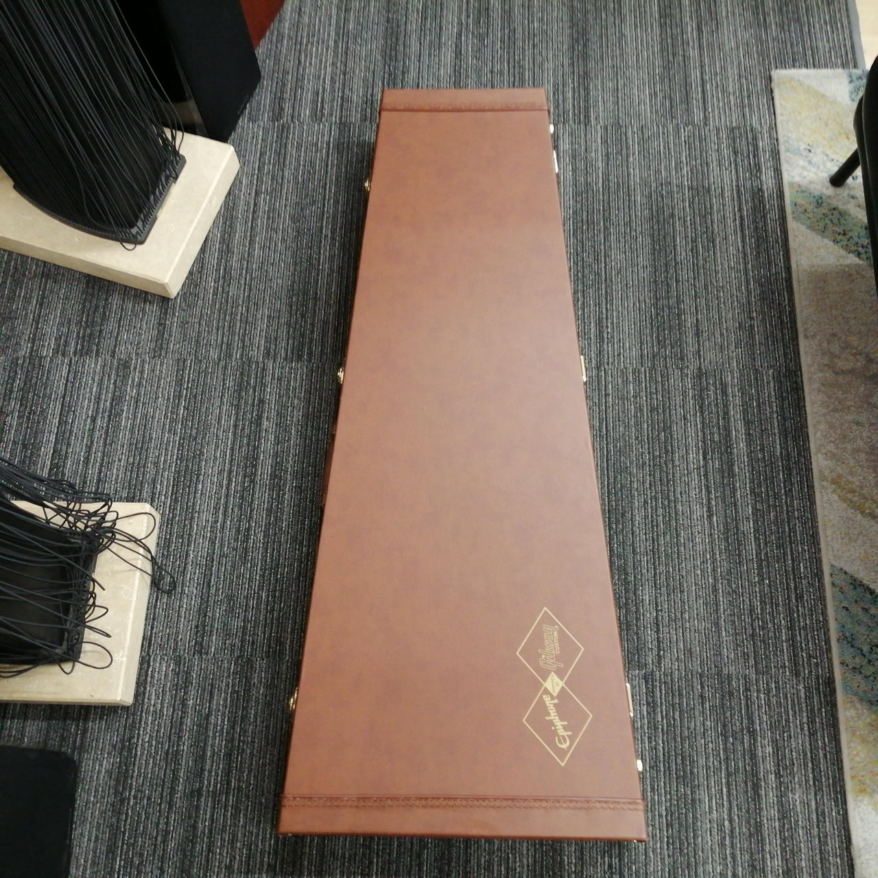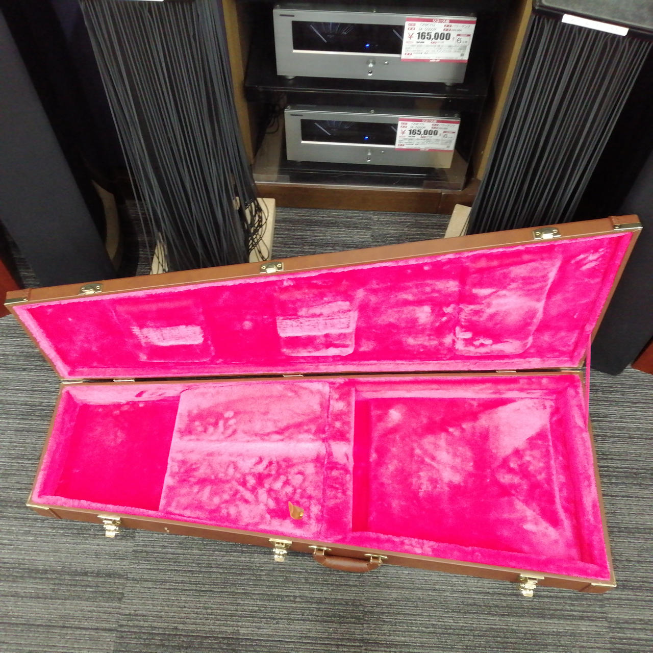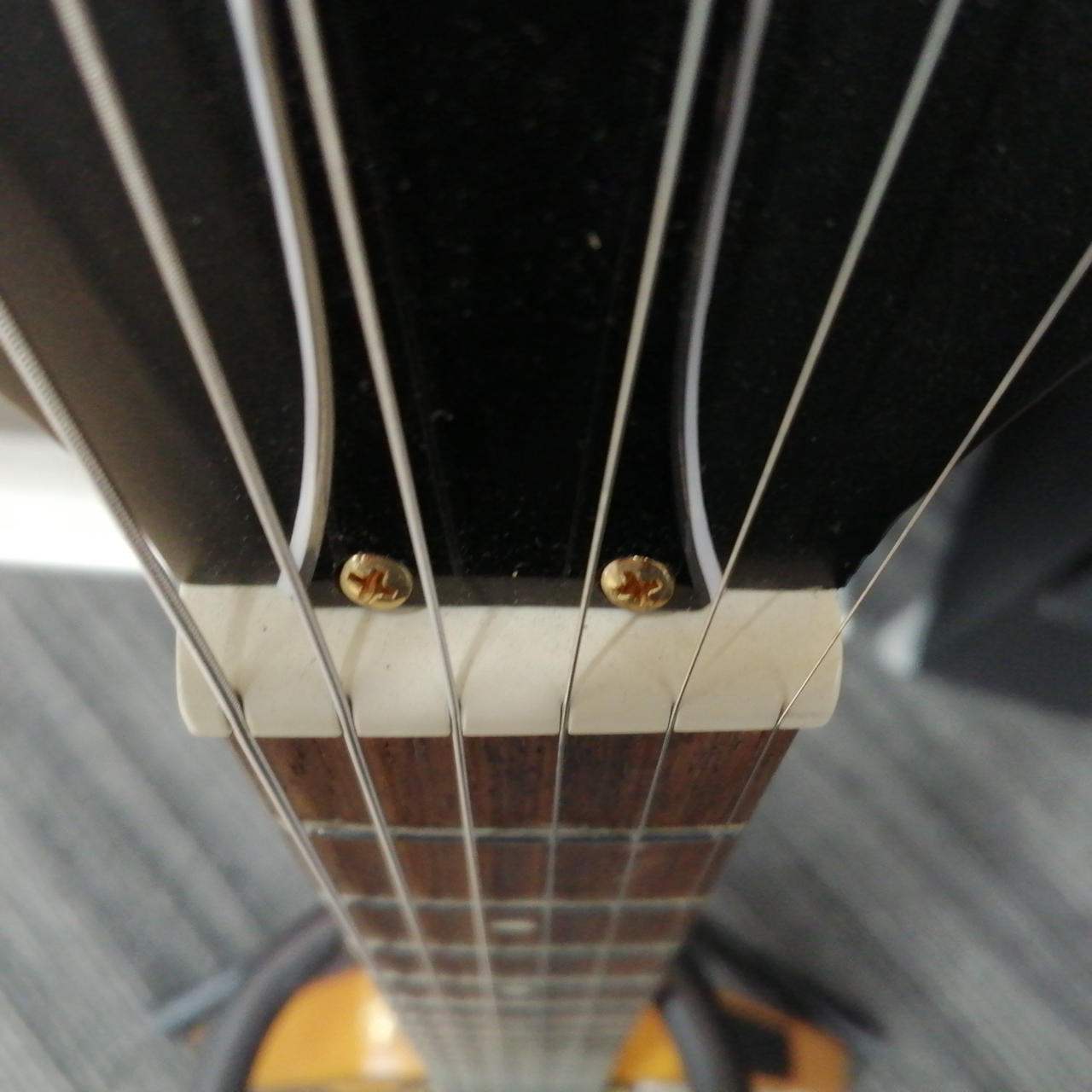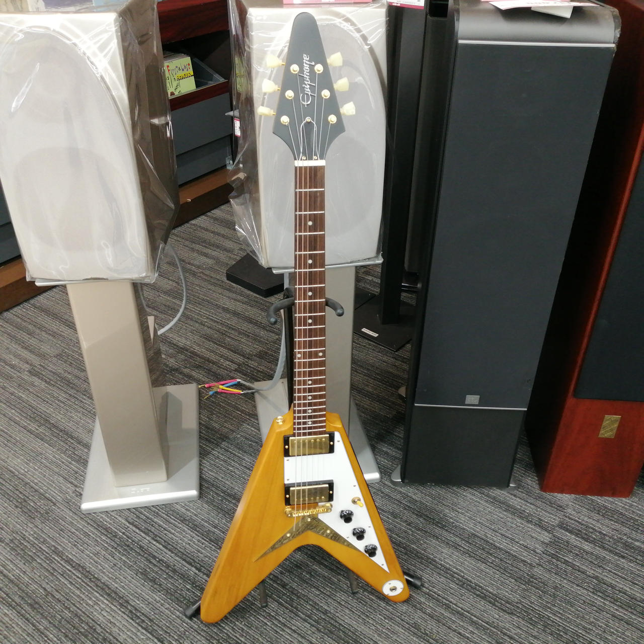 ボディやネックにコリーナ材を使用している点だけではなく、ボディ材の木取りはV字、さらにヘッド部のレイズド・ロゴやブラス製でV字型のストリング・プレートの搭載 |