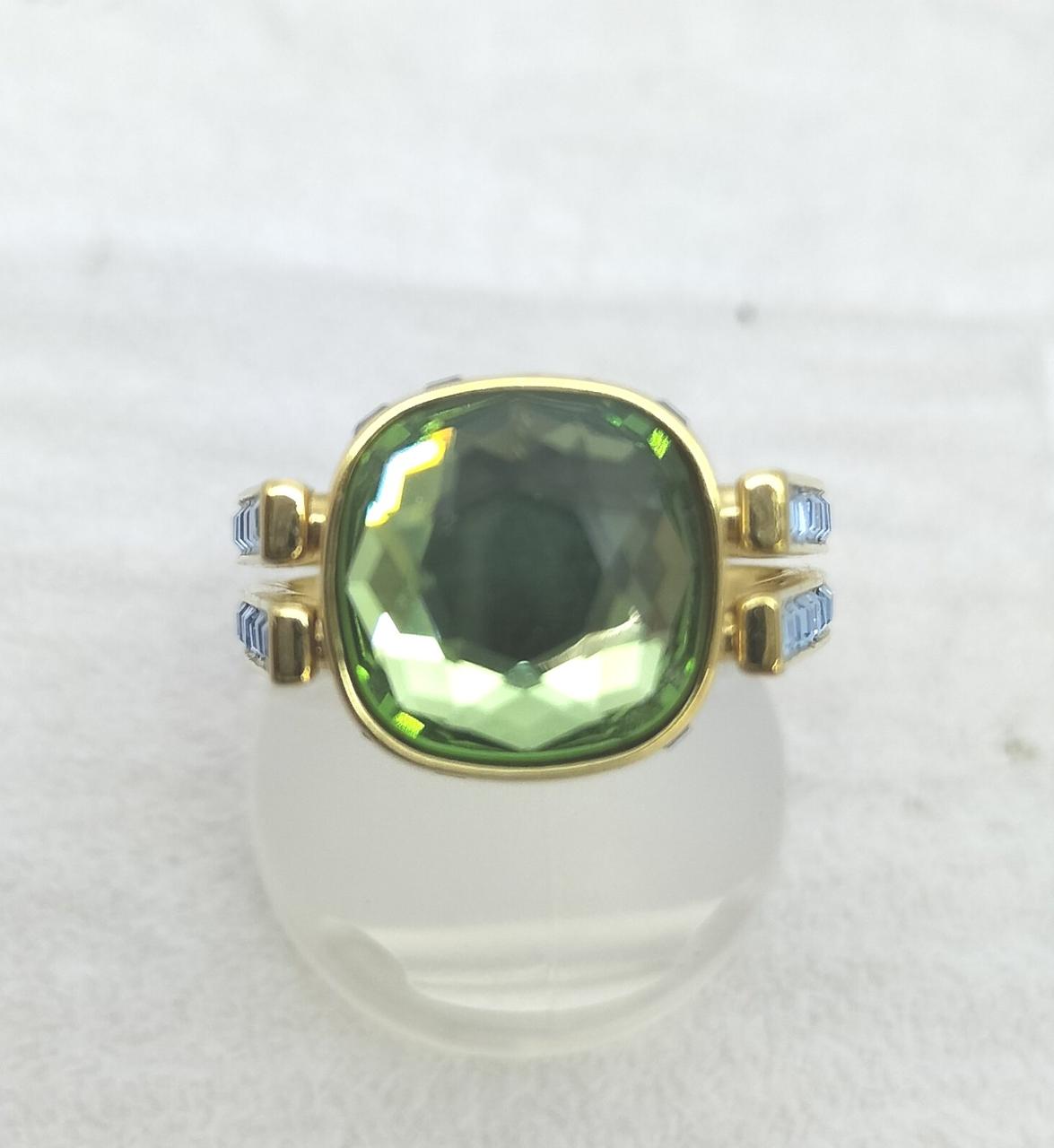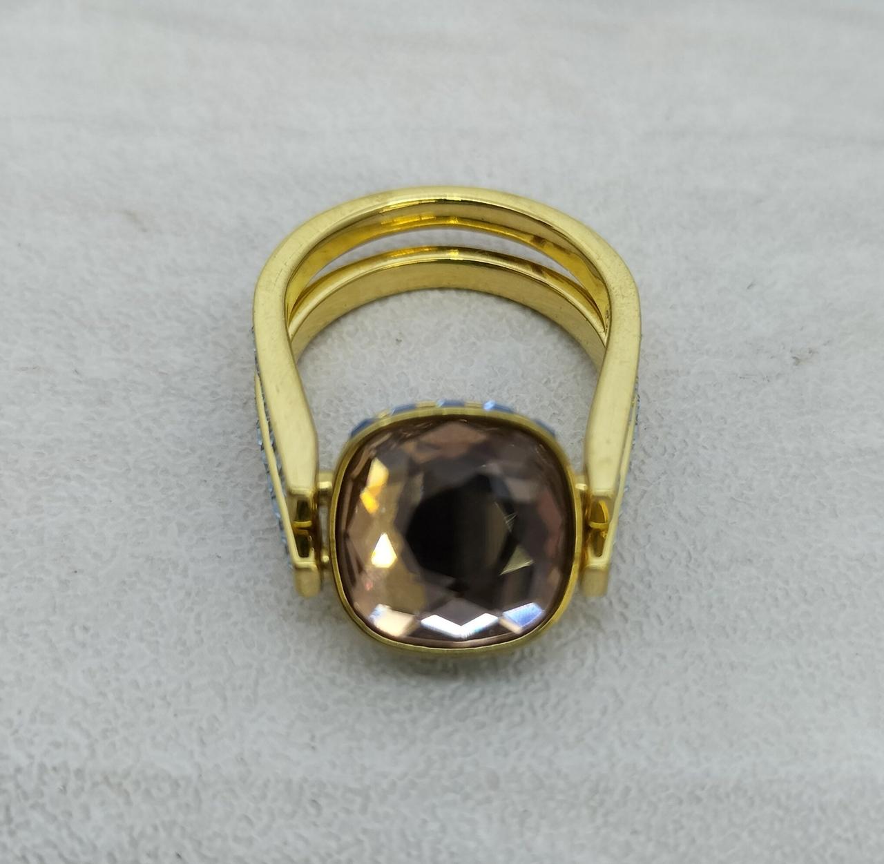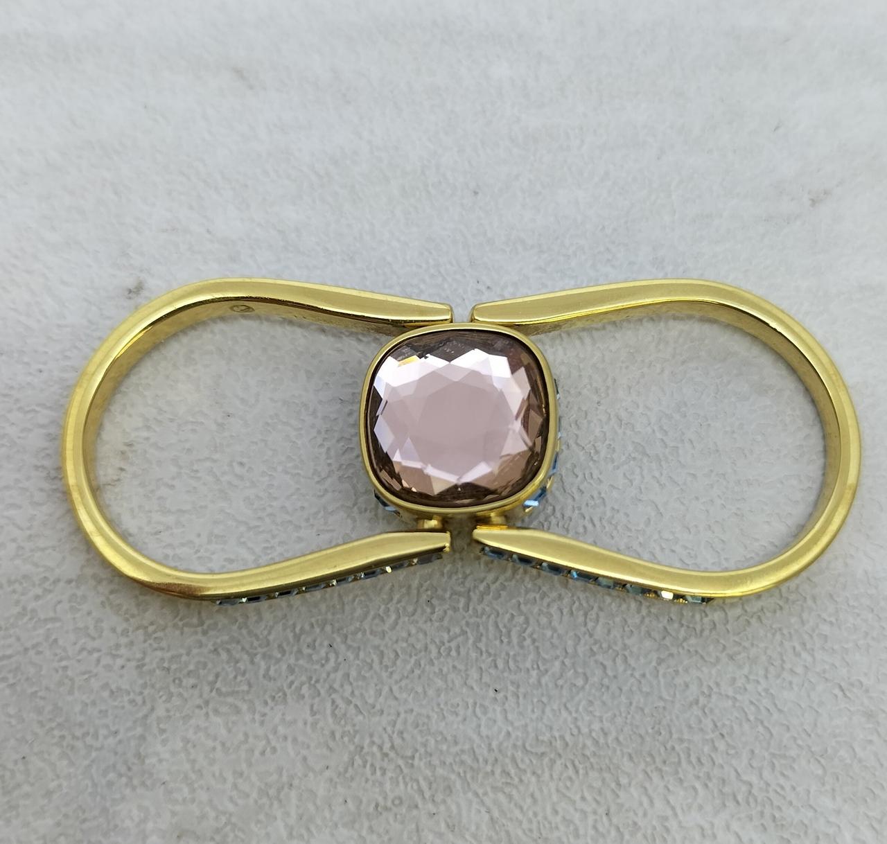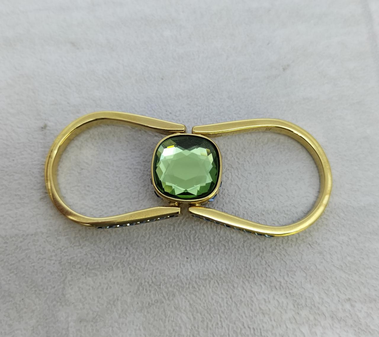 ゴールドトーン・プレーティングのシャンクの中央にはグリーンのSwarovski ReCreated™ crystalがあしらわれ、回転させると反対側のピンクのクリスタルに簡単に付け替えられます |