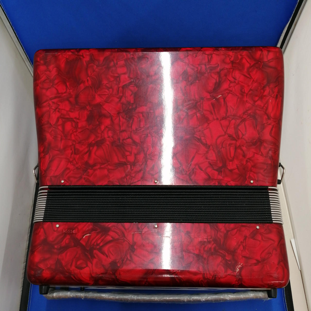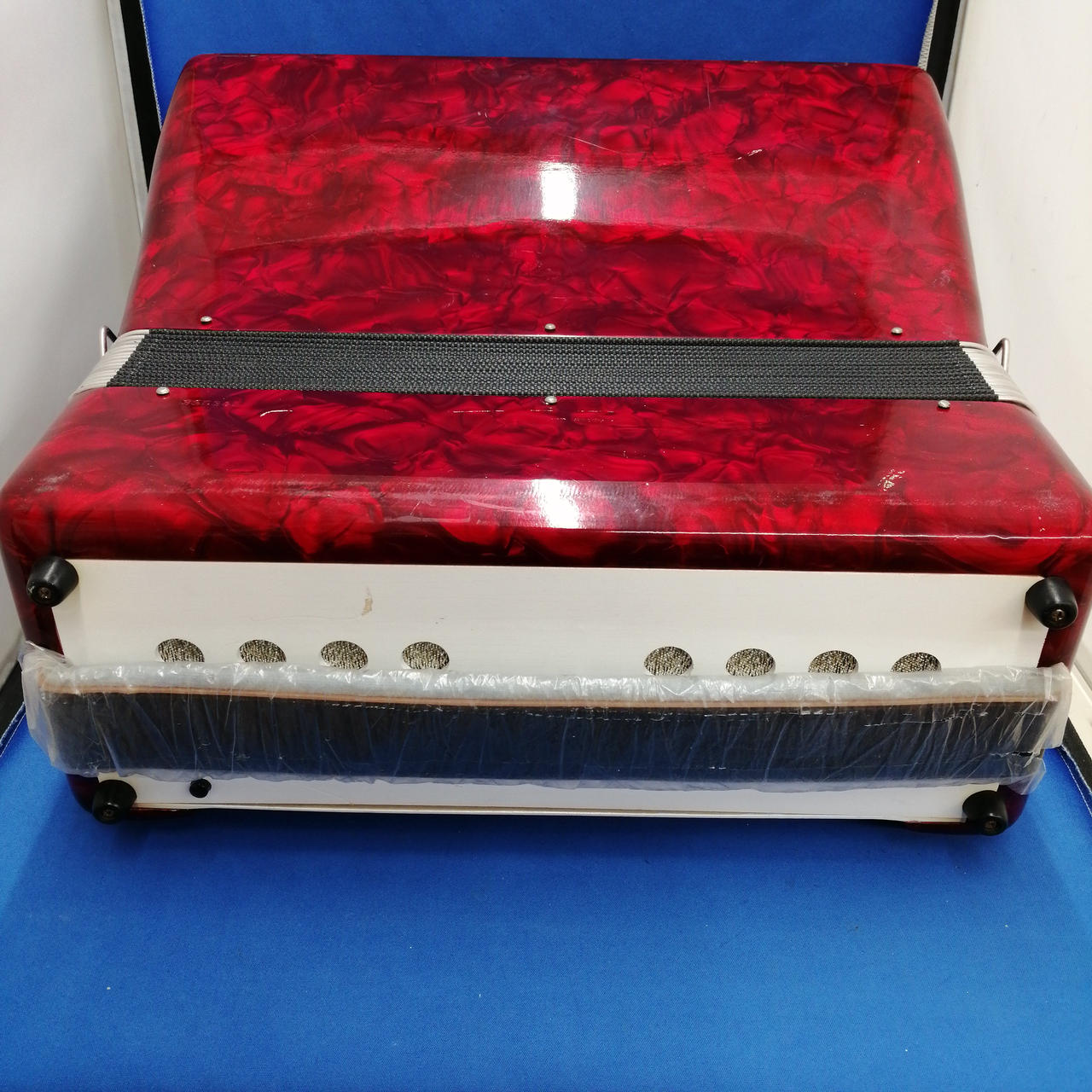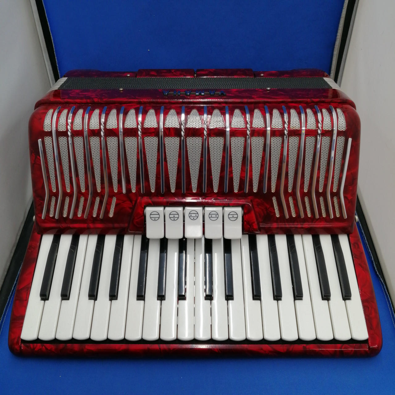 小型/幅43cm、重量7kg MMLの3セットリード 80ベース 5つの音色スイッチバスーン、バンドネオン、バイオリン、フルートとマスター低音部2つ音色スイッチ音質はさわやかなアコーディオンらしい音色・ベースボタンも16音×5列対位ベース、メジャ、マイナー、セブンスまであります |