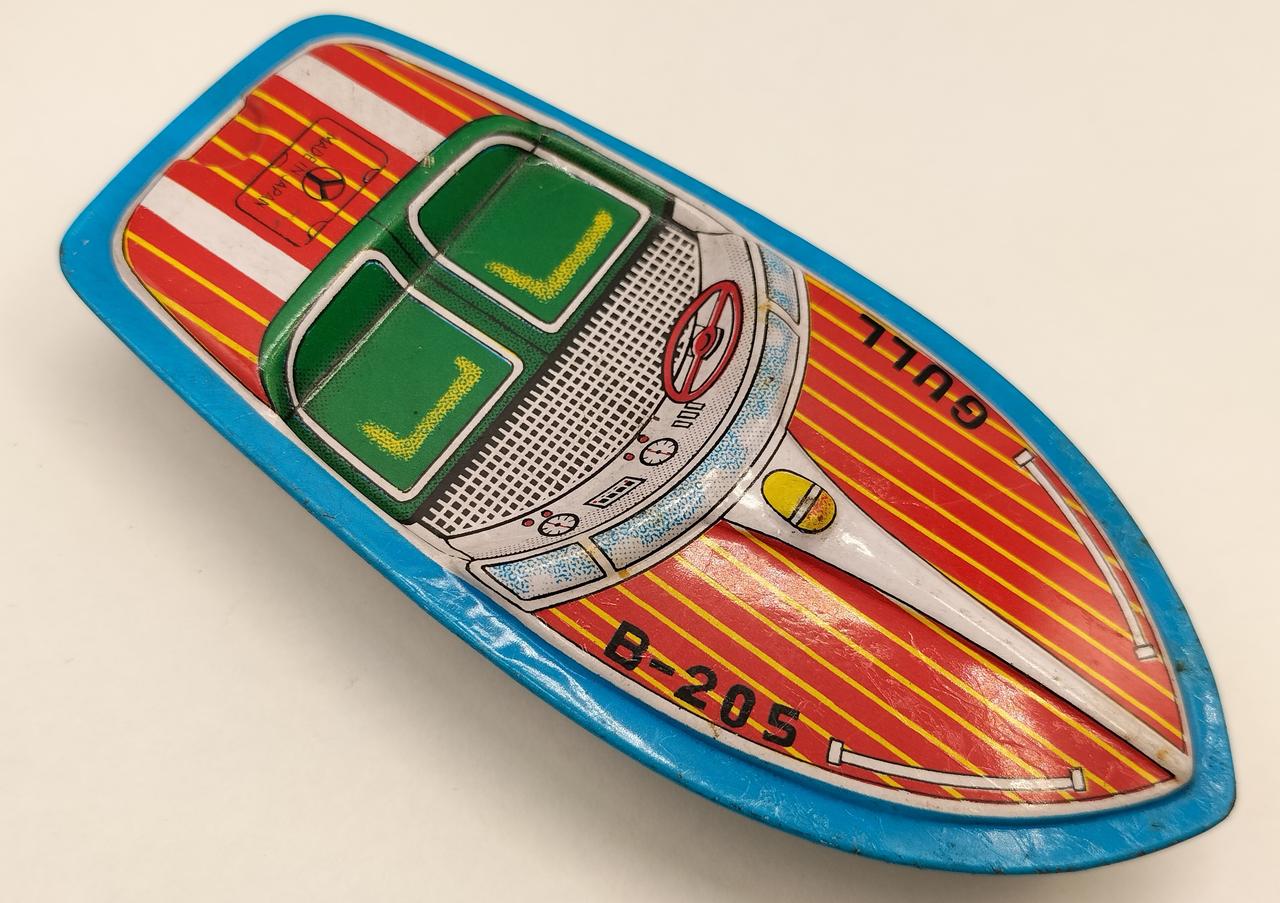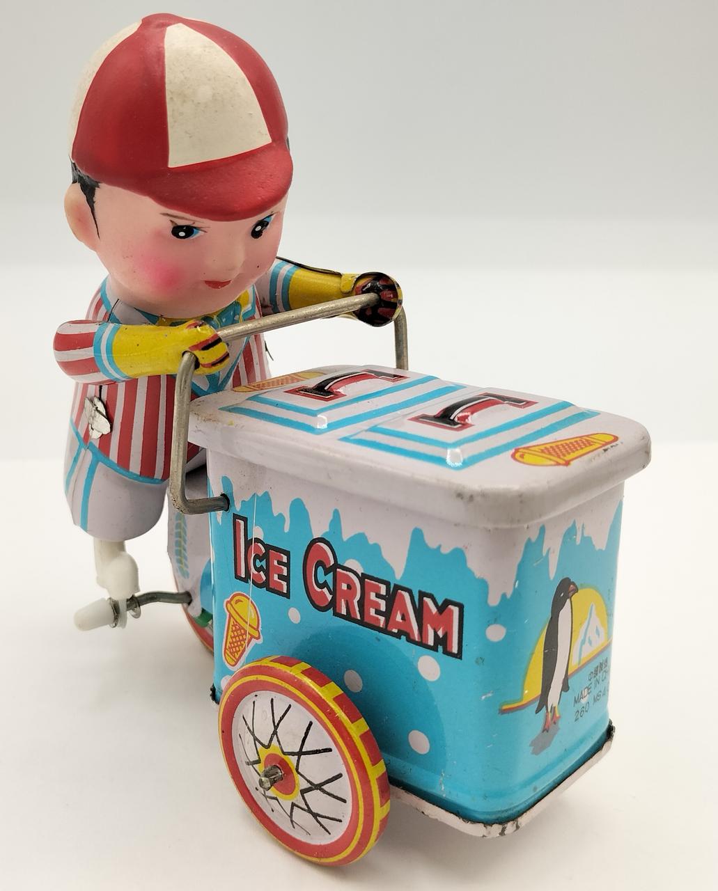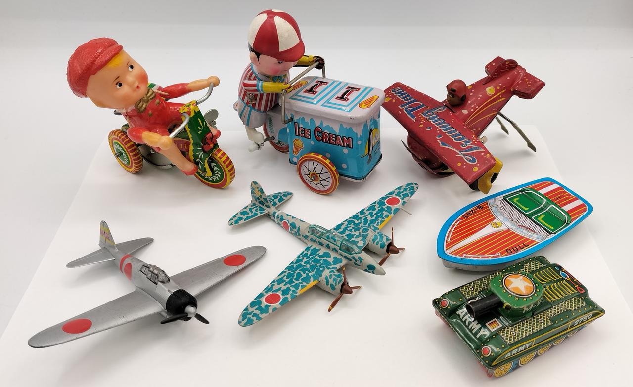 ブリキのおもちゃ×7(飛行機2台、軍用戦車、ブリキのモーターボート、赤の人形付き飛行機、アイスクリーム売りの少年、ブリキ三輪車) |