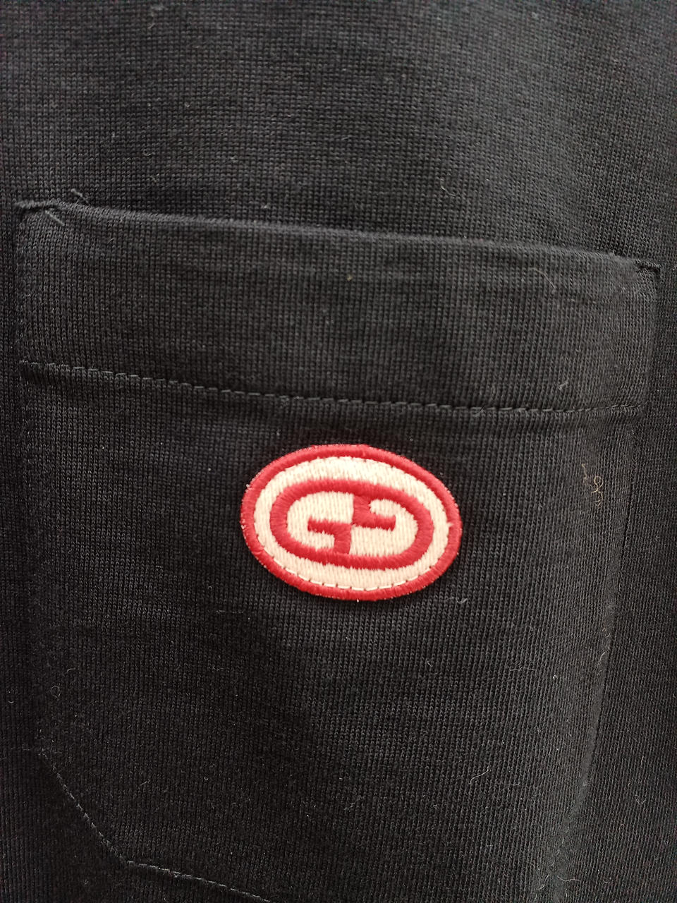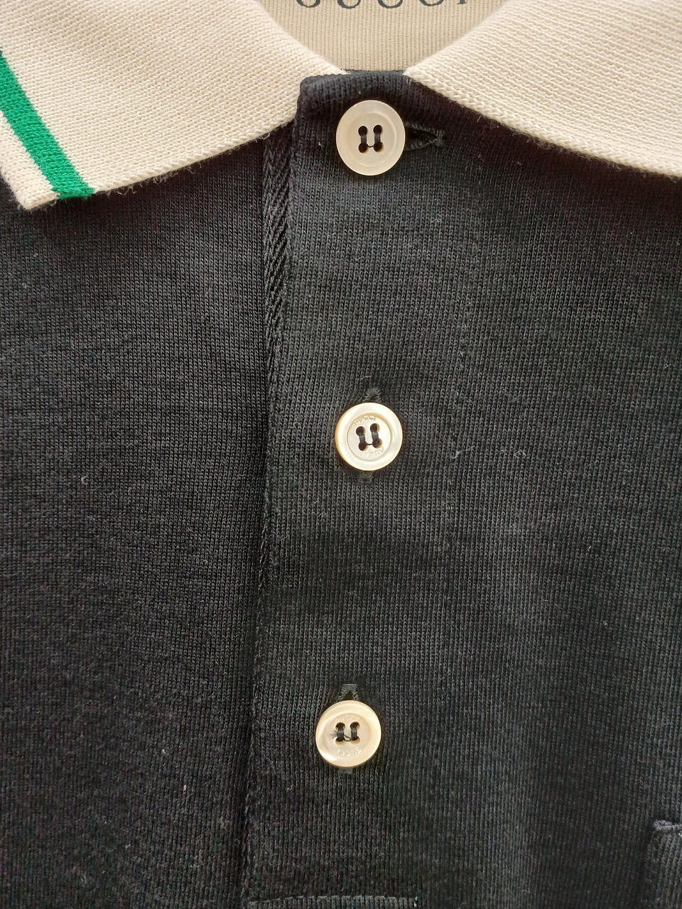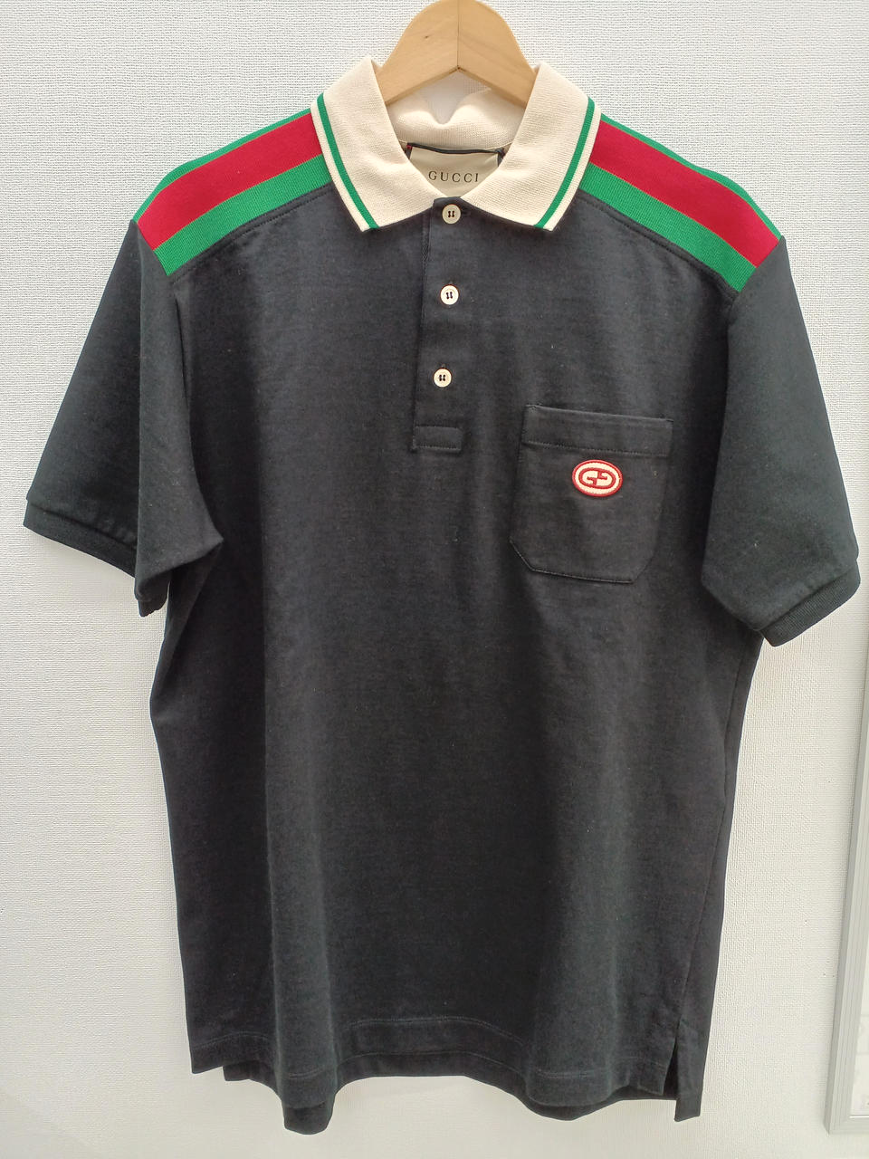 胸ポケットのインターロッキングGのロゴパッチと両肩のウェブストライプがポイント