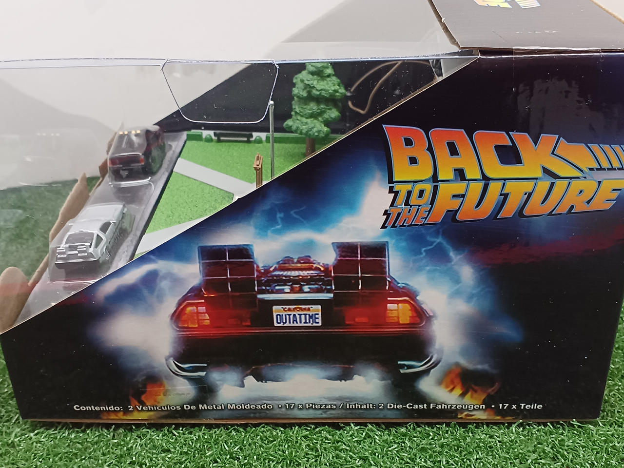 劇場登場車のミニチュアサイズのデロリアンとトヨタSRSピックアップの2台も付属しています |