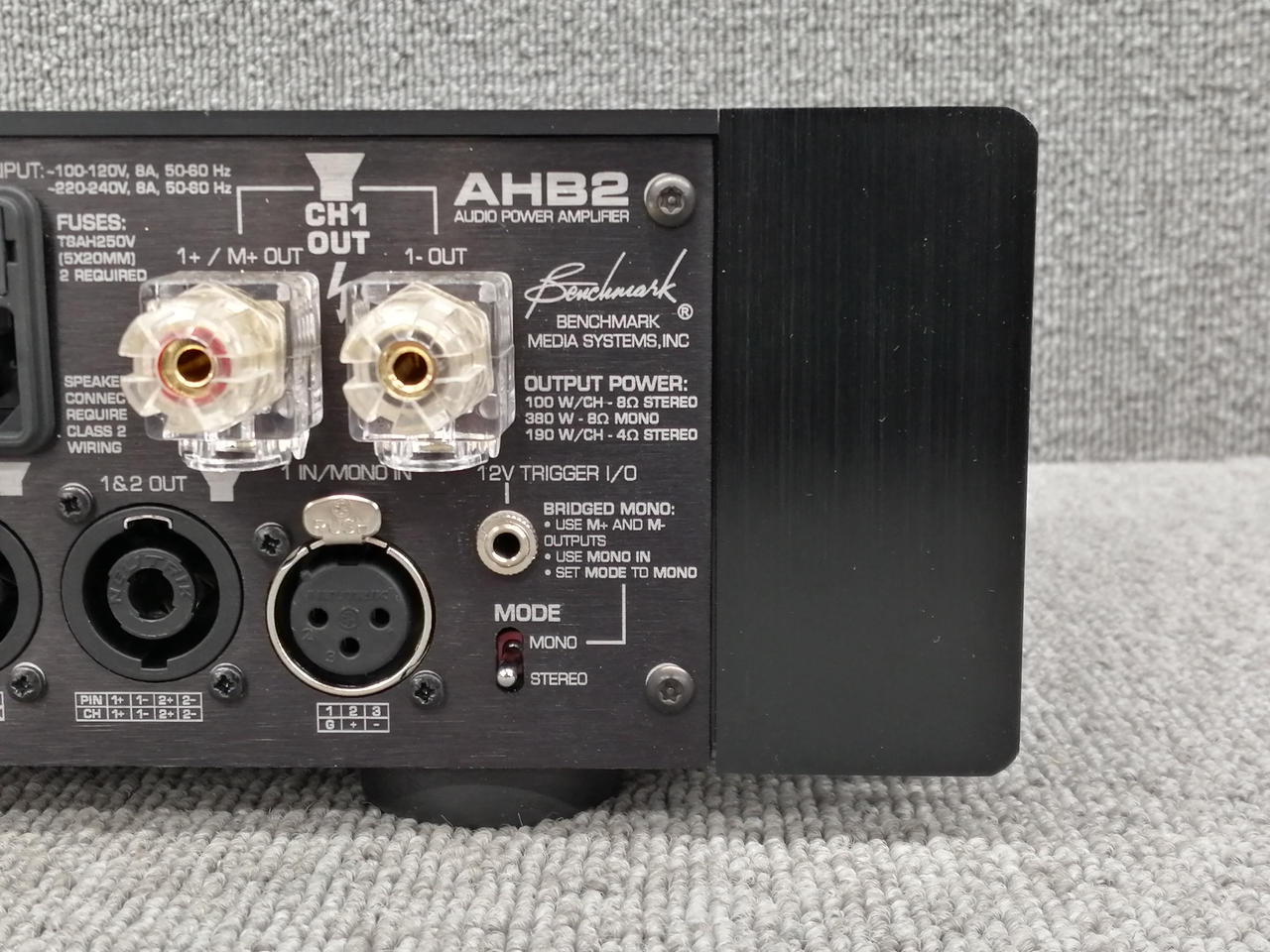 100W/ch@8Ω 130W/ch@6Ω 190W/ch@4Ω 230W/ch@3Ω 380 W@8Ω, ブリッジド・モノラル |