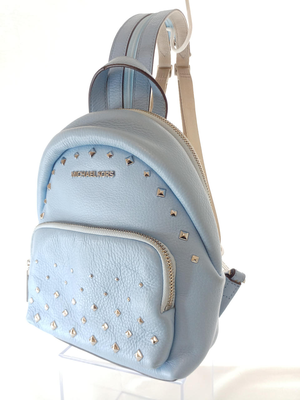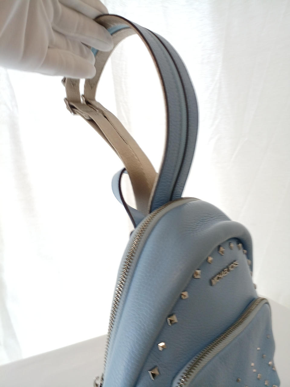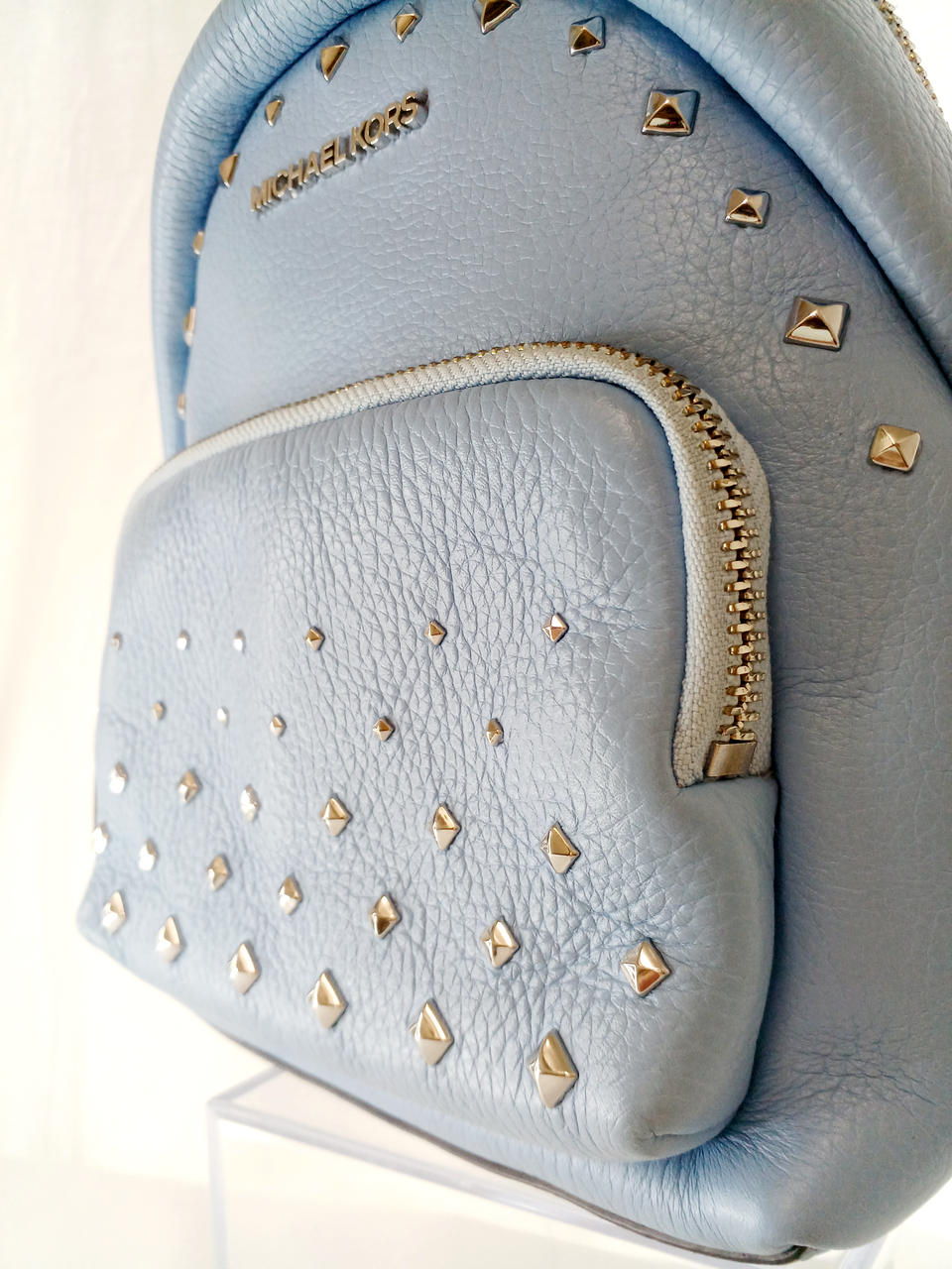 スタッズ付きのレザーバッグ。 |