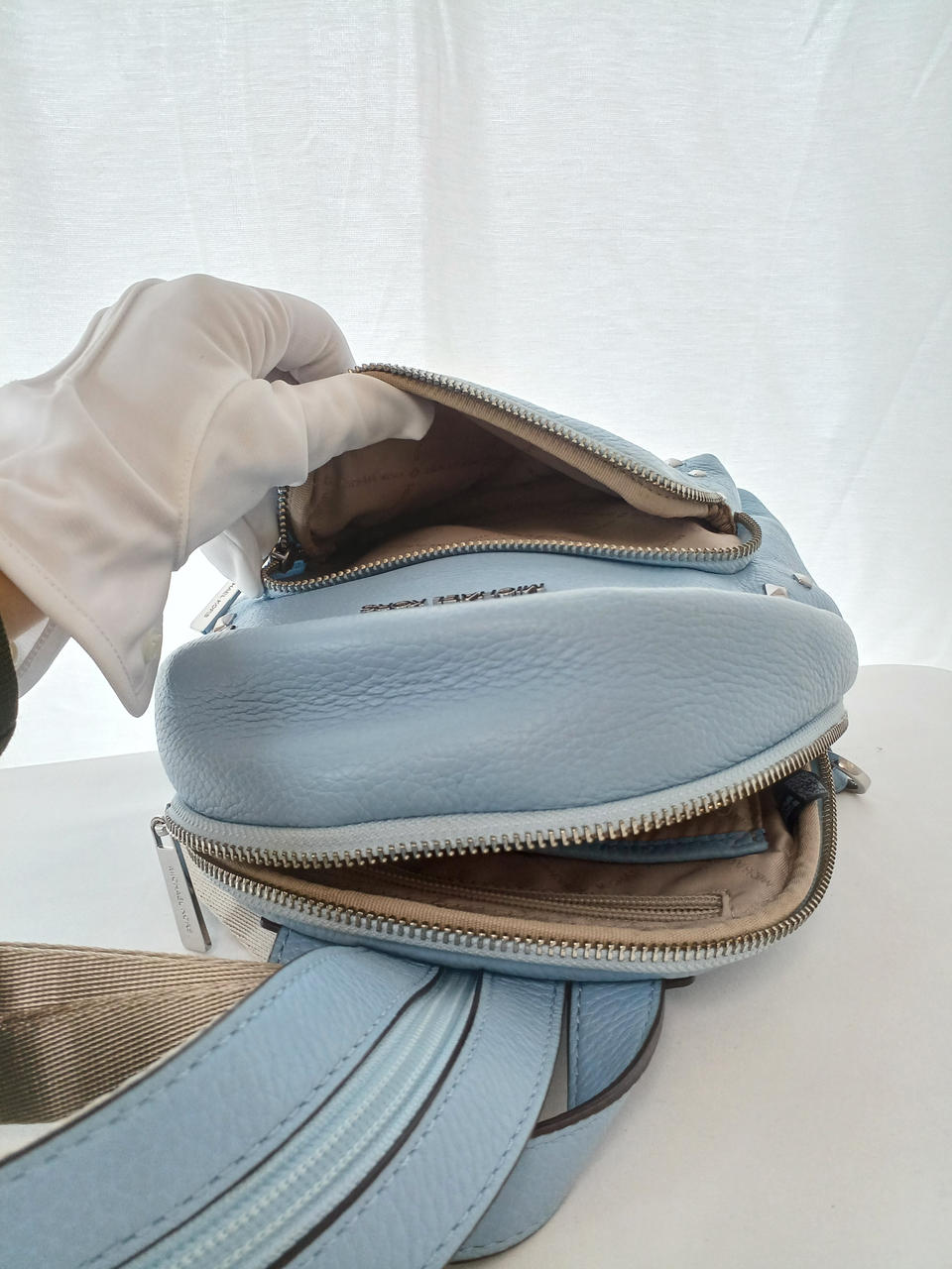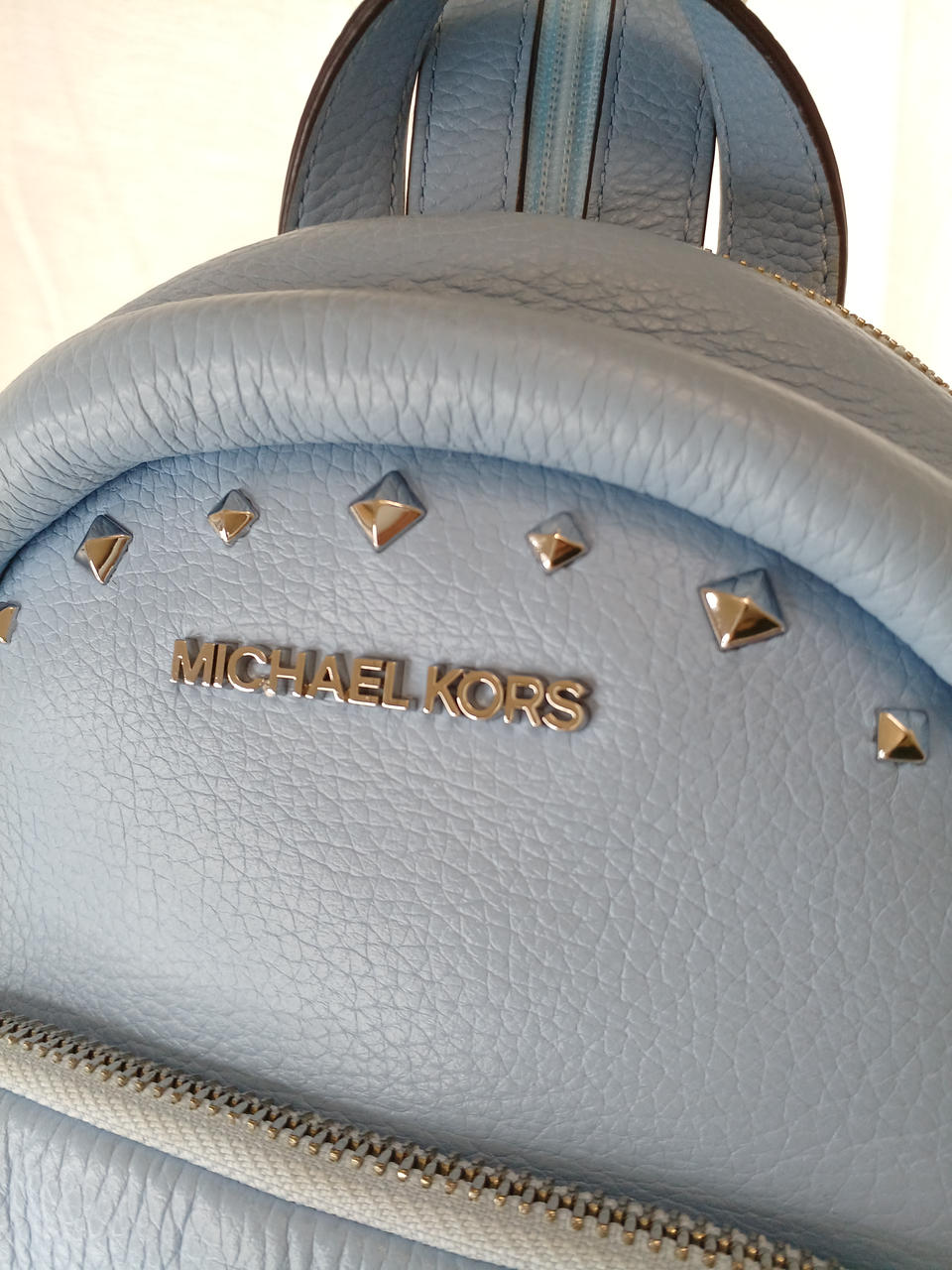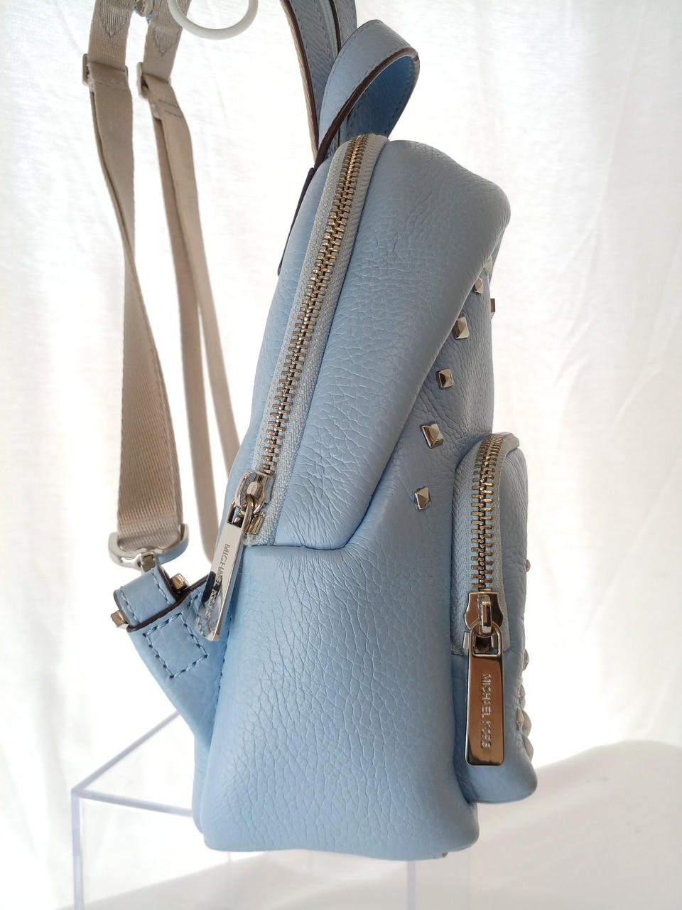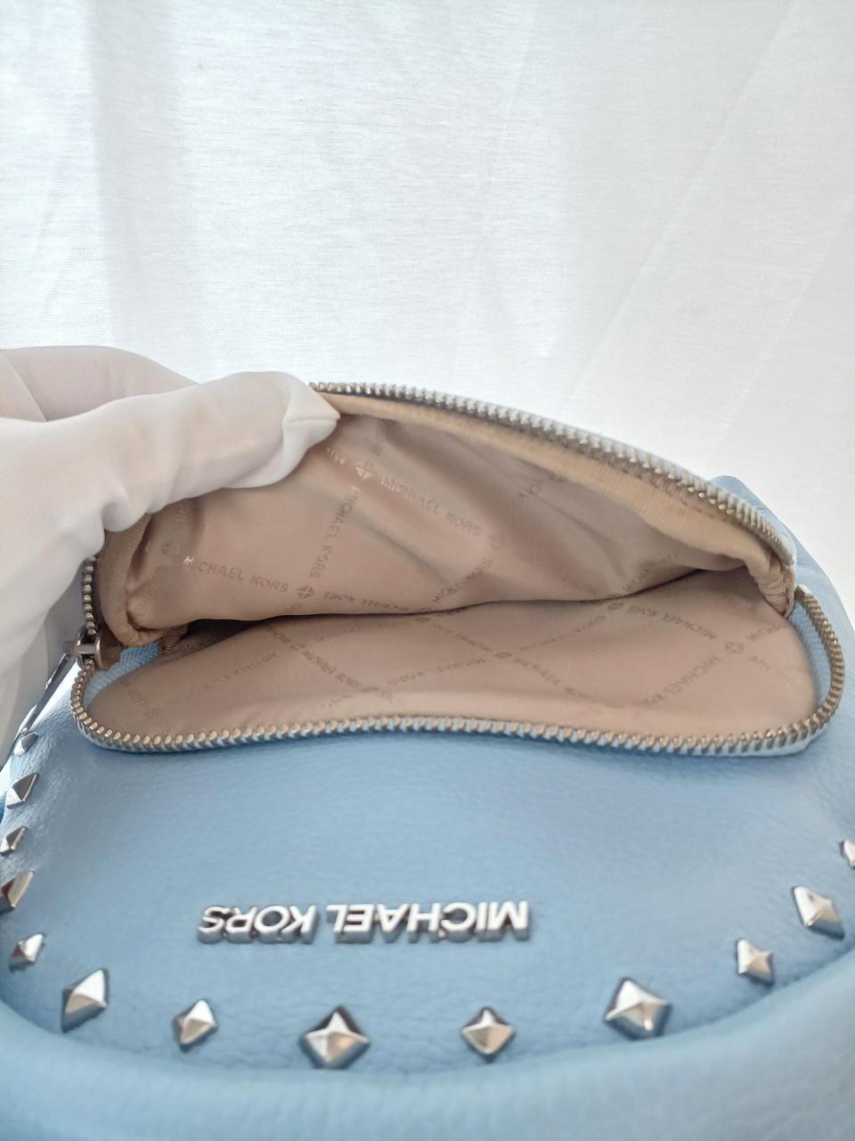 スタッズ付きのレザーバッグ。 |