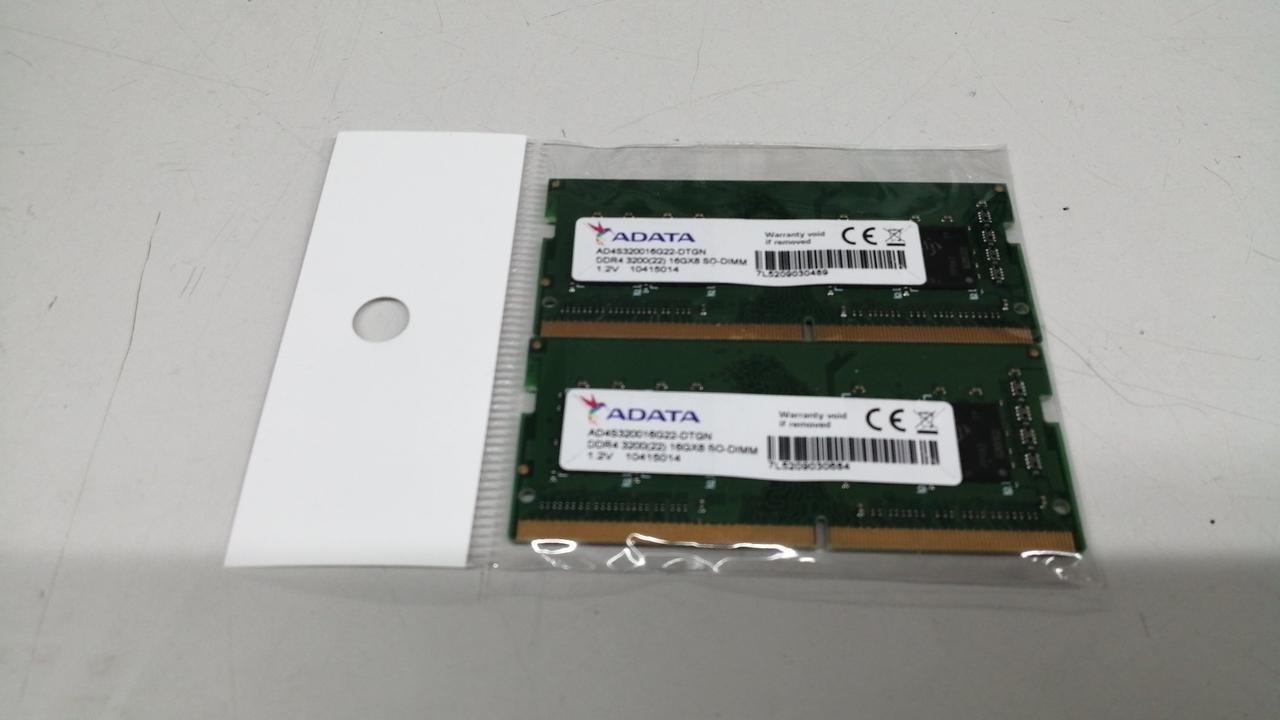 メモリ容量(1枚あたり):16GB 枚数:2枚 メモリ規格:DDR4 SDRAM メモリインターフェイス:S.O.DIMM モジュール規格:PC4-25600(DDR4-3200) |