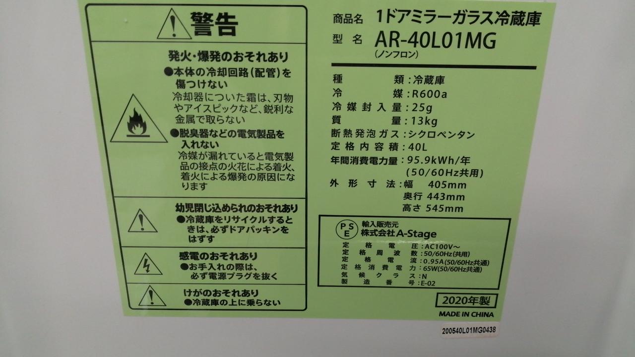 2020年A-STAGE製1ドア冷蔵庫 |
