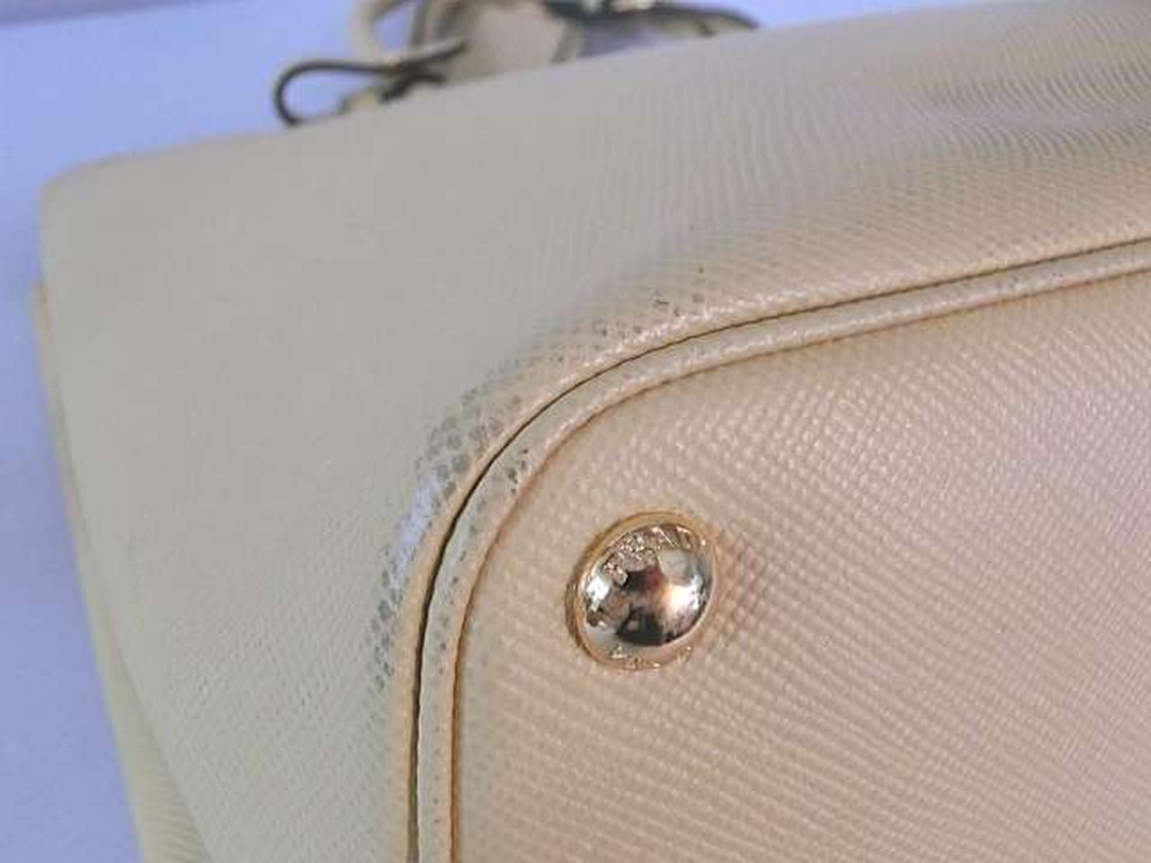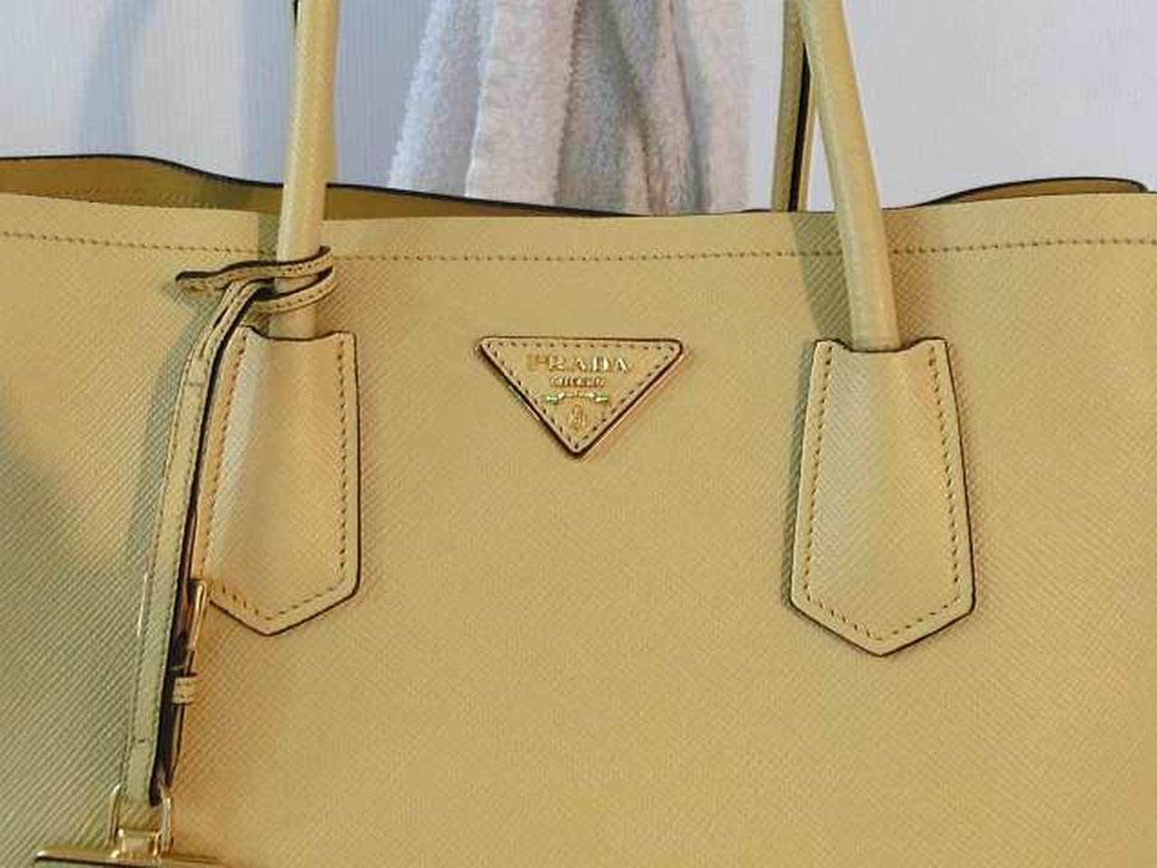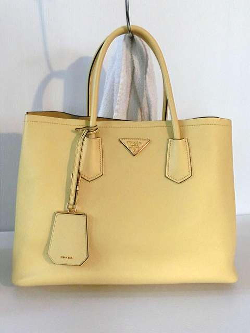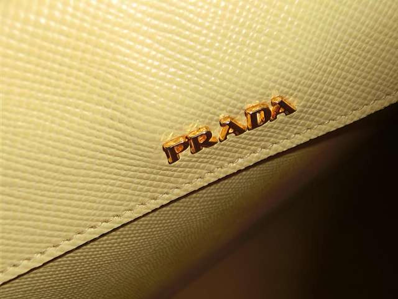 レザー素材にロゴ金具のアクセントが効いたプラダらしい高級感のあるトートバッグ。収納力があり、高級感もある大変機能的なアイテムでございます。 |