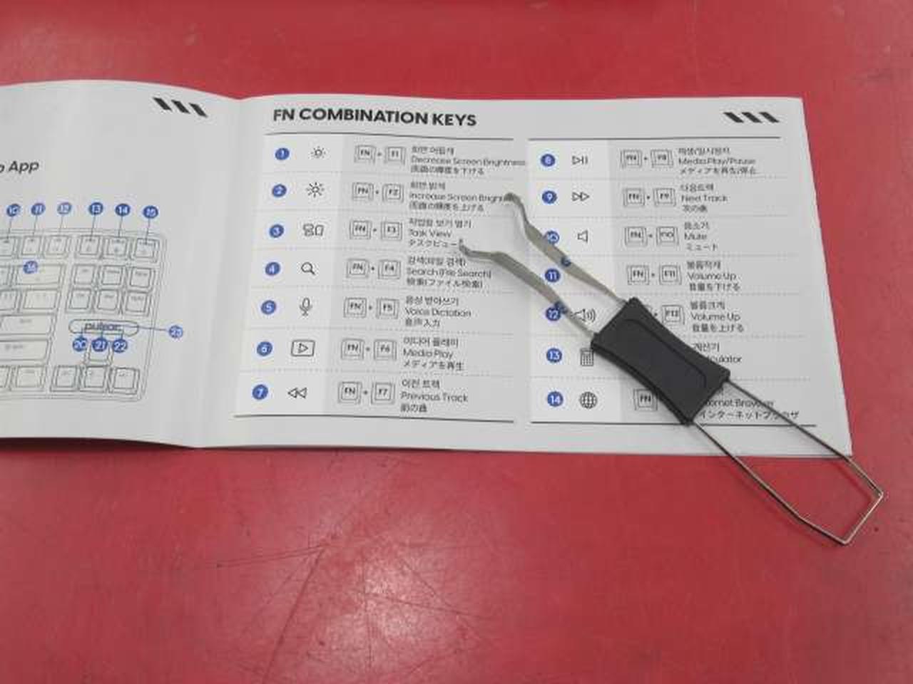 付属品は画像にあるもの(内箱・キーパッド抜き工具・ガイド)が全てとなります。 ※外箱・USBケーブル等はありませんので、ご注意ください。 |