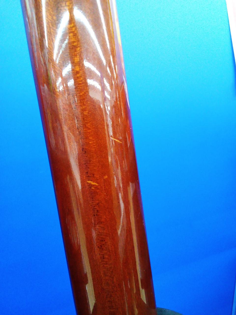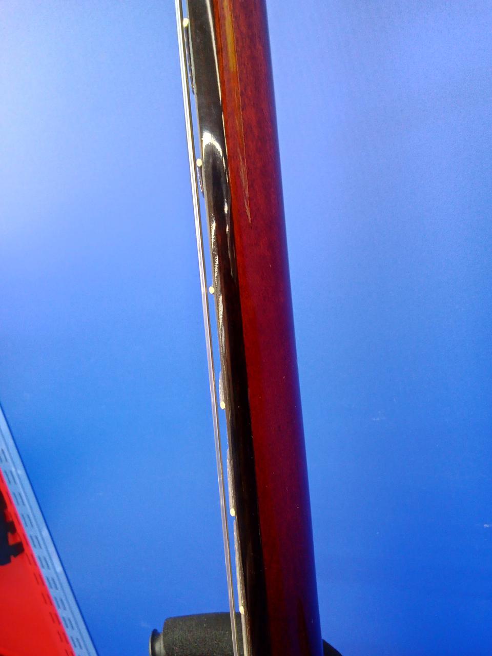やや丸めな握りのマホガニーネックに黒々したエボニー指板。細部までよく造り込まれており繊細なタッチを綺麗に表現できるギターです。 |