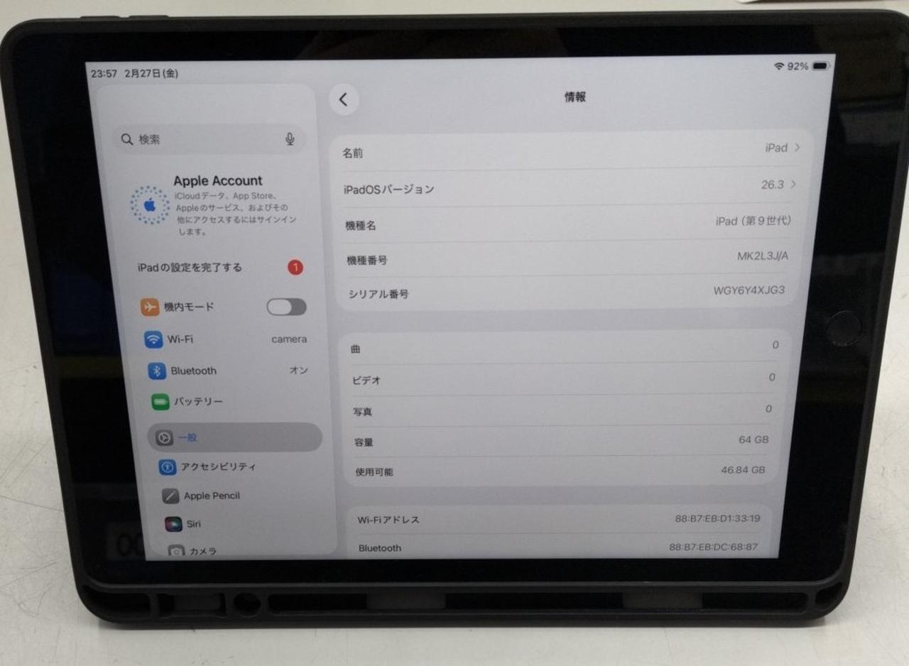 第9世代 10.2インチRetinaディスプレイ 64GB CPU:Apple A13 TouchID iPadOS:26.3 |