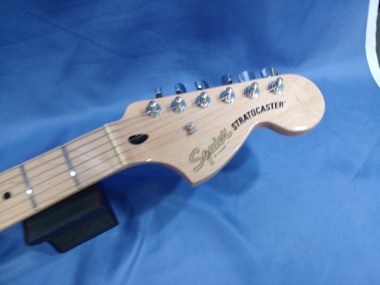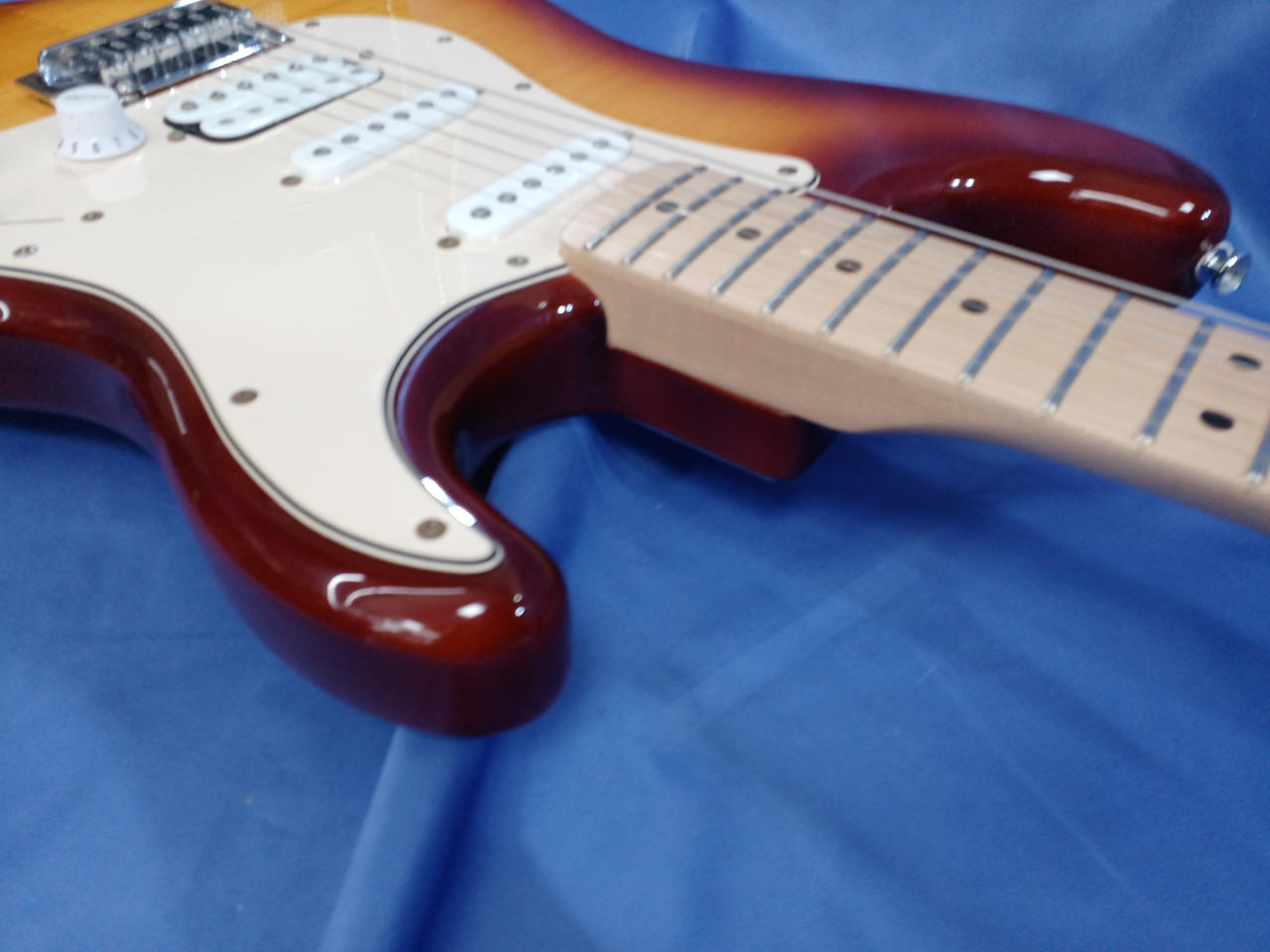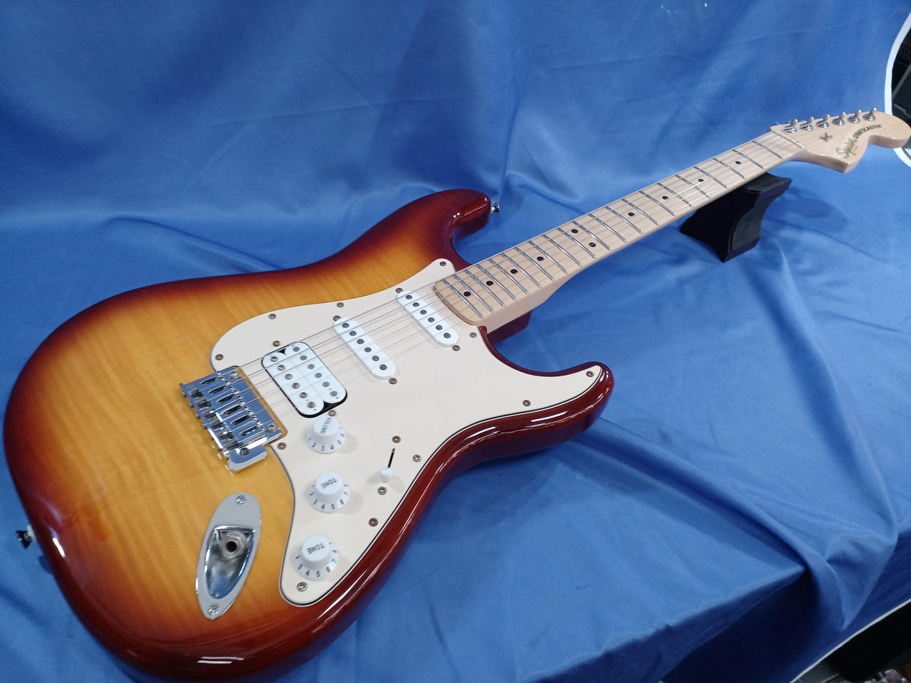 ラージヘッドにHSS仕様、フレイムメイプル貼りのちょっとイかしたSquier |