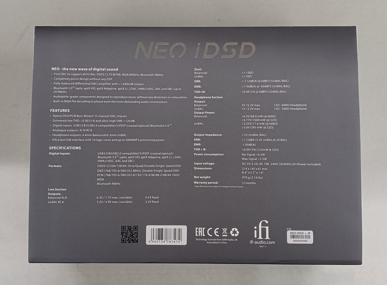 入力:USB/同軸/光デジタル/BLUETOOTH 出力:ヘッドホン/XLR/RCA |