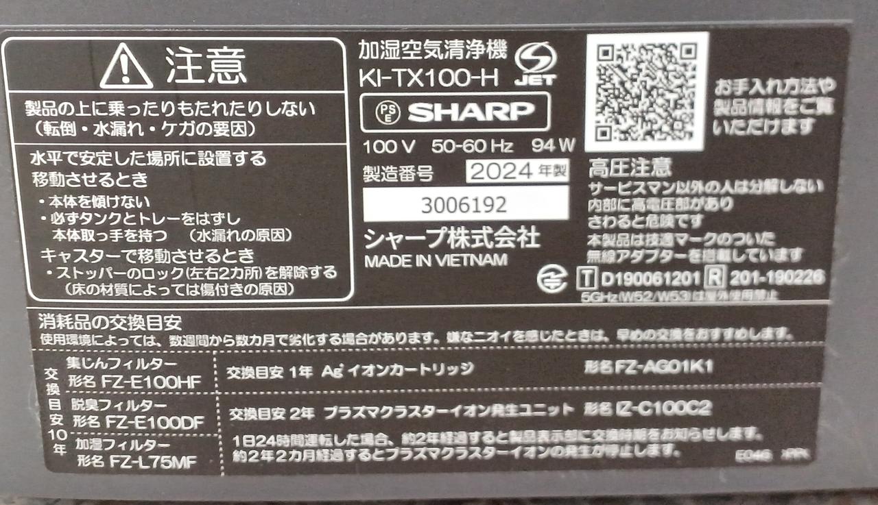 最大適用床面積: 空気清浄:~46畳(76m2), 加湿空気清浄:~37畳(61m2) 加湿適用畳数(木造/洋室):~19畳(31m2)/~31畳(51m2) |