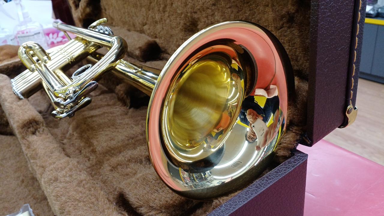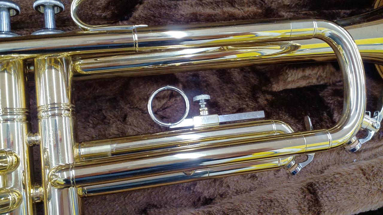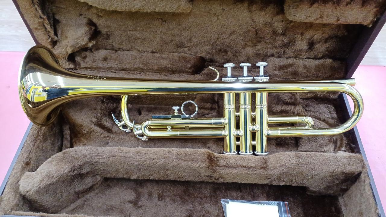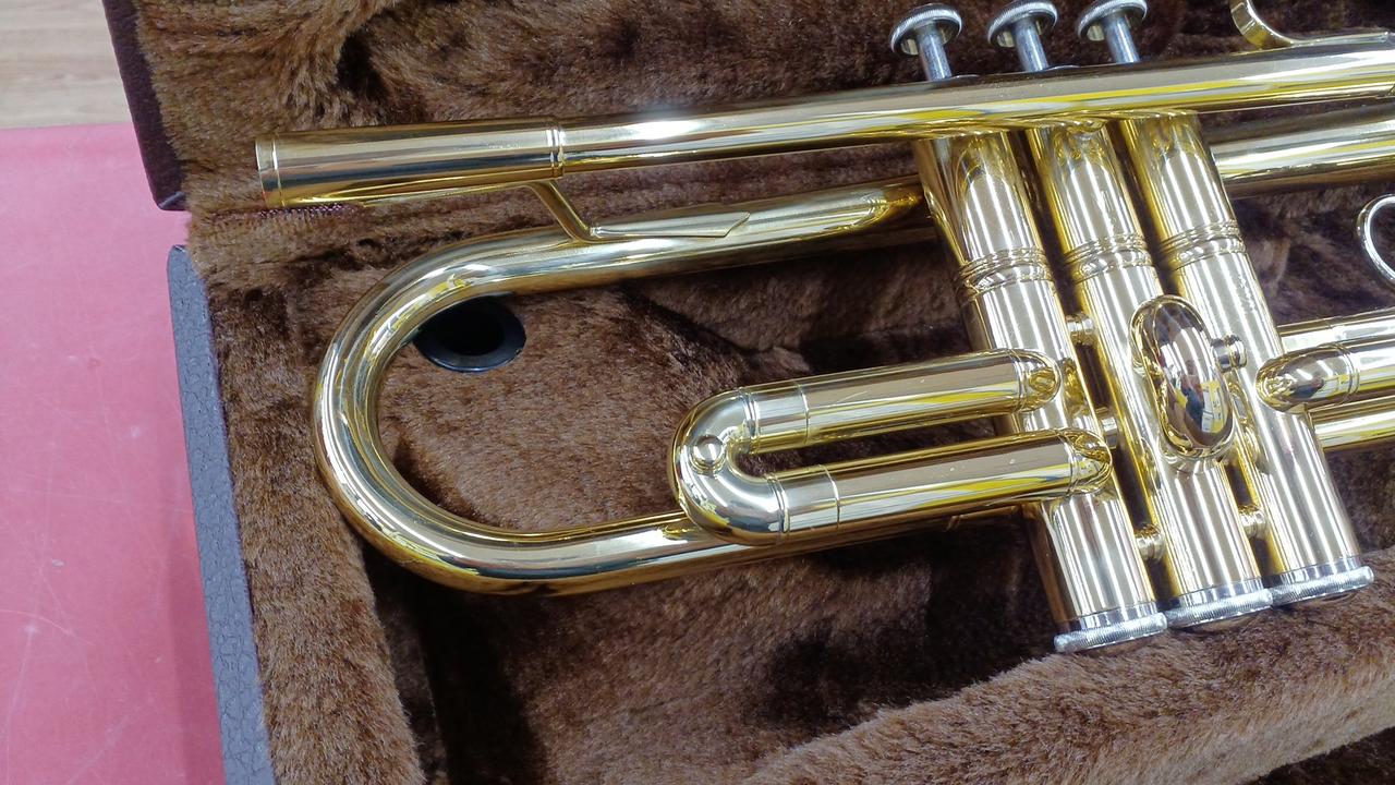 下倉楽器の管楽器ブランド マルカートの入門用トランペット。使用感少なめな個体ですが、ウォーターキーのコルク欠け有り。 |