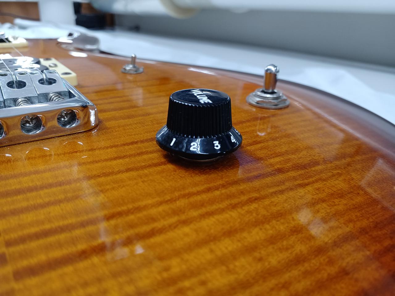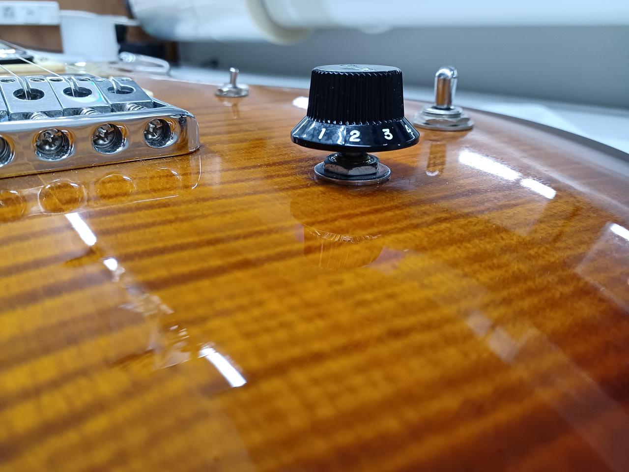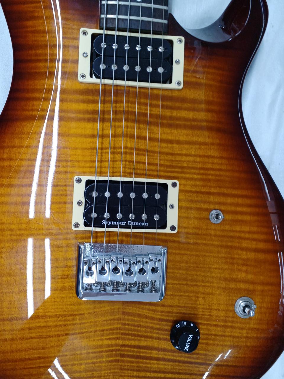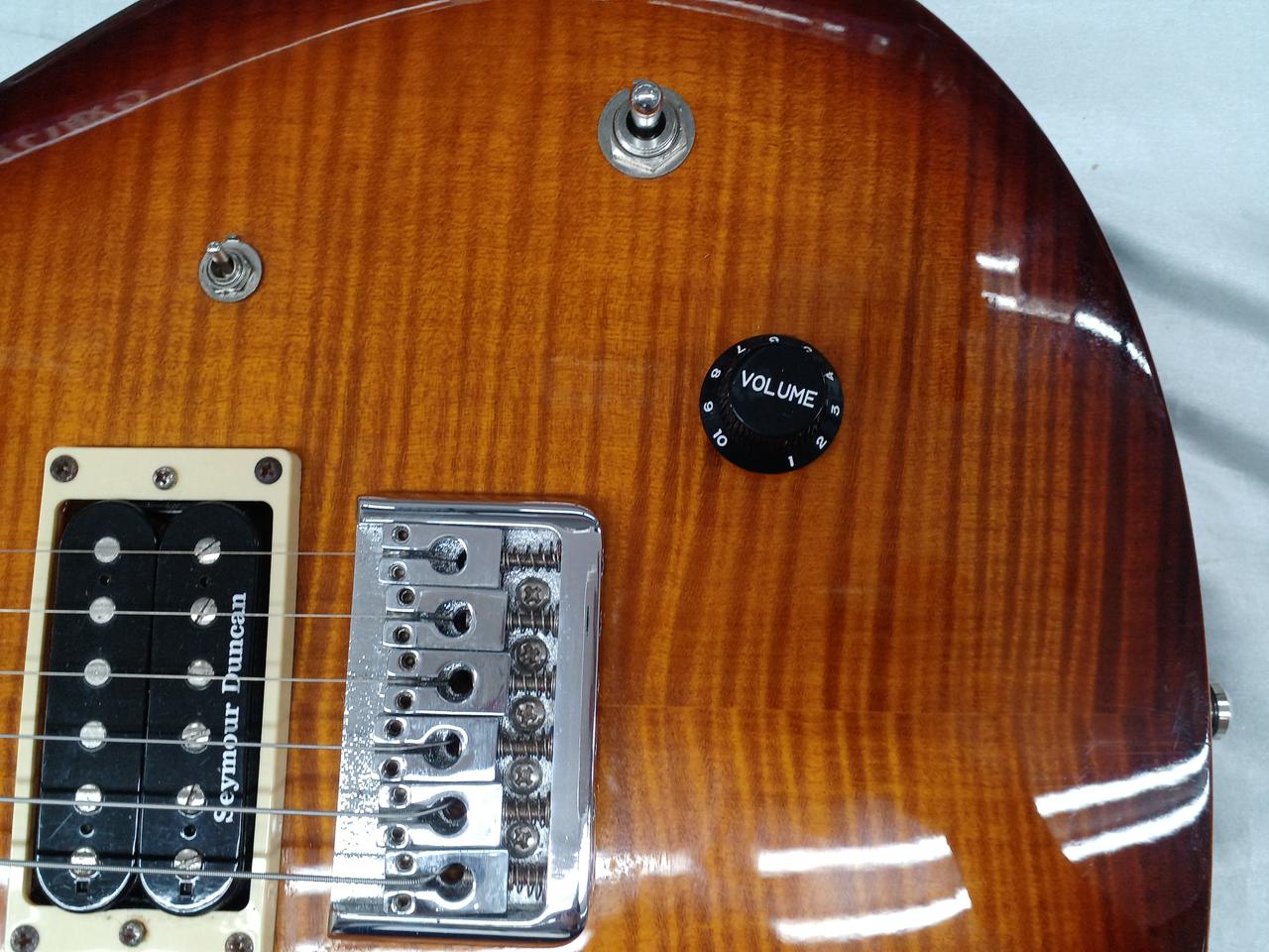 こちらは改造が施された個体。ピックアップはフロントがSeymourDuncan SH-1N、リアがTB-59。コントロールも改造されております。一度ご試奏ください。