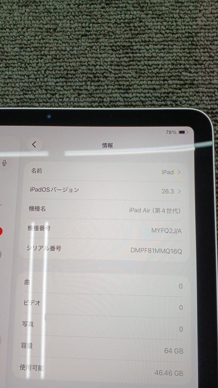 第4世代 iOS:26.3 画面サイズ:10.9インチ 記憶容量:64GB Wi-Fiモデル |