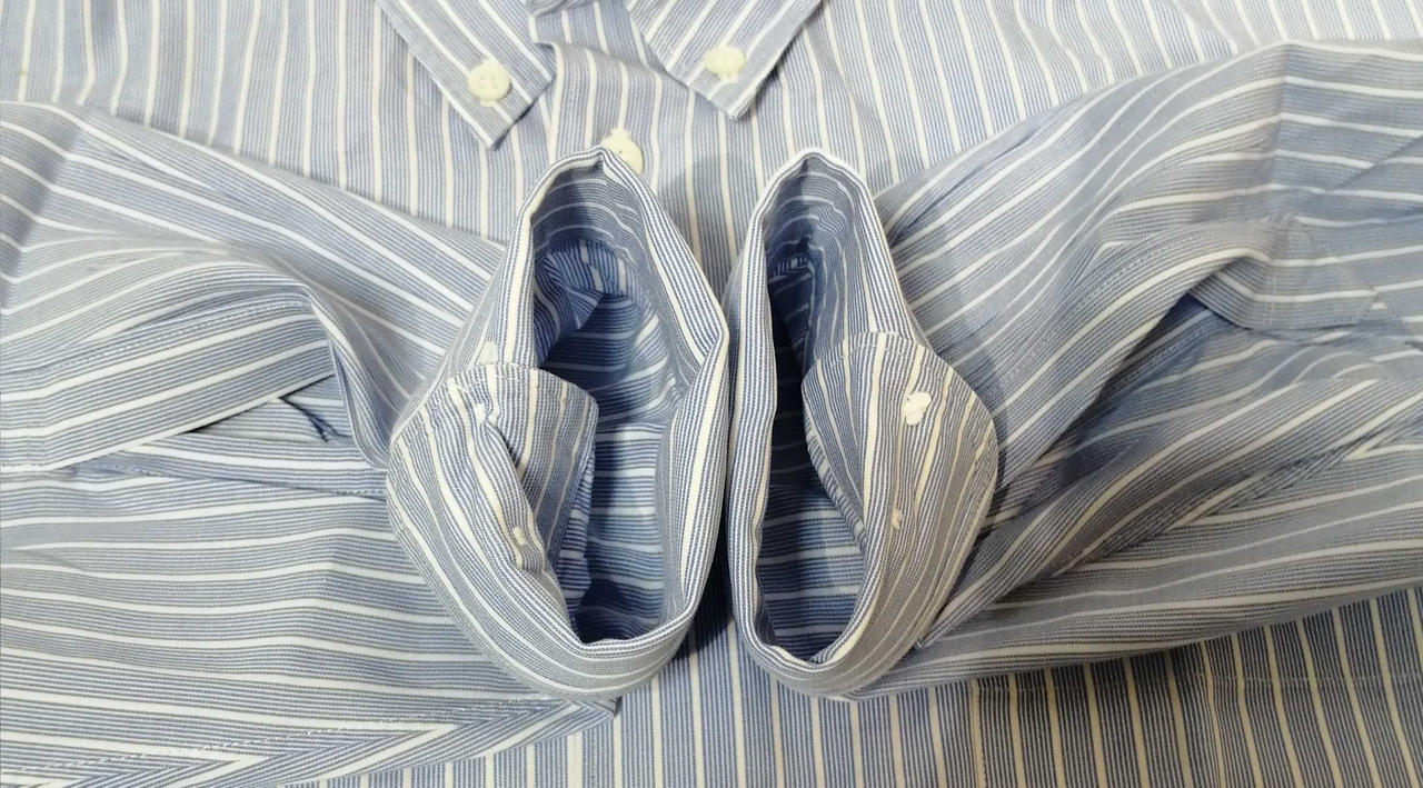 裾付近、胸ポケットにシミ汚れがございます。右袖後ろ側に小穴がございます。 |