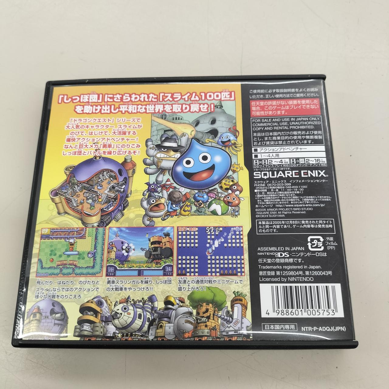 主人公スライムが、仲間をさらう「しっぽ団」から100匹のスライムを救出し、超巨大メカ「勇車」を操作して敵の大戦車と砲撃バトルを繰り広げます |