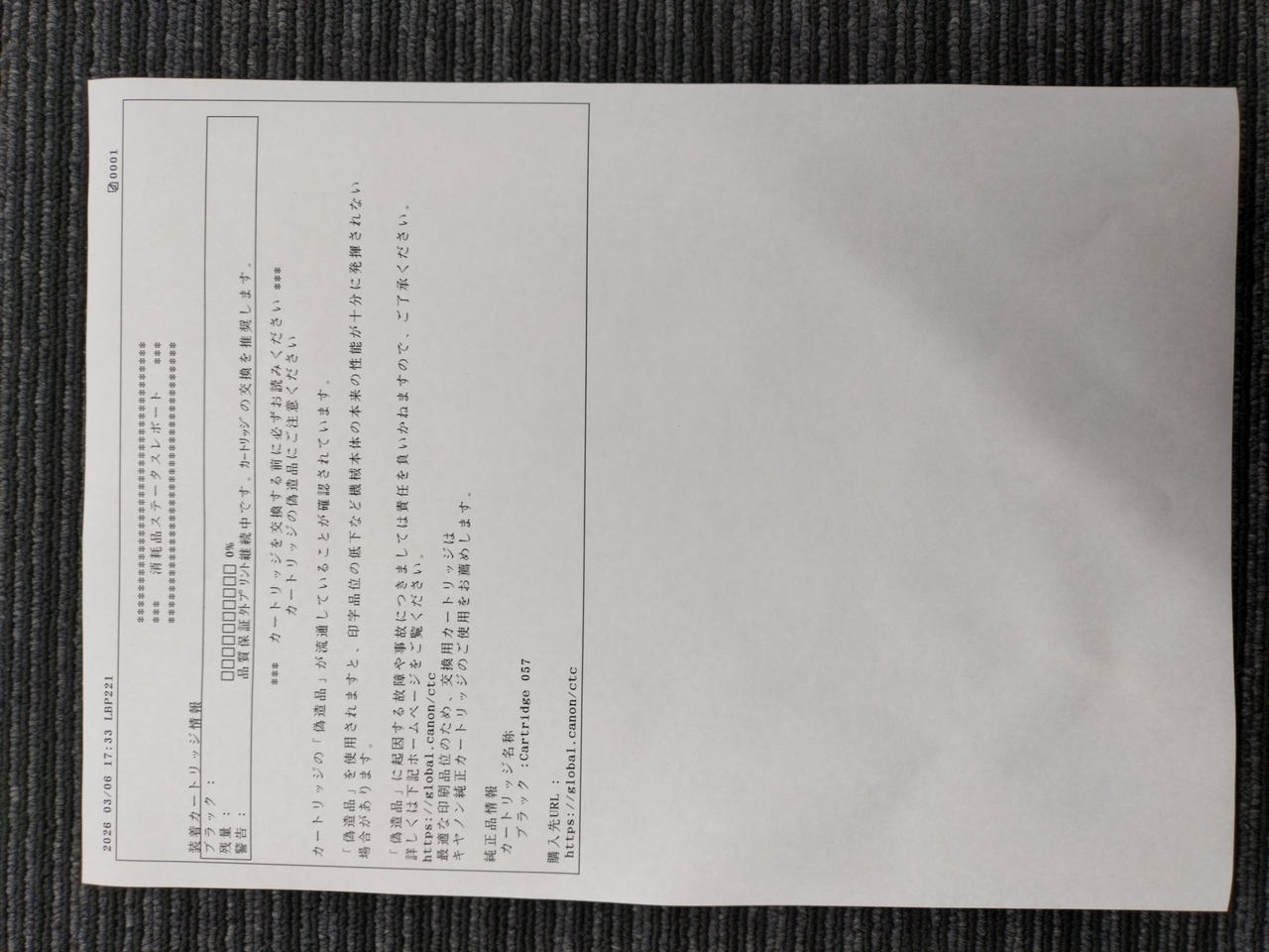カートリッジ残量0です。印字未チェックの為ジャンク品での扱いになります。 |