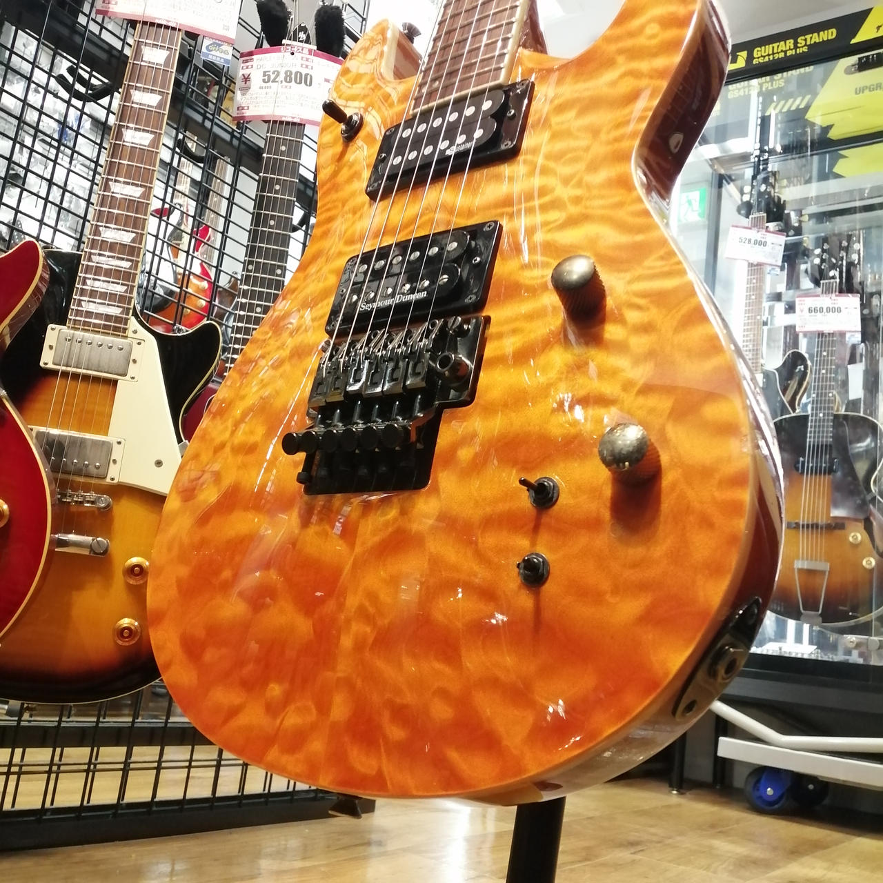 メイプルトップ、マホガニーボディ、マホガニーネック、ローズウッド指板、Seymour Duncanピックアップ。 |