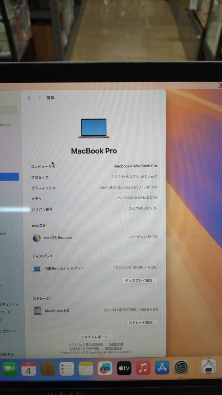第9世代2.6GHz 6コアIntel Core i7プロセッサーと256GB SSDを搭載した15.4型MacBook Pro |