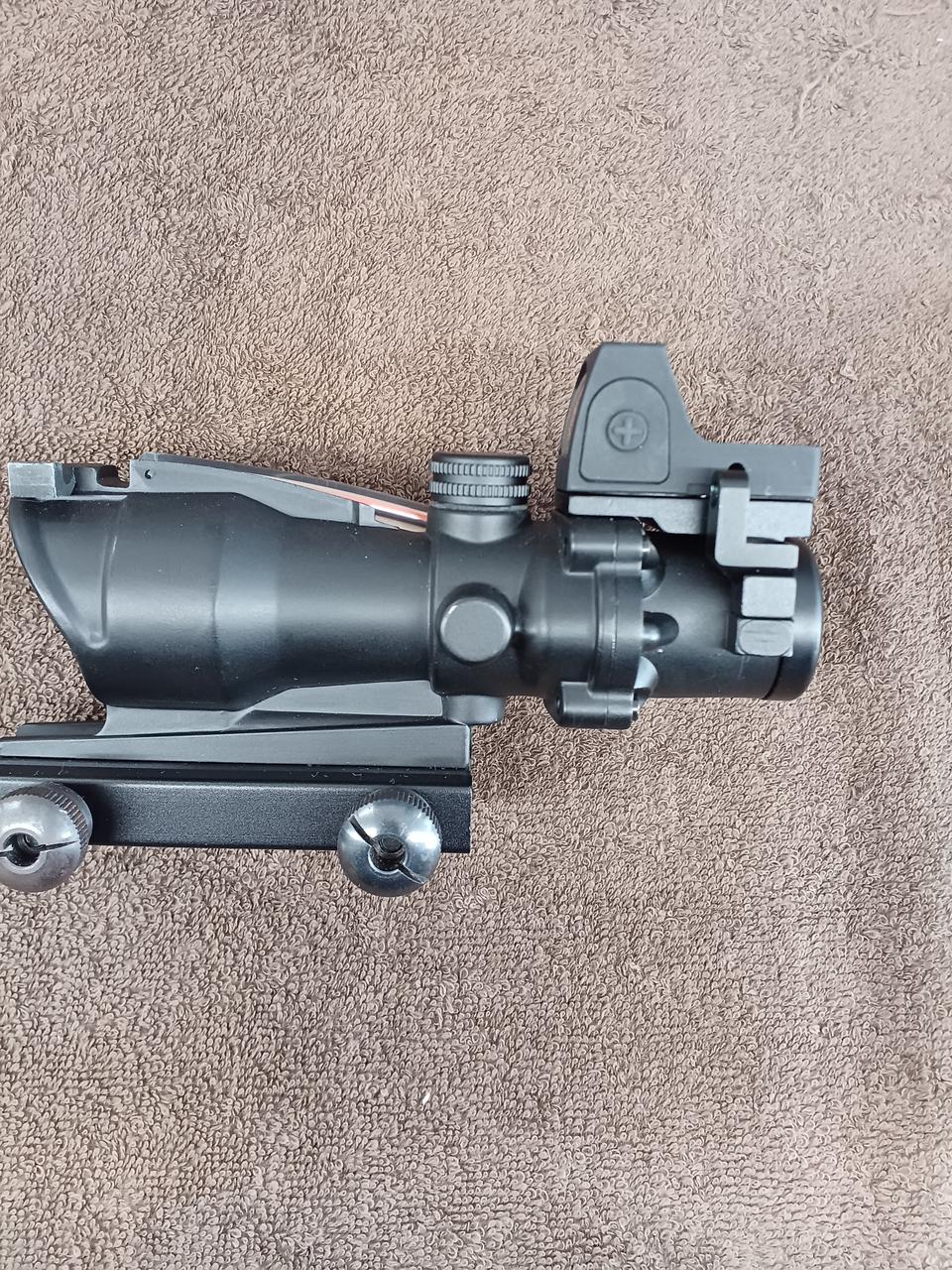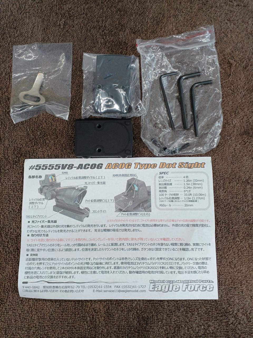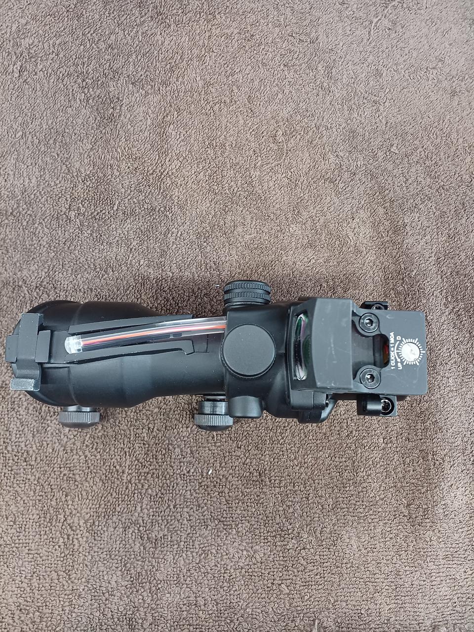 このモデルは米軍で採用されている「Trijicon ACOG TA31」の外観を再現しており、上部の集光ファイバーによって電池無しでレティクルを発光させる仕組みを備えているのが特徴です。