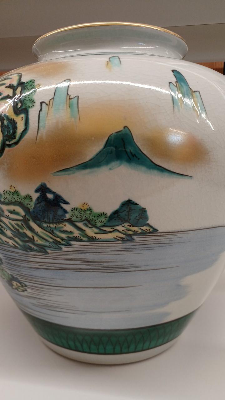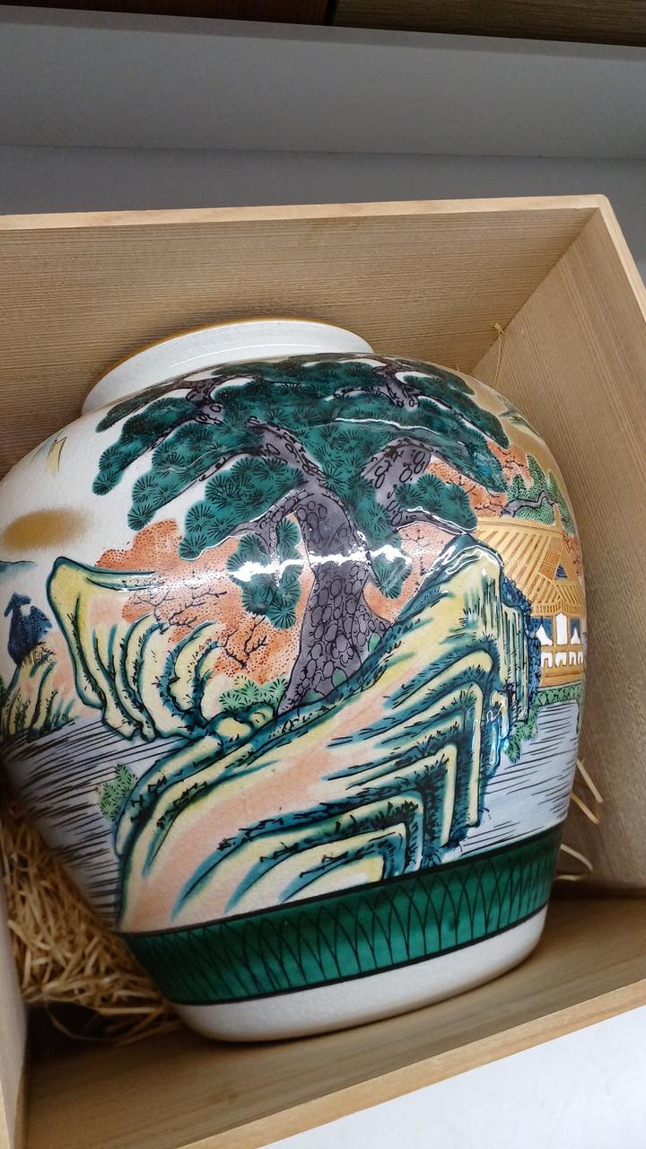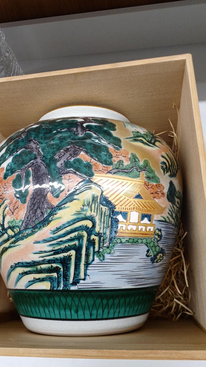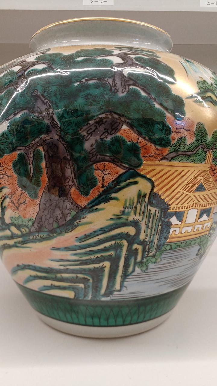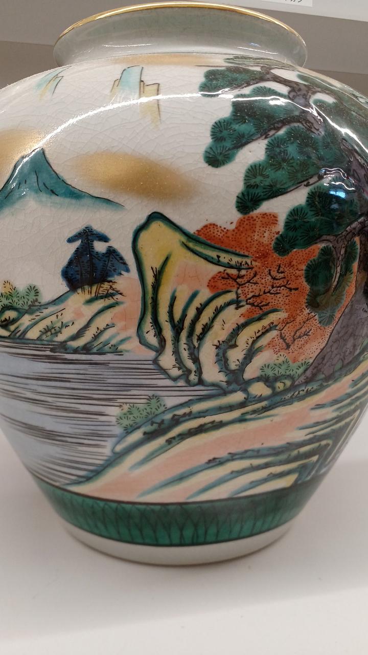 力強い松の木と風景が描かれた金彩が豪華で印象的な壺です!