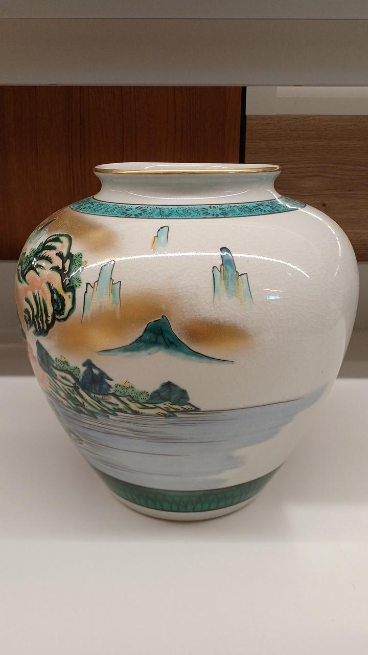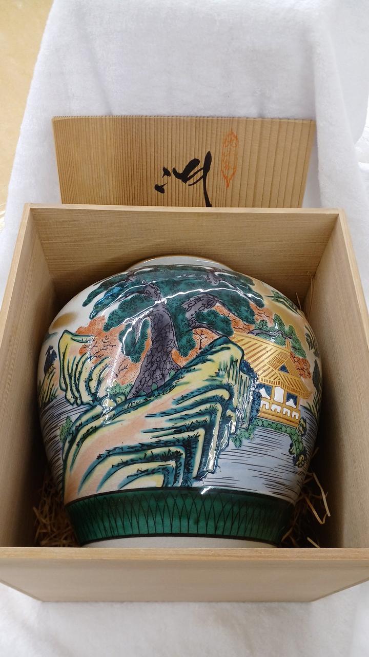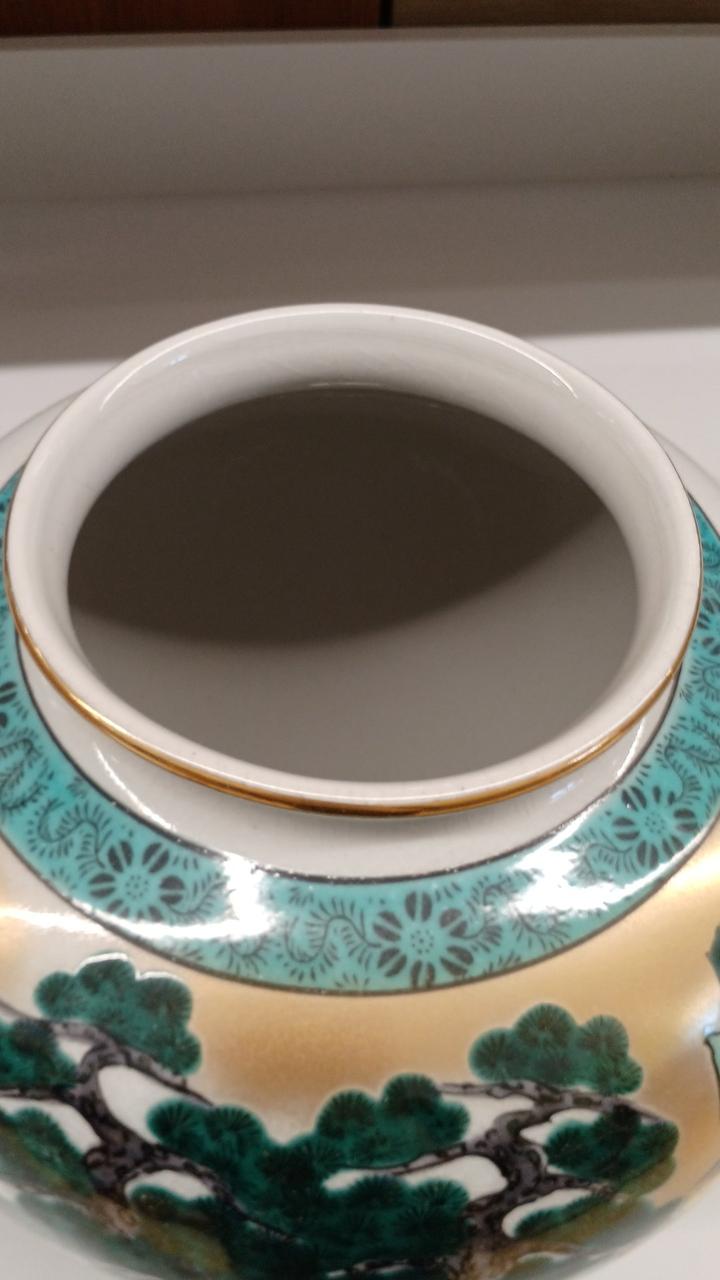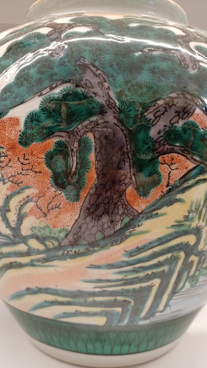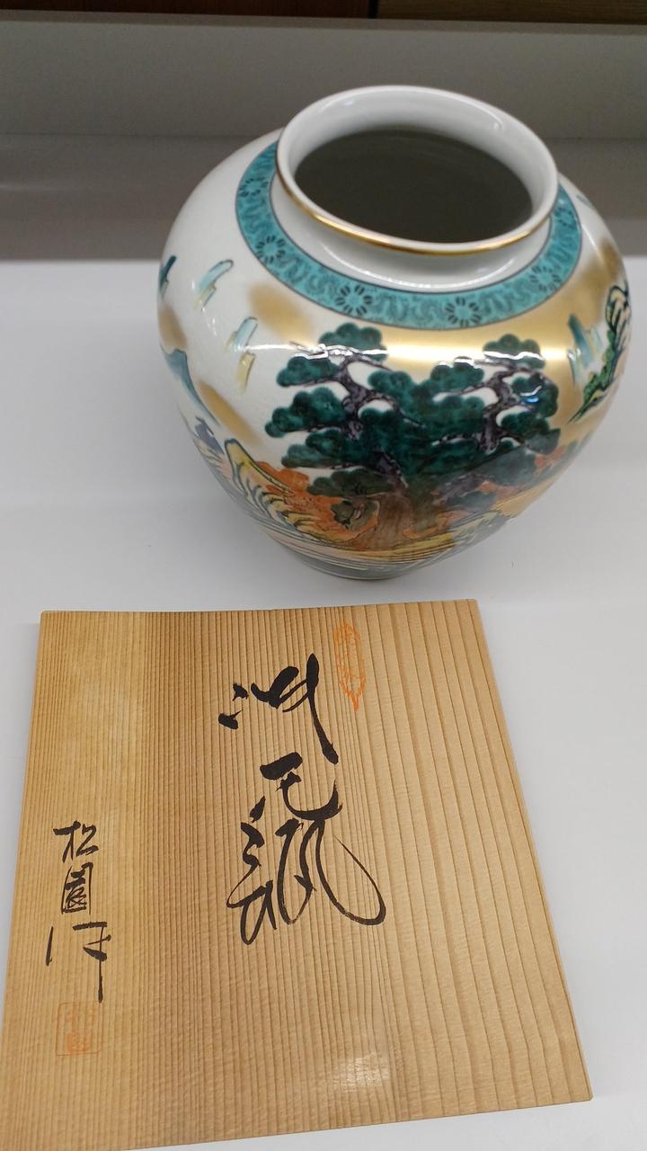 力強い松の木と風景が描かれた金彩が豪華で印象的な壺です!