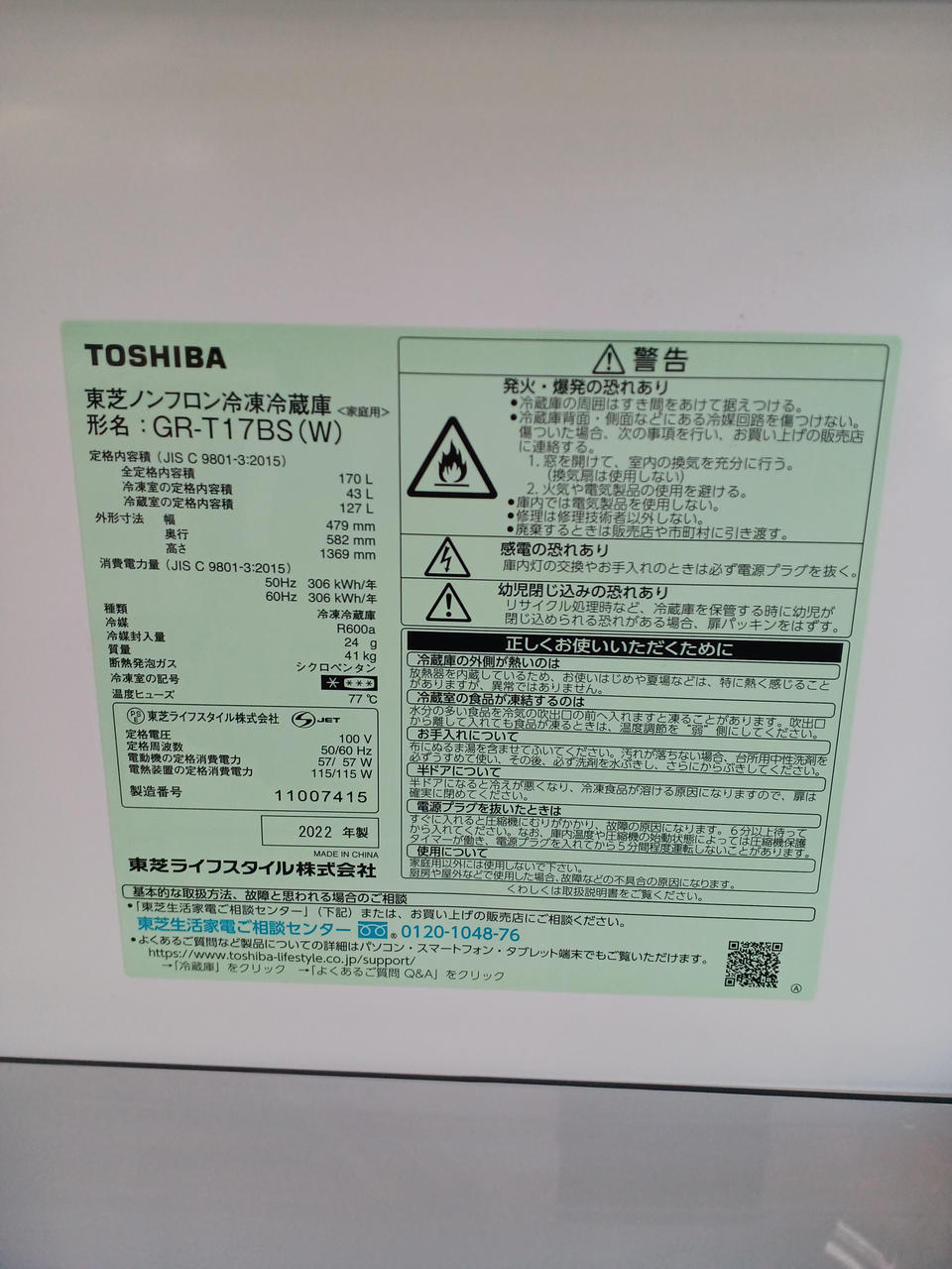 定格内容積:170L(冷蔵室127L・冷凍室43L) |