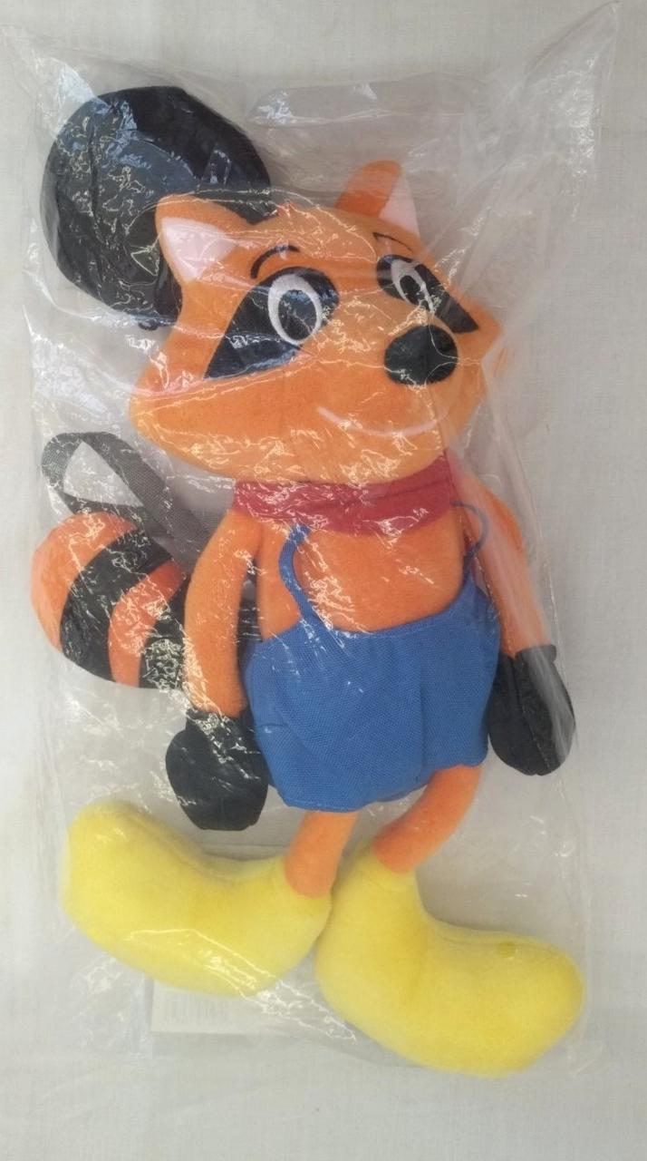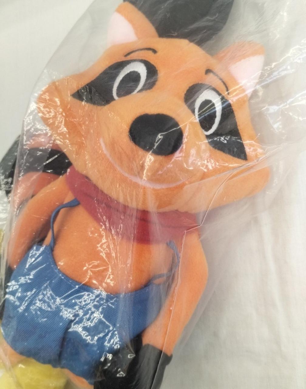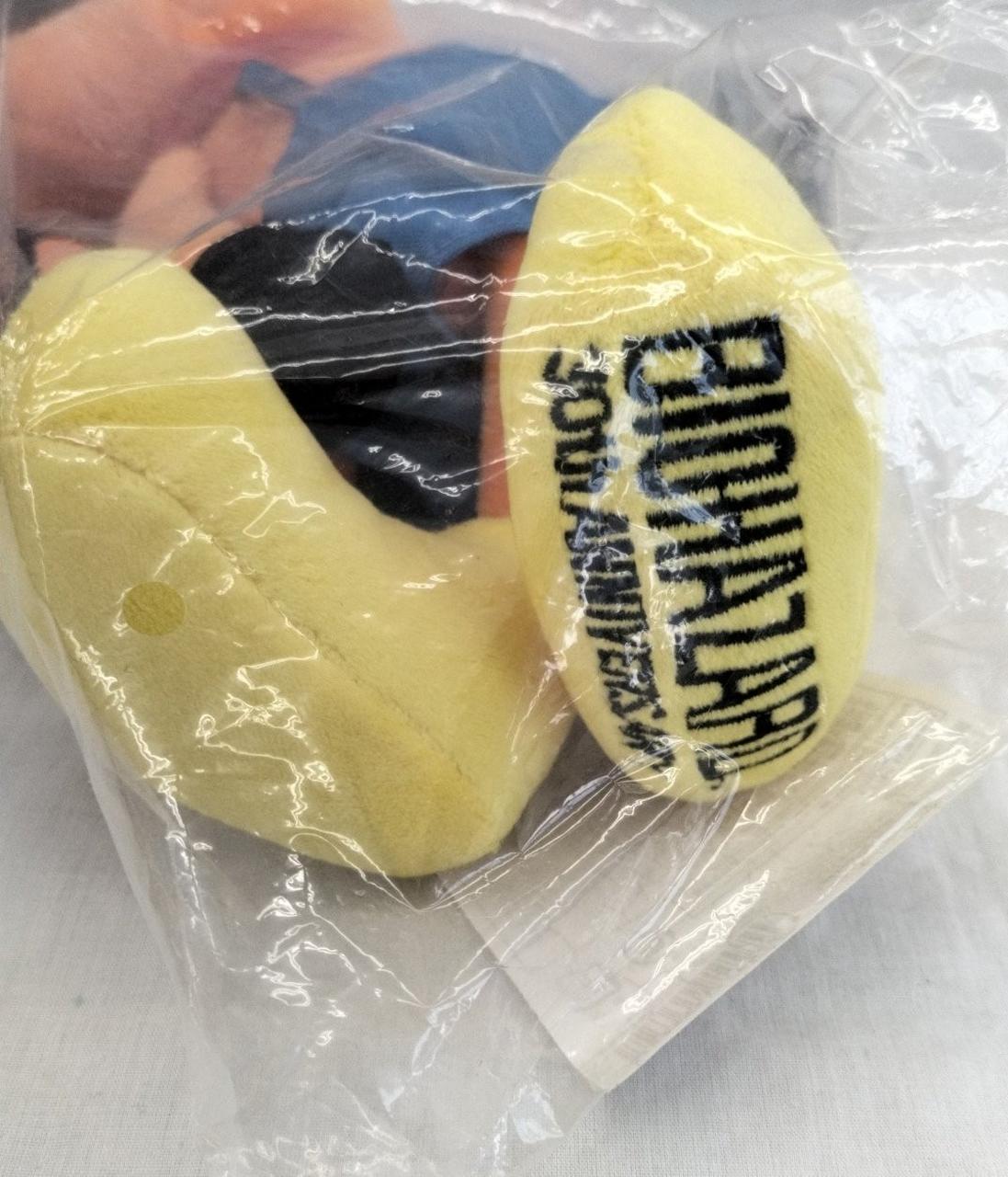 足裏やポーチに周年ロゴをあしらった、ラクーンくんのぬいぐるみです。 |