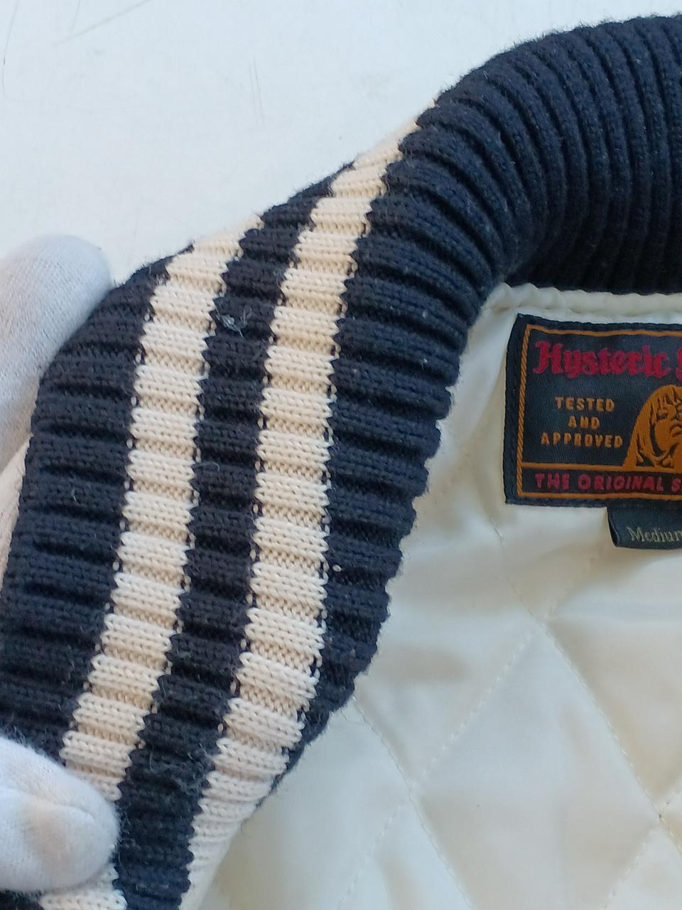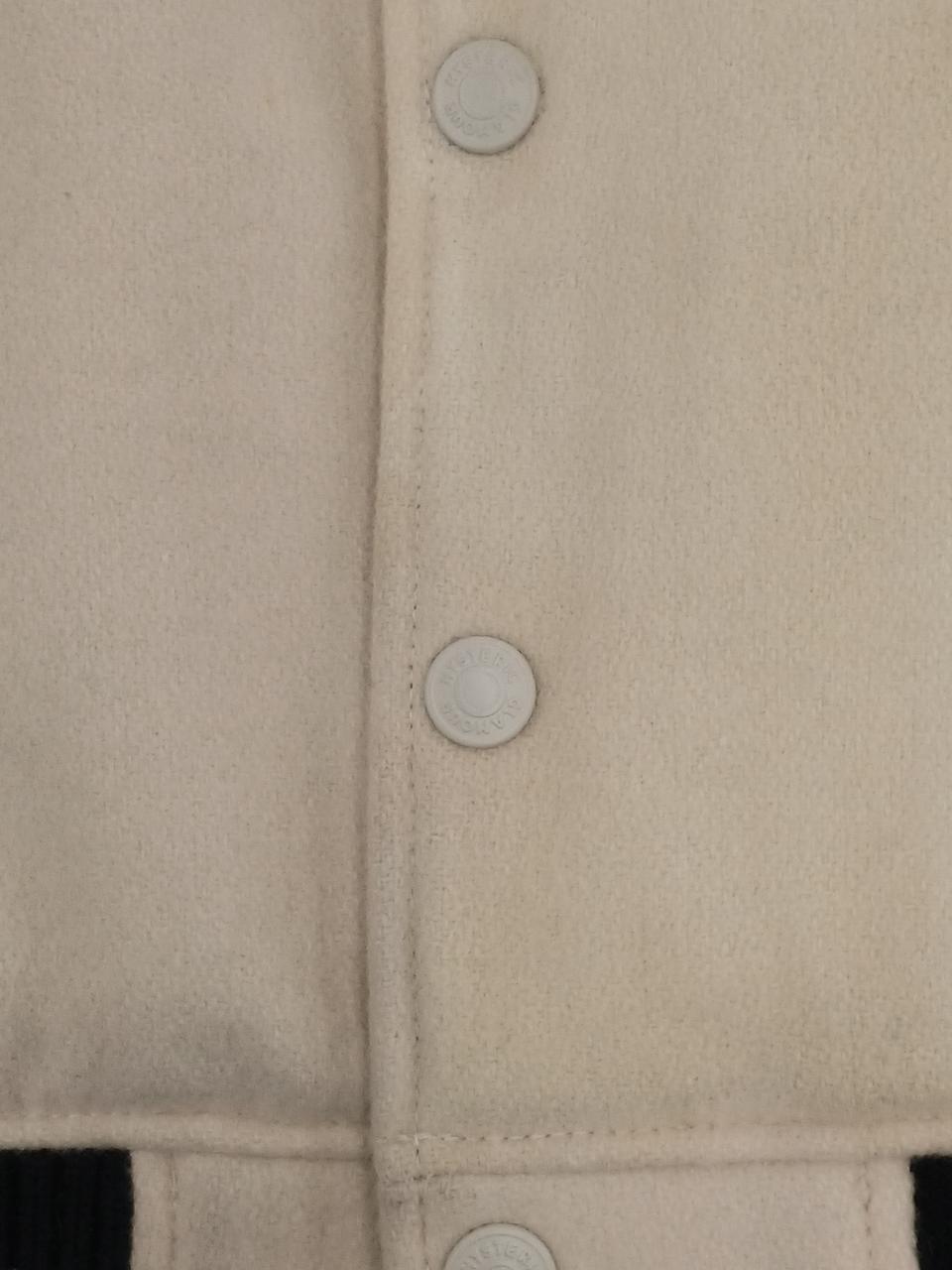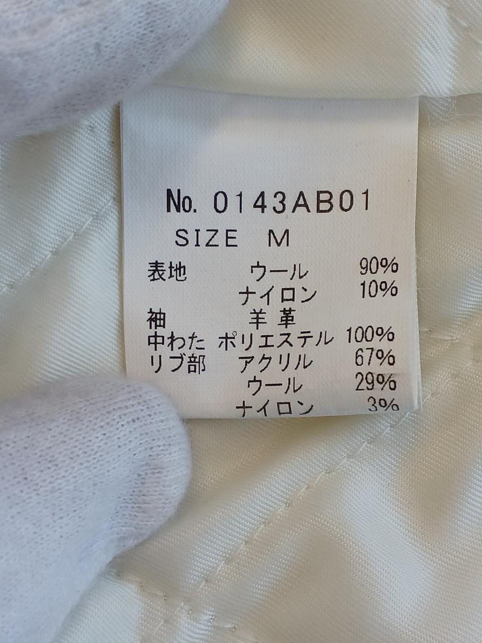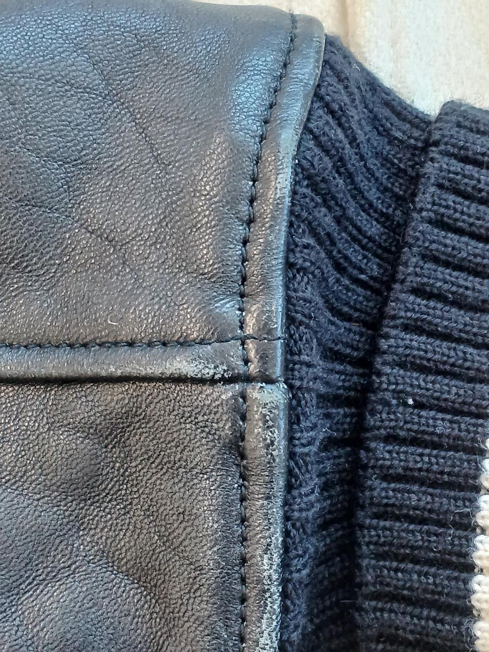 左前身頃の下部全体に変色有。ポケット周囲と、両脇の下に革の色移りあり。左ポケットの革部にほつれあり。右前身頃に虫食い一ヶ所あり。 |