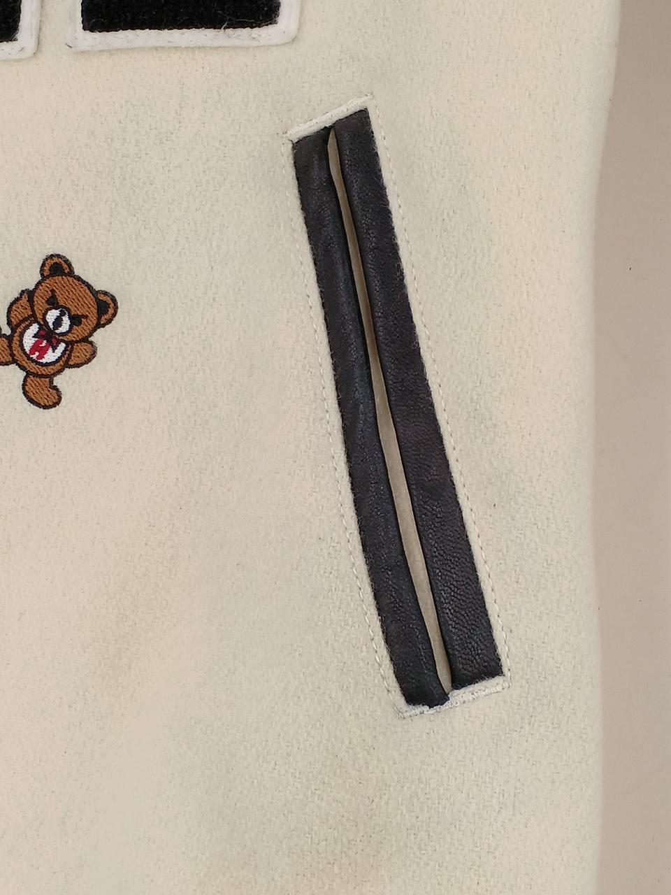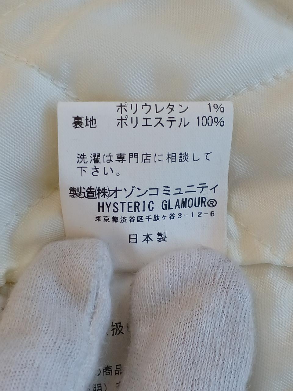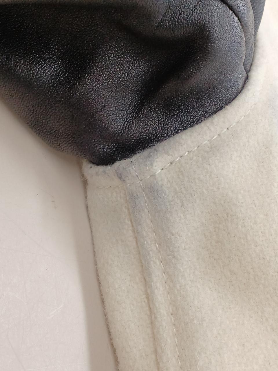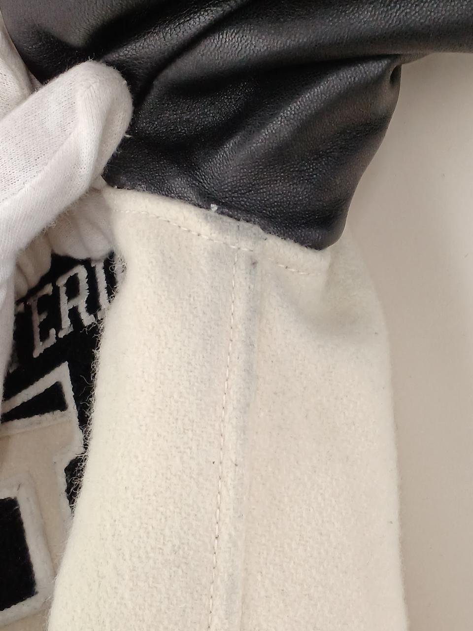 左前身頃の下部全体に変色有。ポケット周囲と、両脇の下に革の色移りあり。左ポケットの革部にほつれあり。右前身頃に虫食い一ヶ所あり。 |