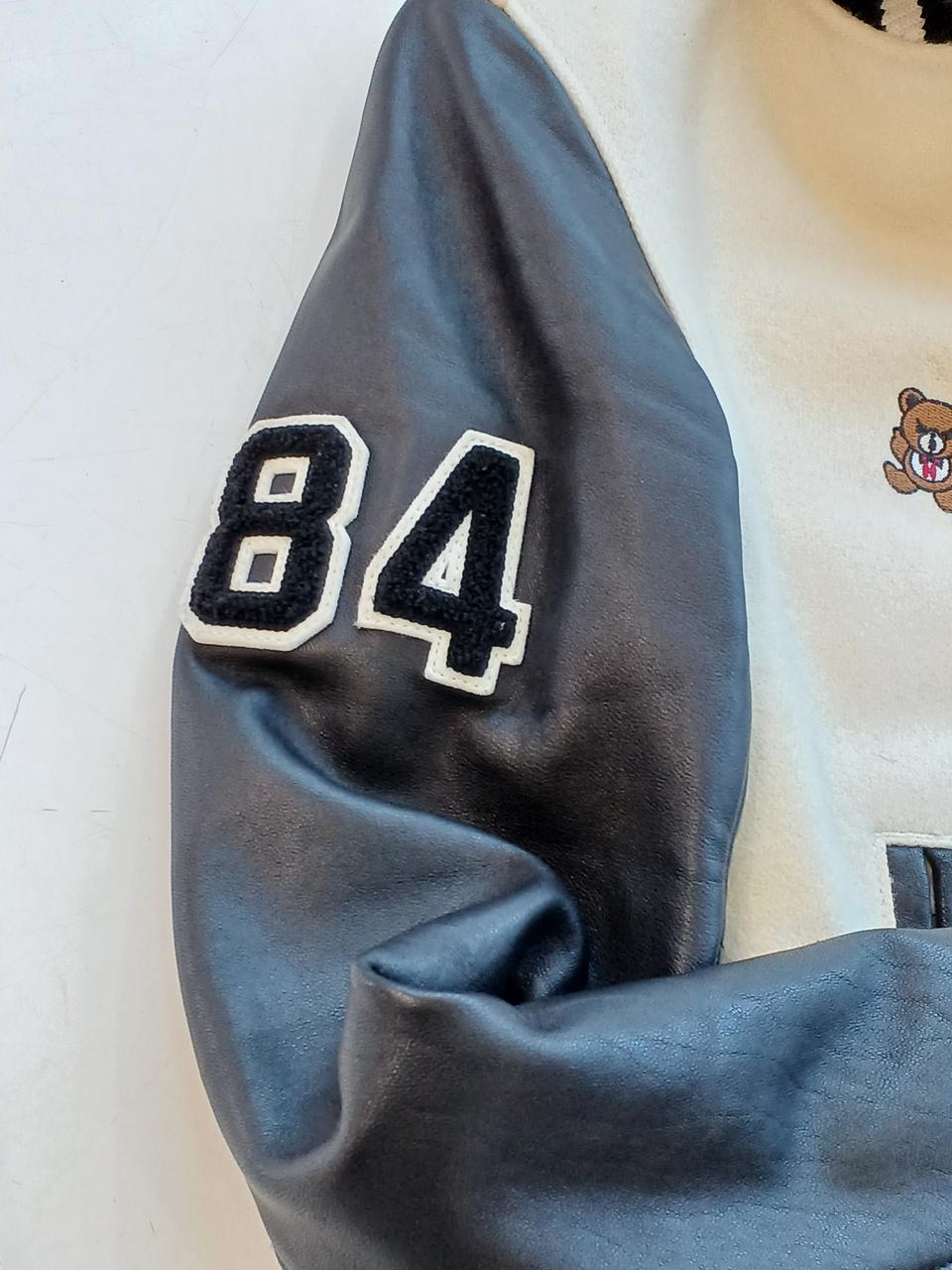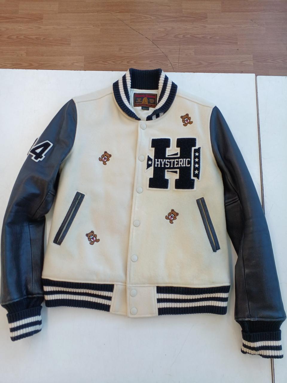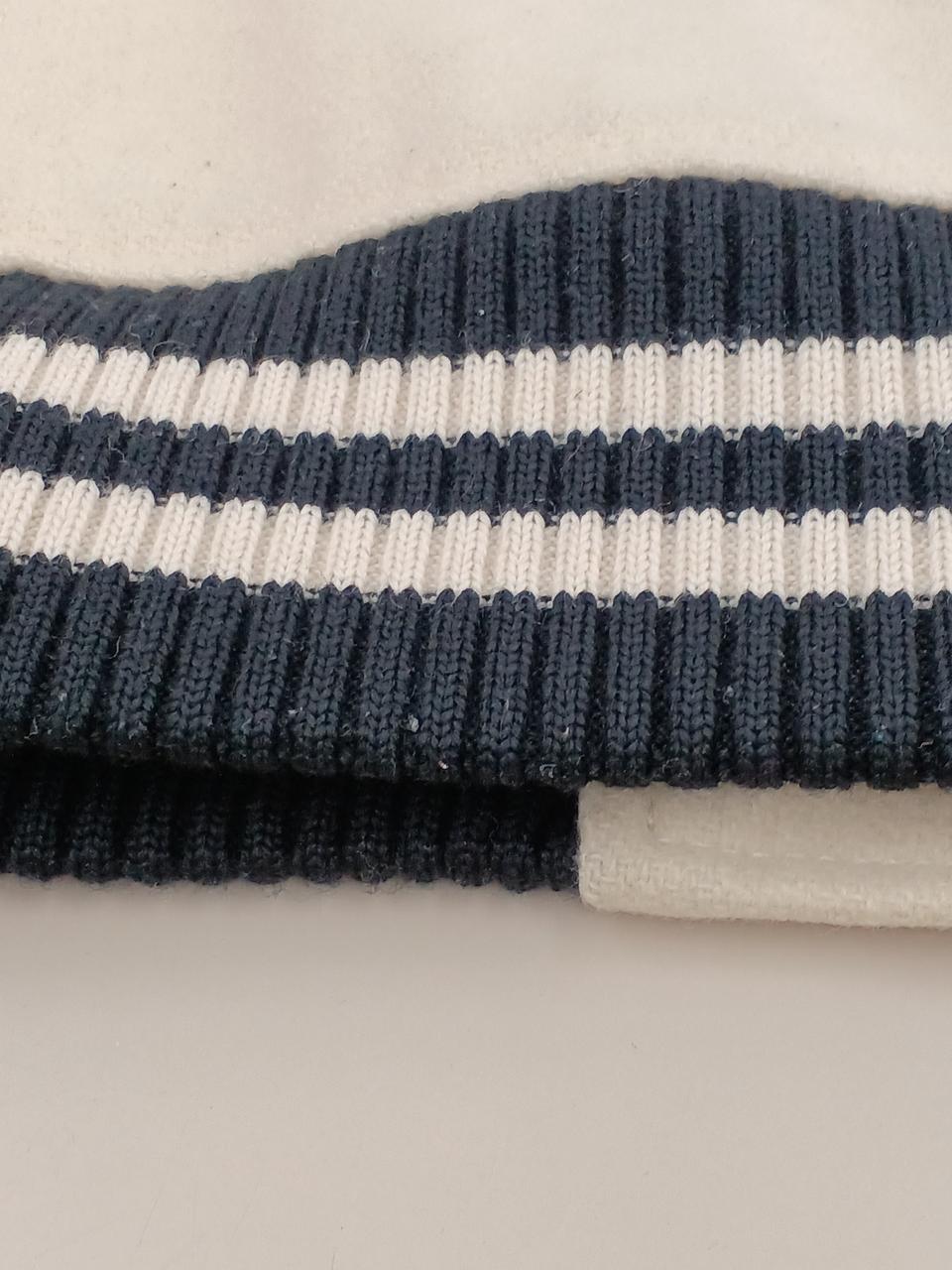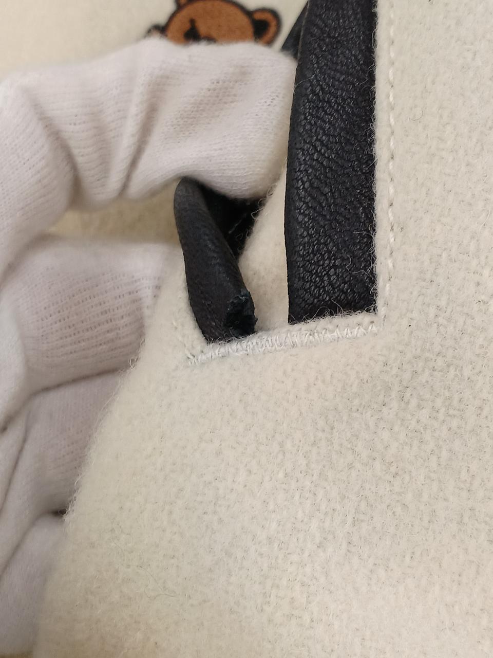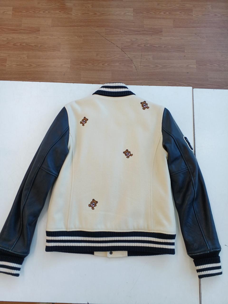 左前身頃の下部全体に変色有。ポケット周囲と、両脇の下に革の色移りあり。左ポケットの革部にほつれあり。右前身頃に虫食い一ヶ所あり。 |