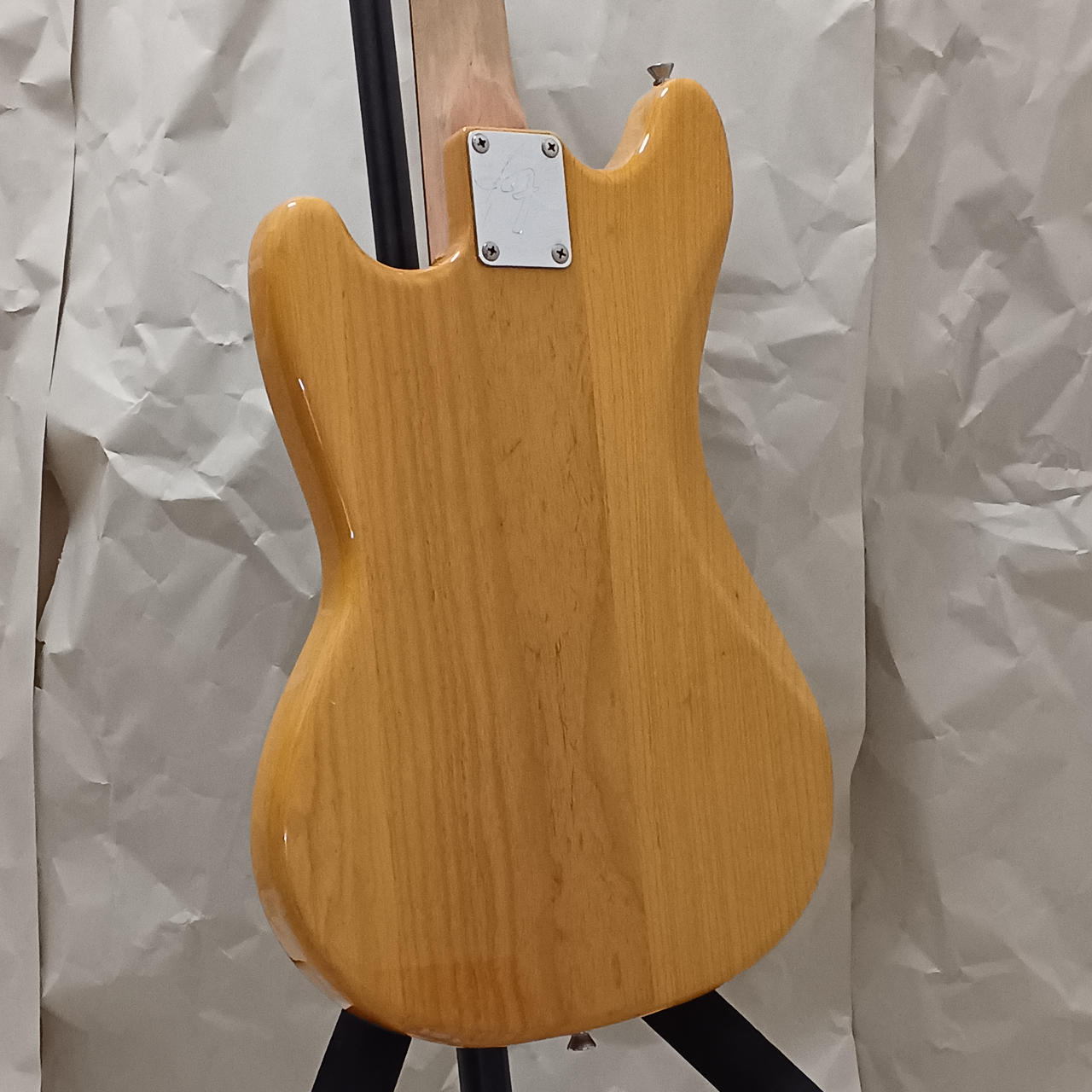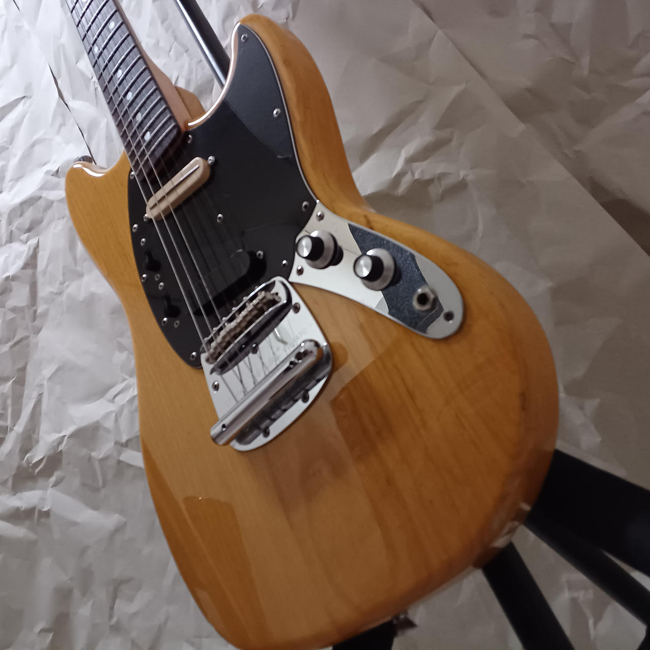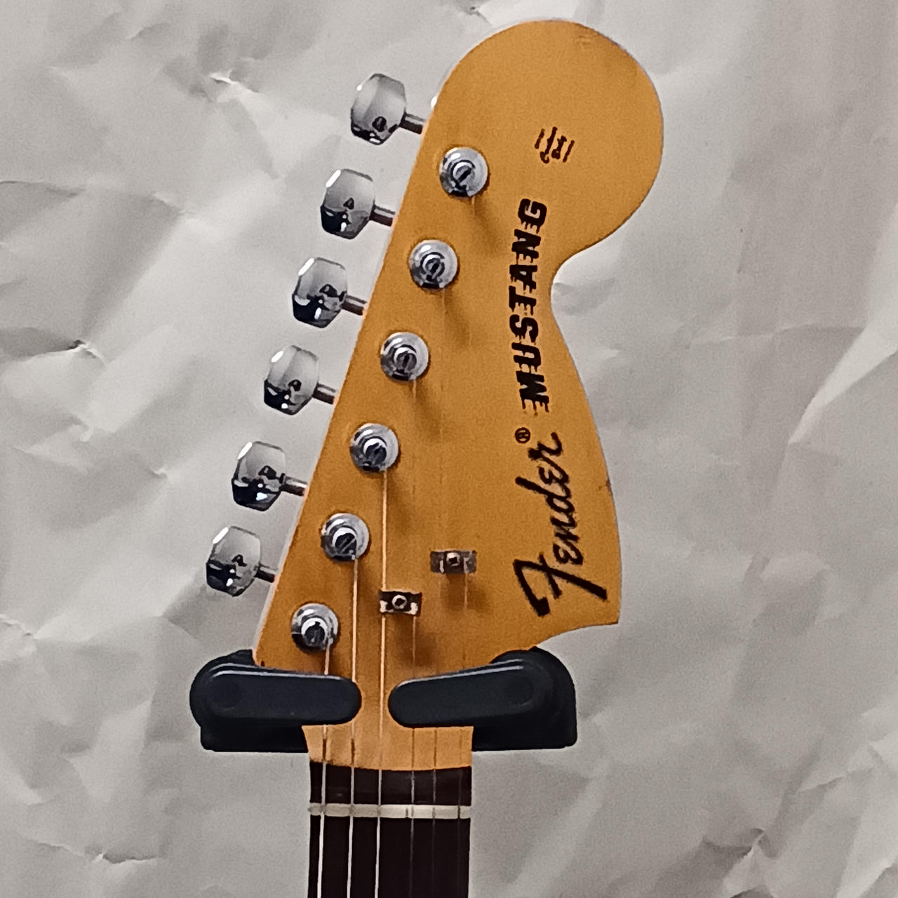 ネック塗装、ピックアップ交換、配線、ペグ交換等多数の改造が施されているムスタングです! |