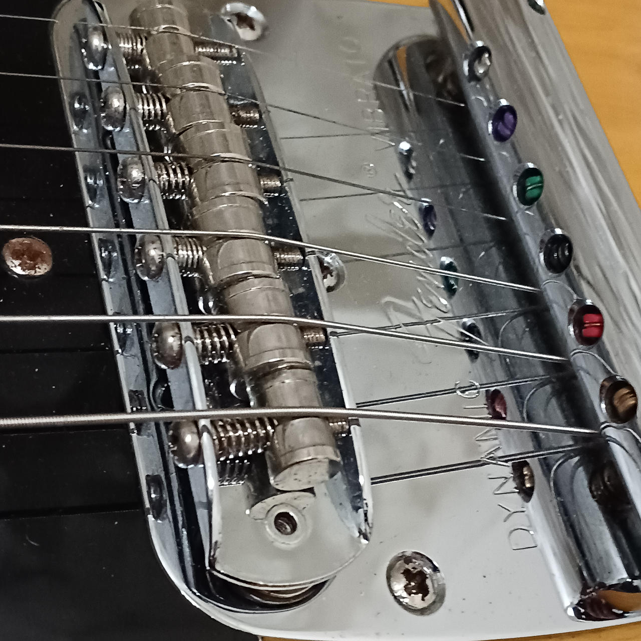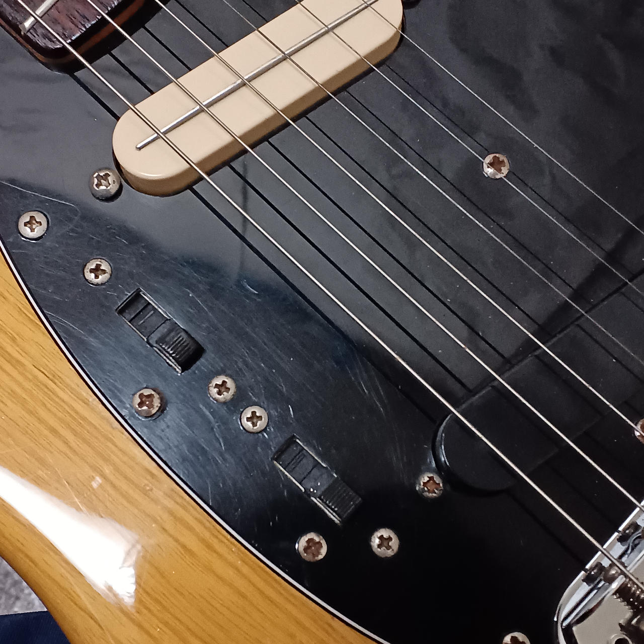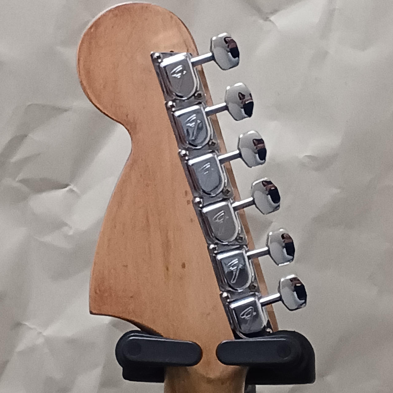 ネック塗装、ピックアップ交換、配線、ペグ交換等多数の改造が施されているムスタングです! |