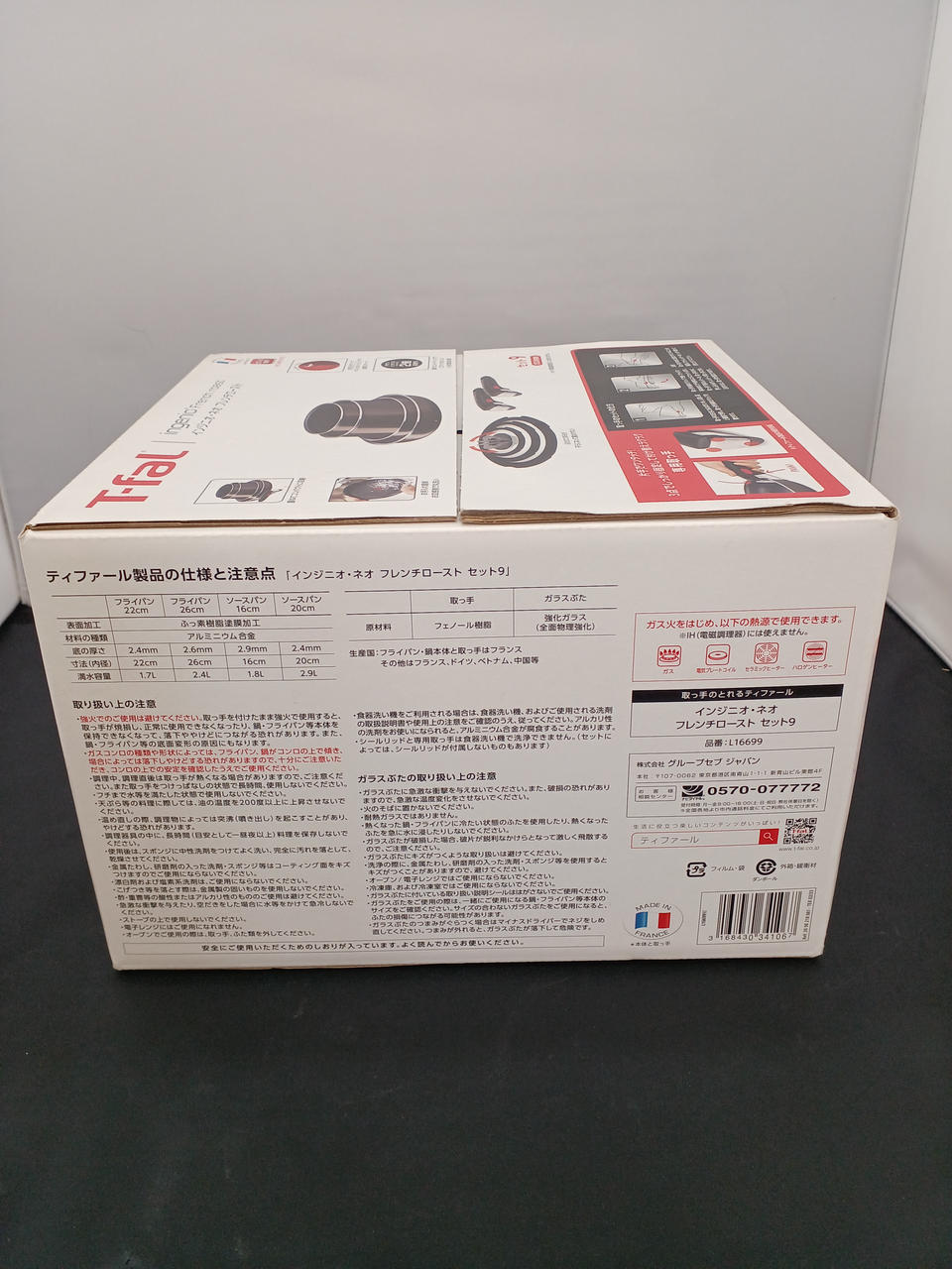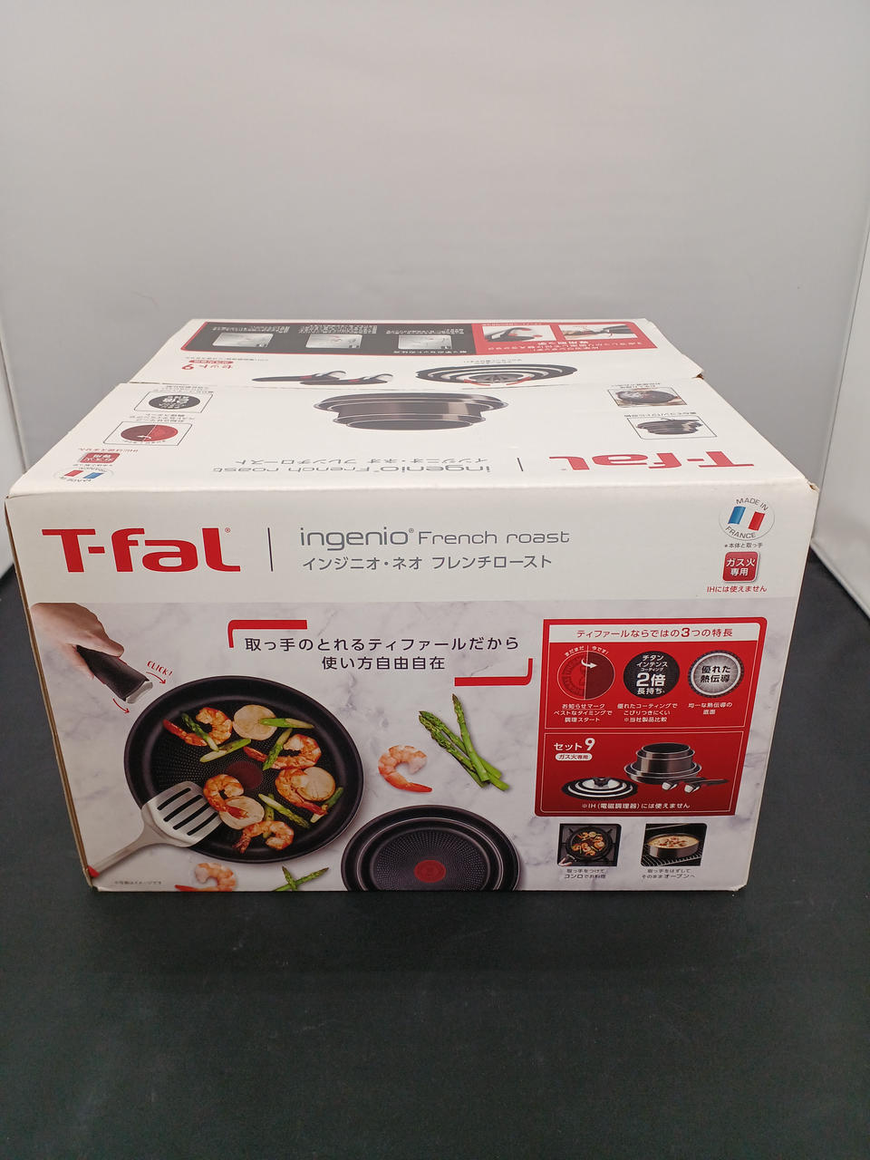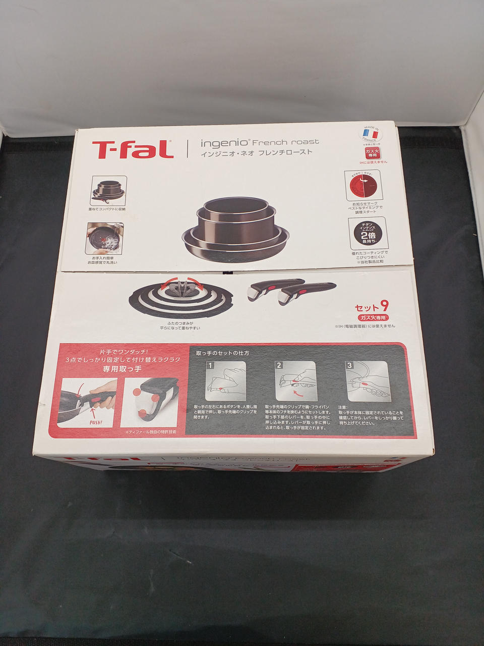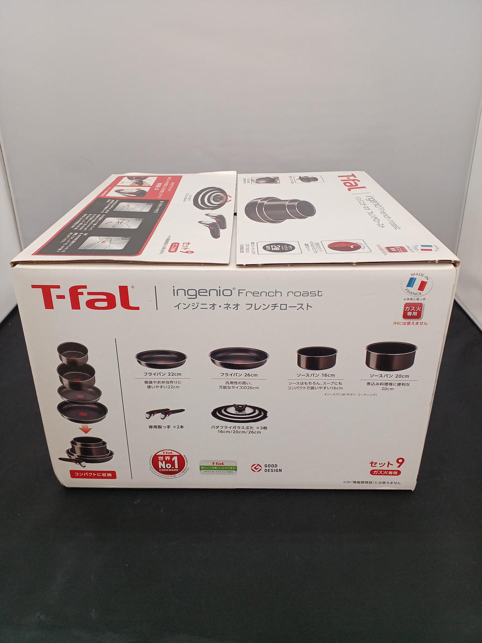 フライパン×2、ソースパン×2、専用取っ手×2、ガラス蓋×3の9点セット。 |