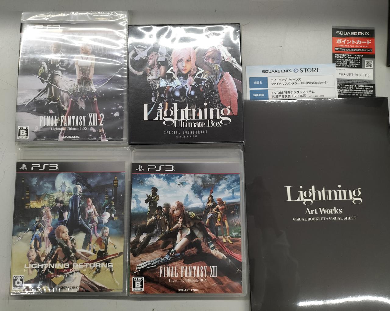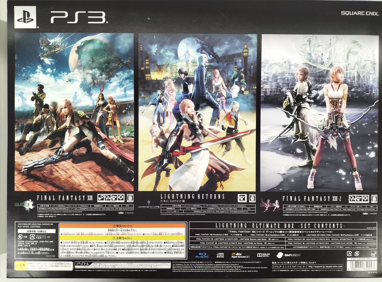 PS3 FF XIII シリーズ 第1作、第2作、第3作とサントラ、アートワーク、ディスク用アクリルケースに主人公・ライトニングのフィギュア(PLAY ARTS改)が付属。第1作開封済みです、他ソフトとサントラ、アートワーク未開封 |