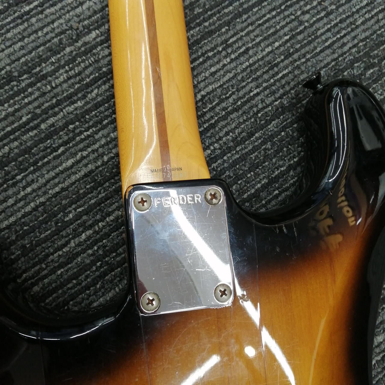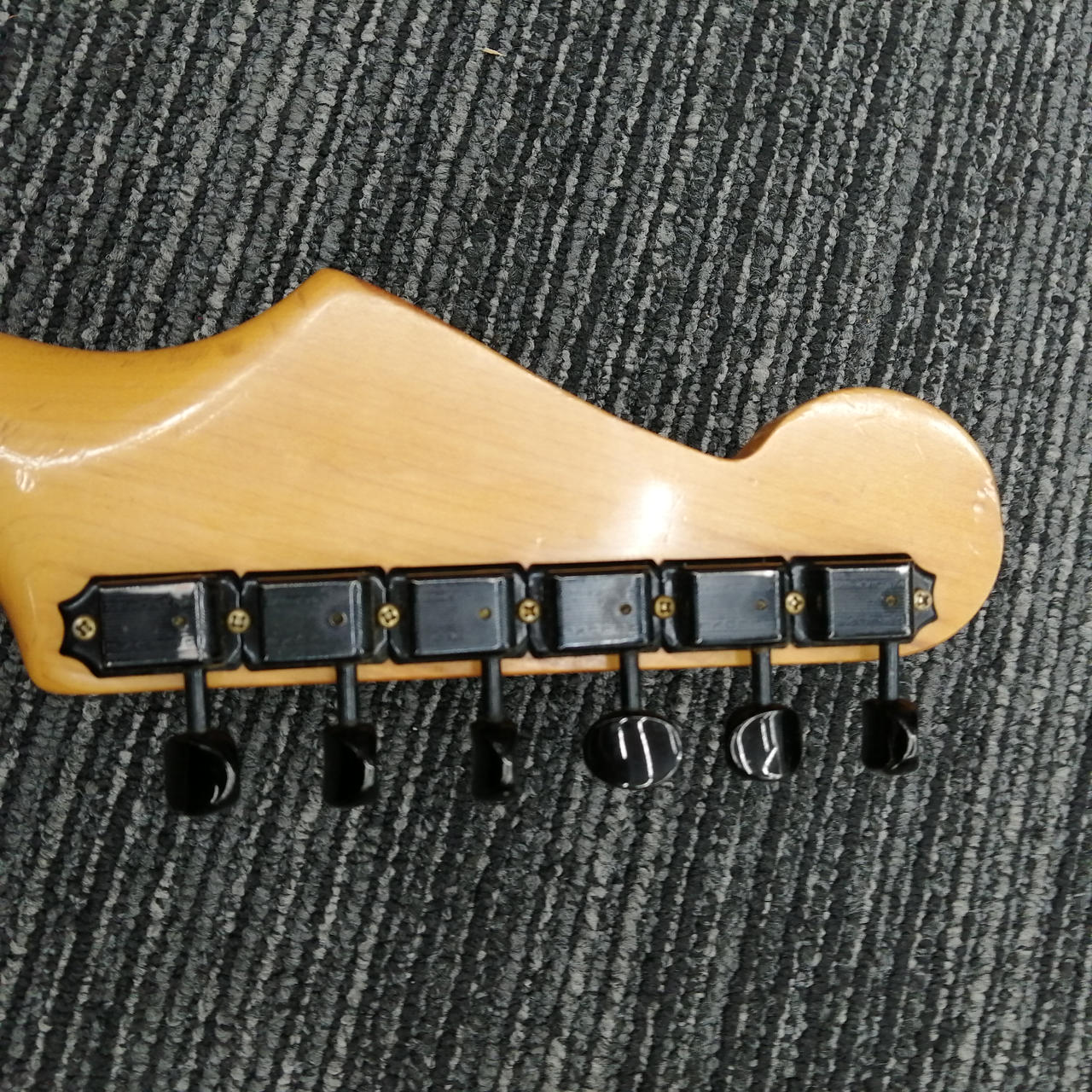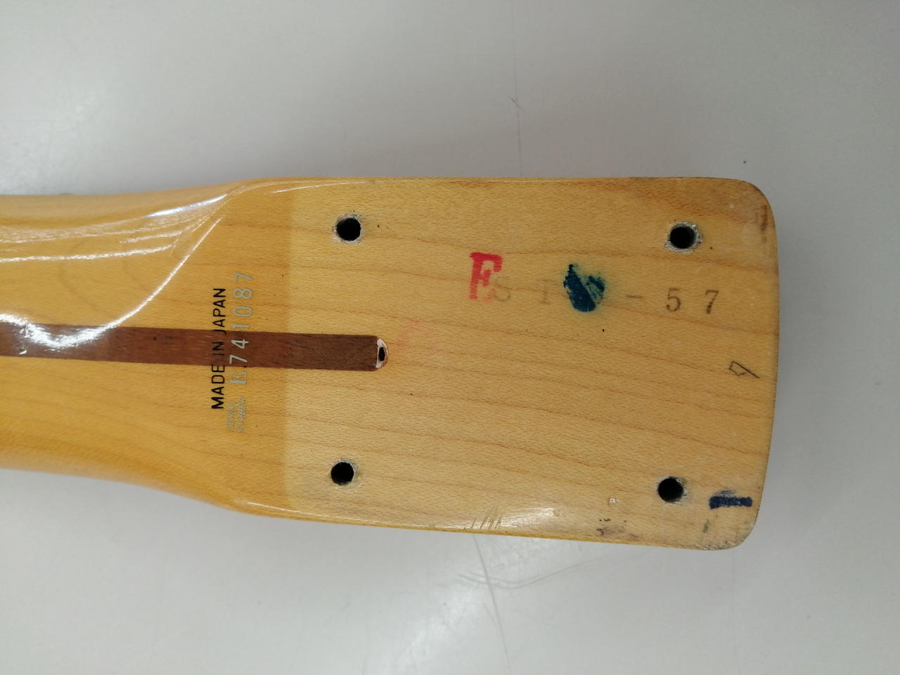 ボディのネック裏に赤色の「S」マークが刻印されています。良い木材の証? |