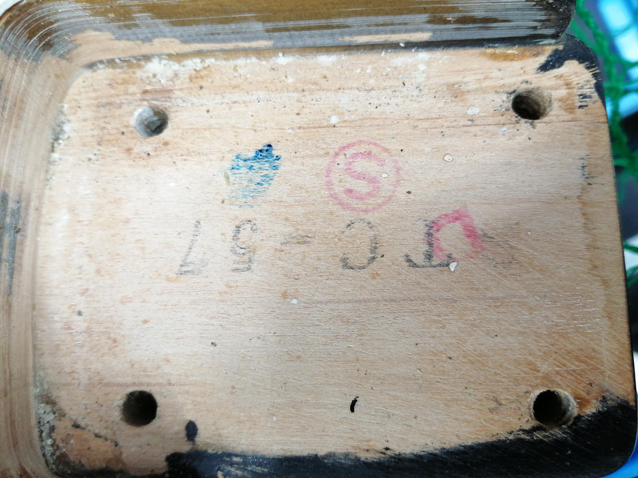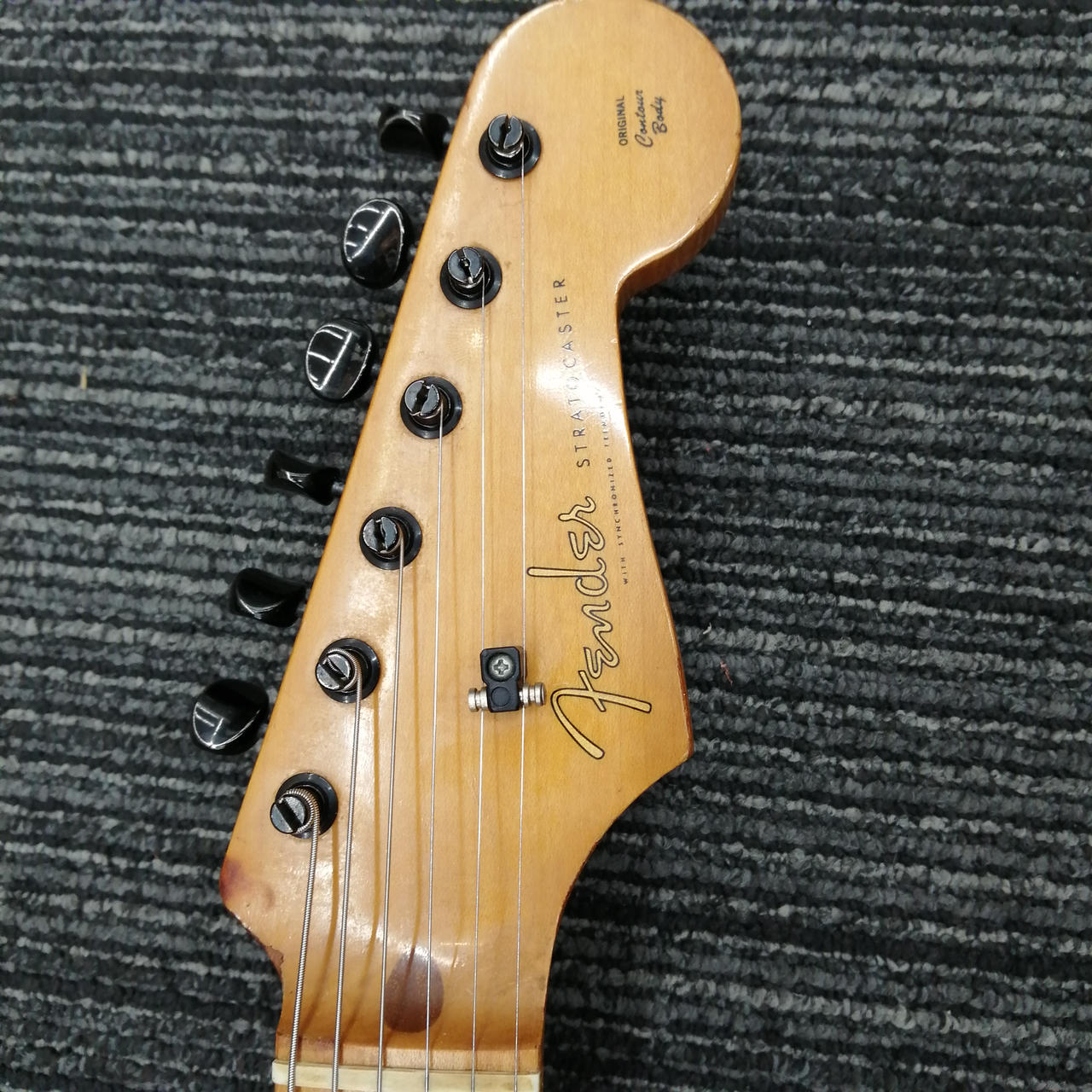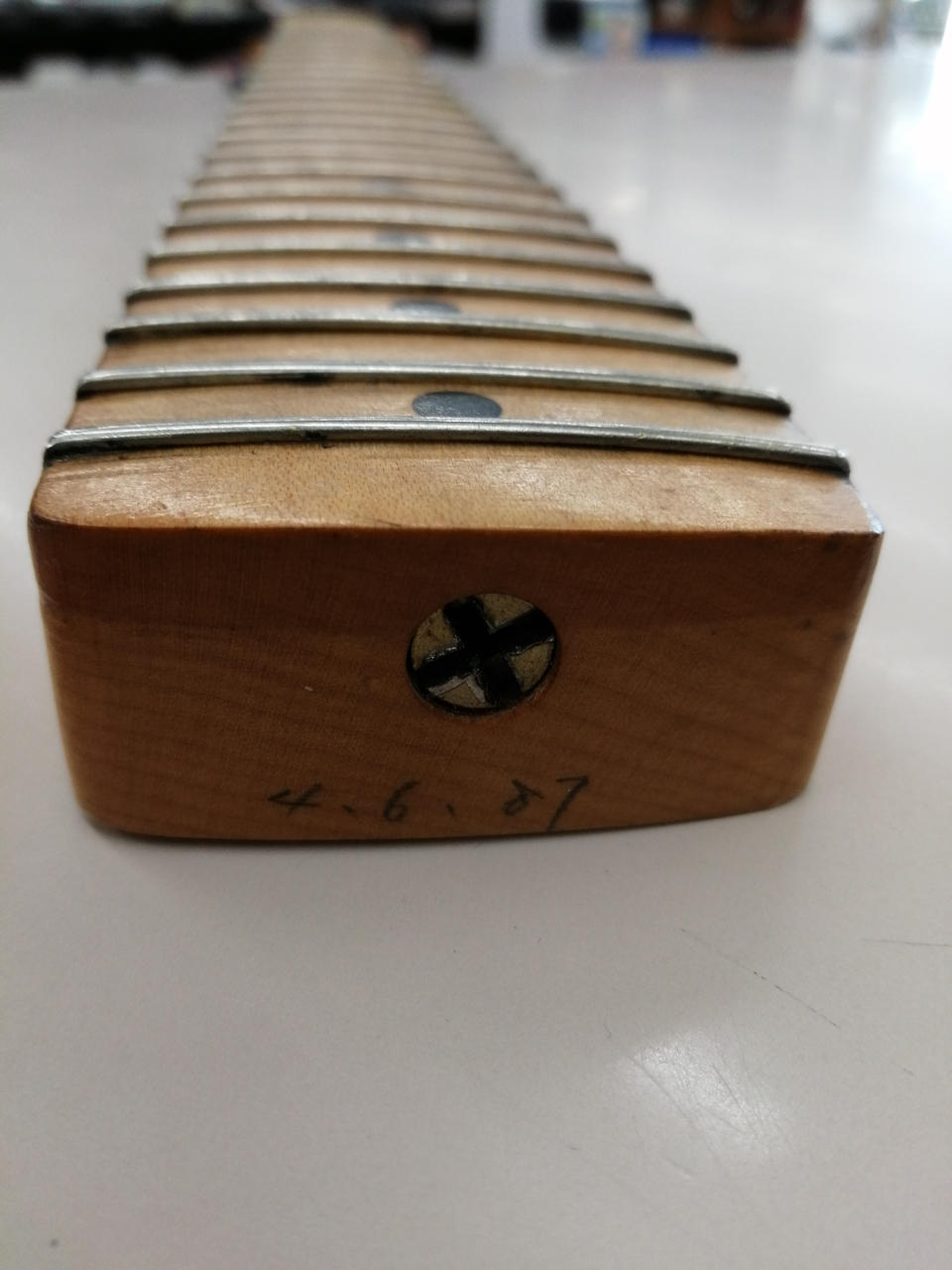 ボディのネック裏に赤色の「S」マークが刻印されています。良い木材の証? |