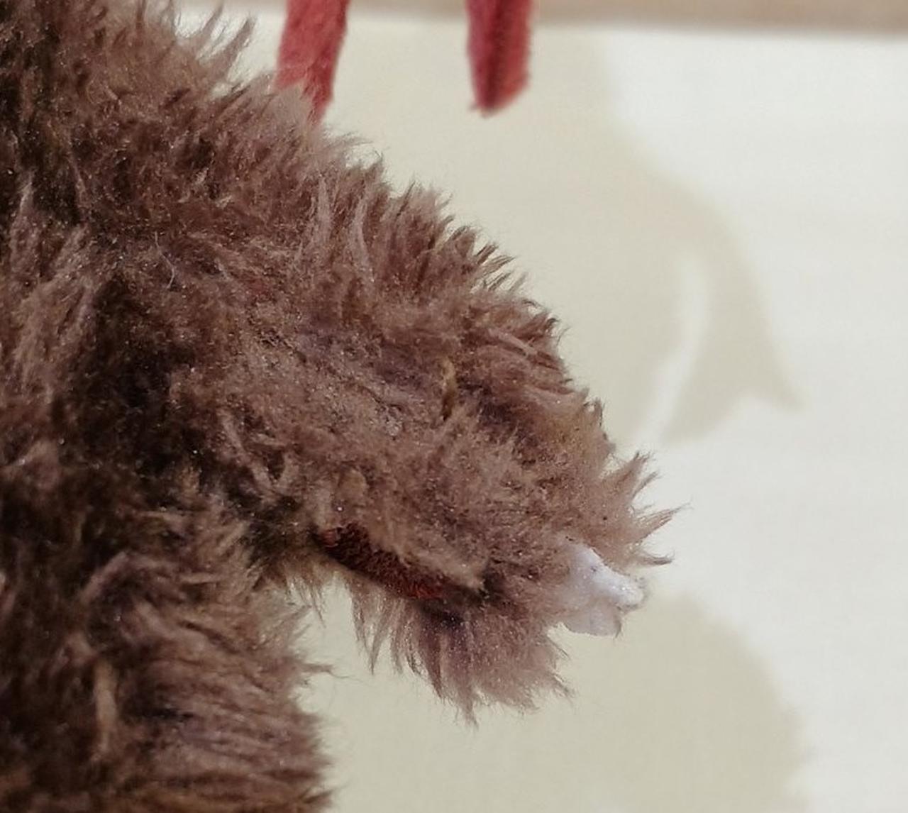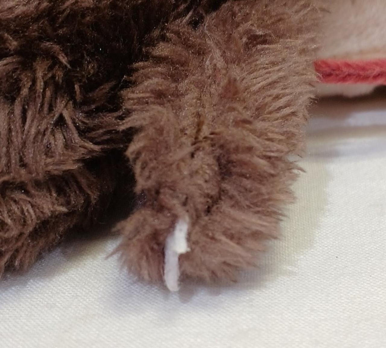 髪の毛、右手の後ろ側から糸が出ています。
