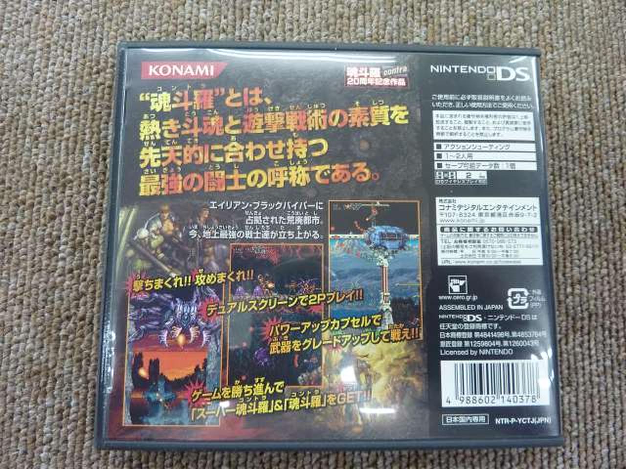 シリーズ原点回帰の硬派アクション!『魂斗羅』『スーパー魂斗羅』『魂斗羅スピリッツ』を強く意識した構成で、大量のザコ敵を撃ちまくる爽快感が復活!!DSならではの“2画面縦長ステージ”上下2画面を貫く縦長ステージが特徴的で、敵弾が上下から飛んでくる独特の緊張感がある。 |